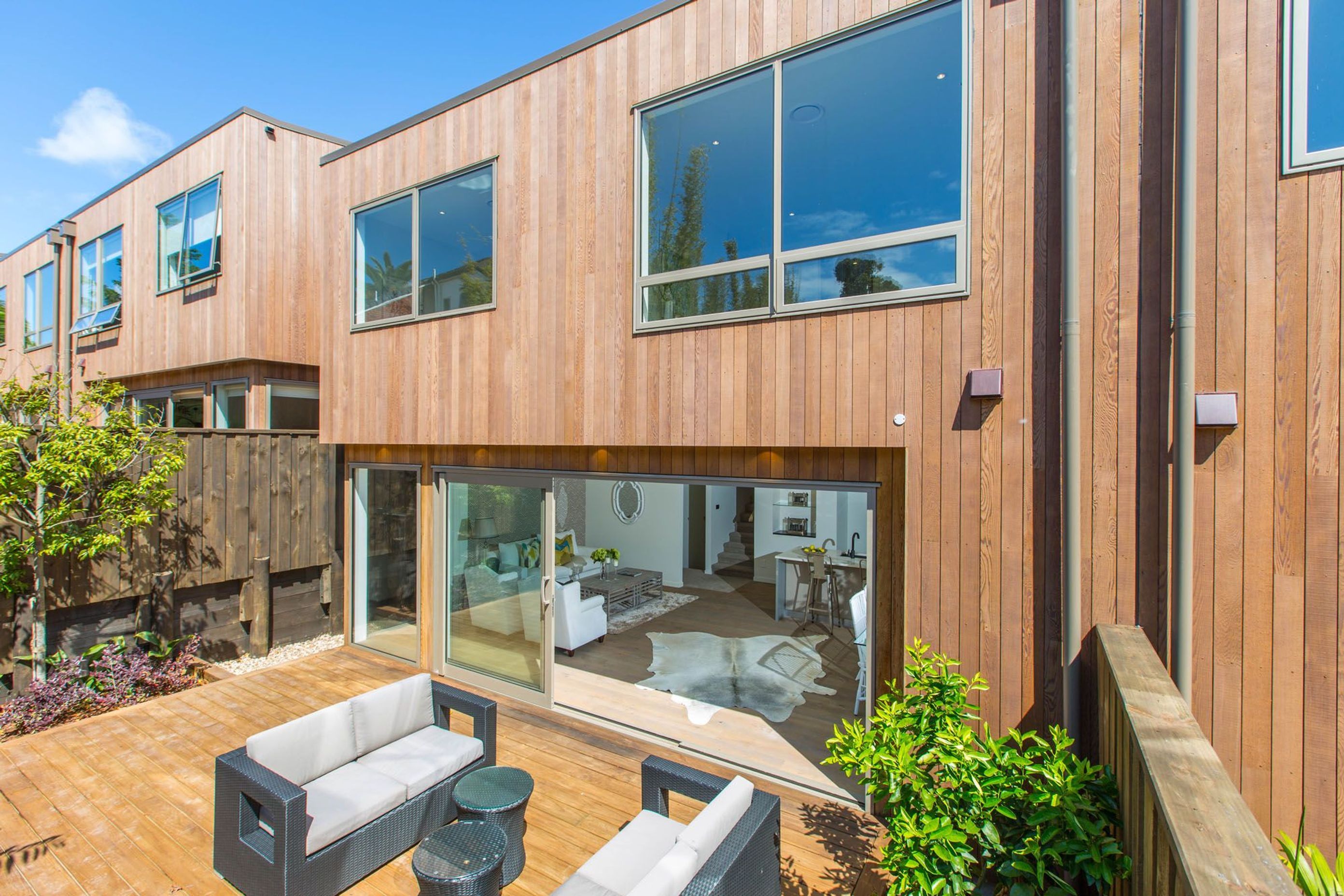 ArchiPro Project Summary - High-end Remuera Development featuring 9 luxury split duplex homes with exceptional cedar finishes and custom exterior details, successfully managed by QBS with a dedicated team of builders and subcontractors.