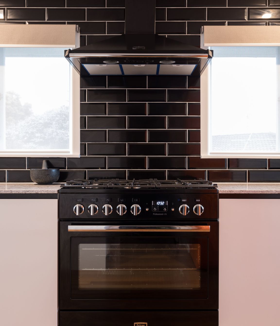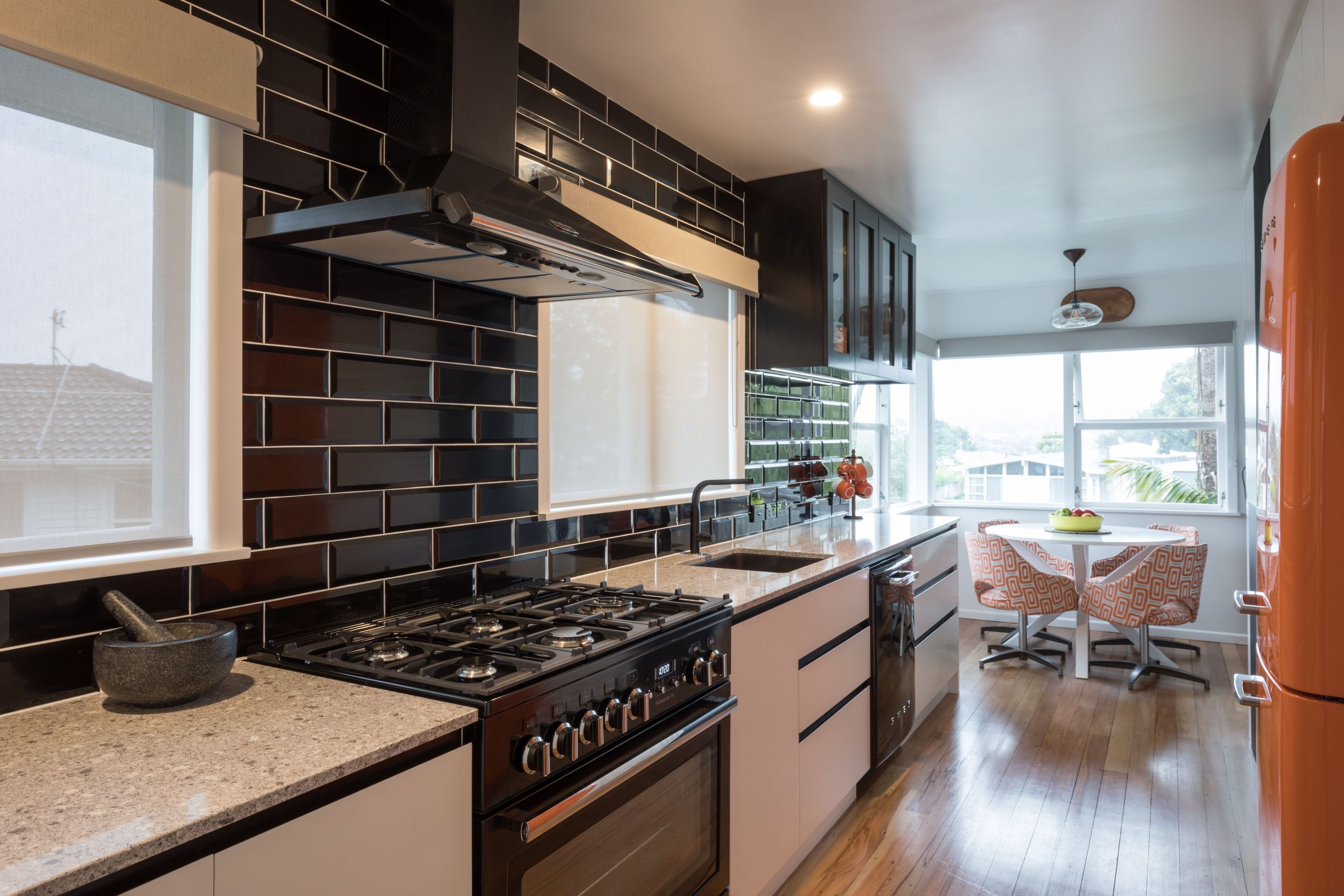 ArchiPro Project Summary - A vibrant and functional kitchen designed for a busy family of eight, featuring bold geometric cabinetry and a striking orange Smeg fridge, completed in 2017.