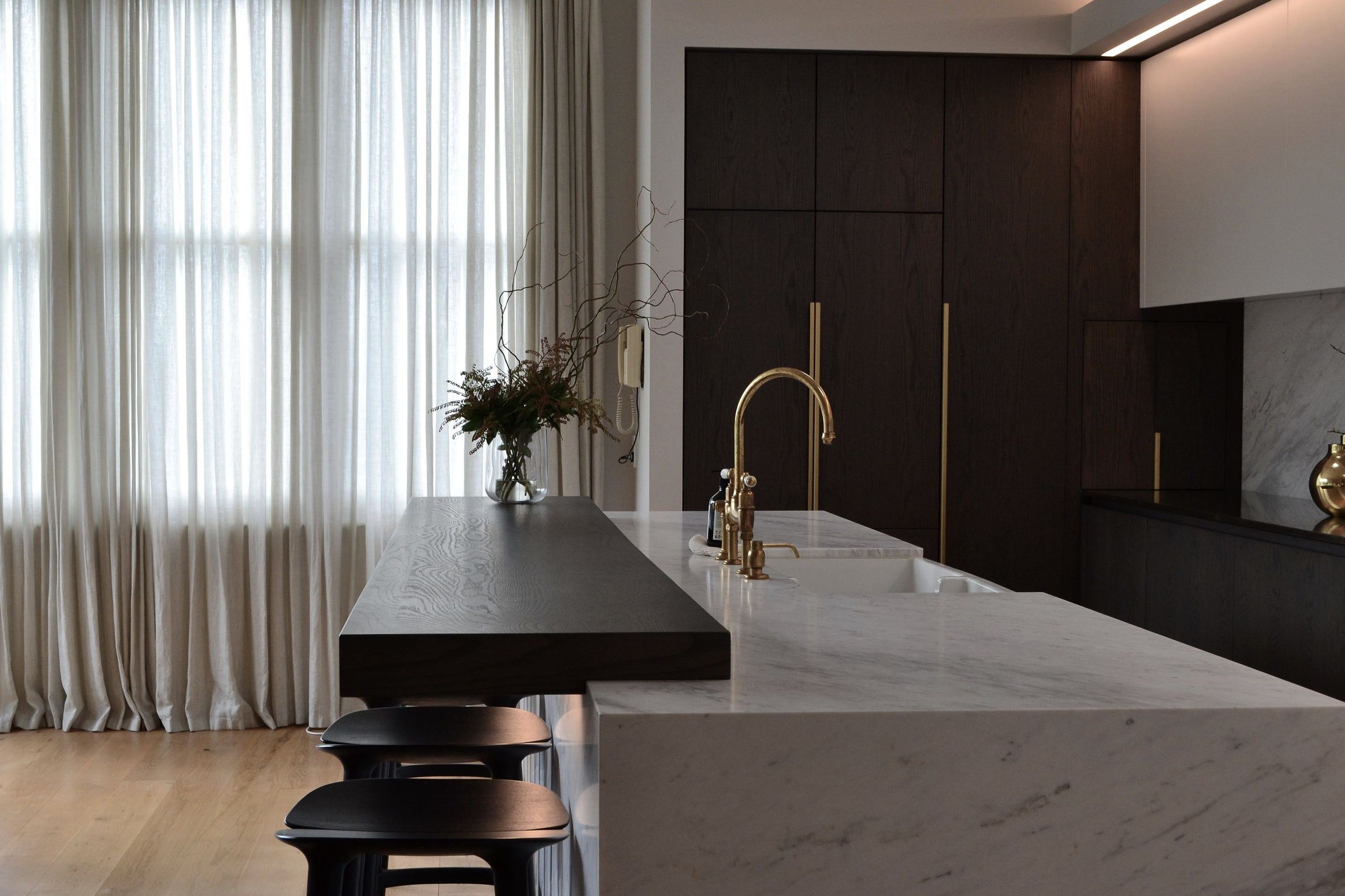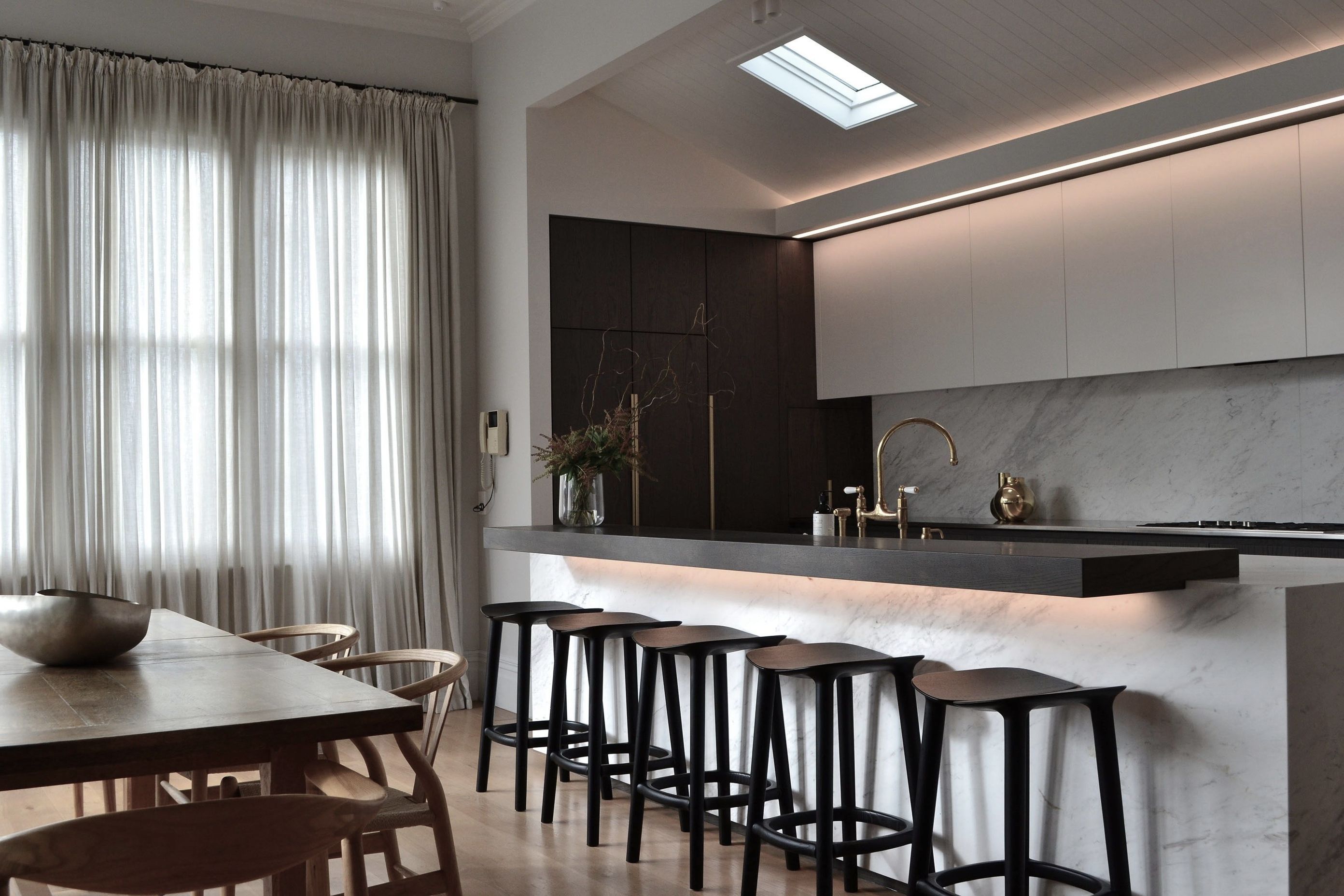 ArchiPro Project Summary - A sympathetic renovation of a classic Remuera villa, featuring modern lines, timeless materials like dark stained oak and biello marble, and elegant brass accents, designed to evolve with the family's needs.