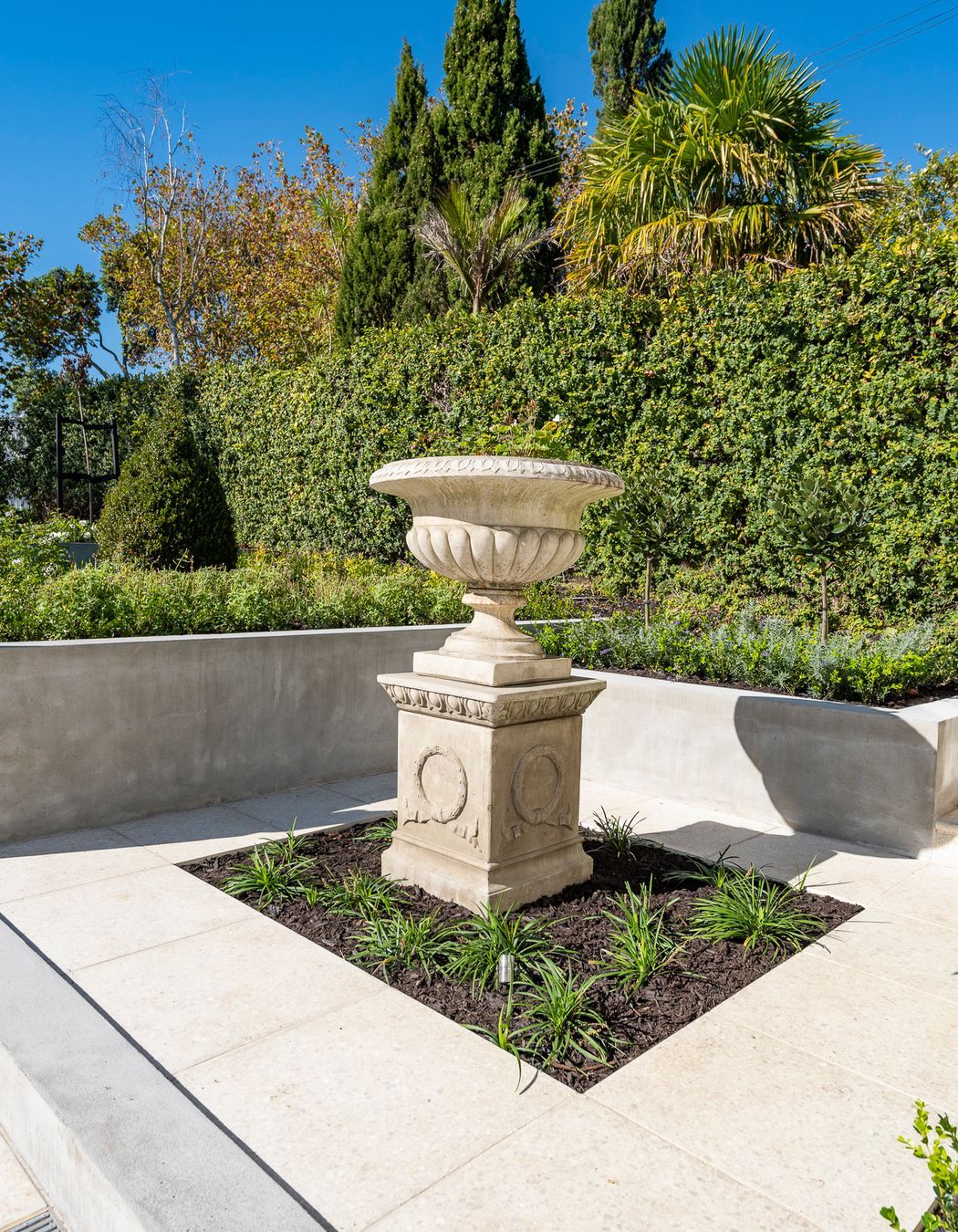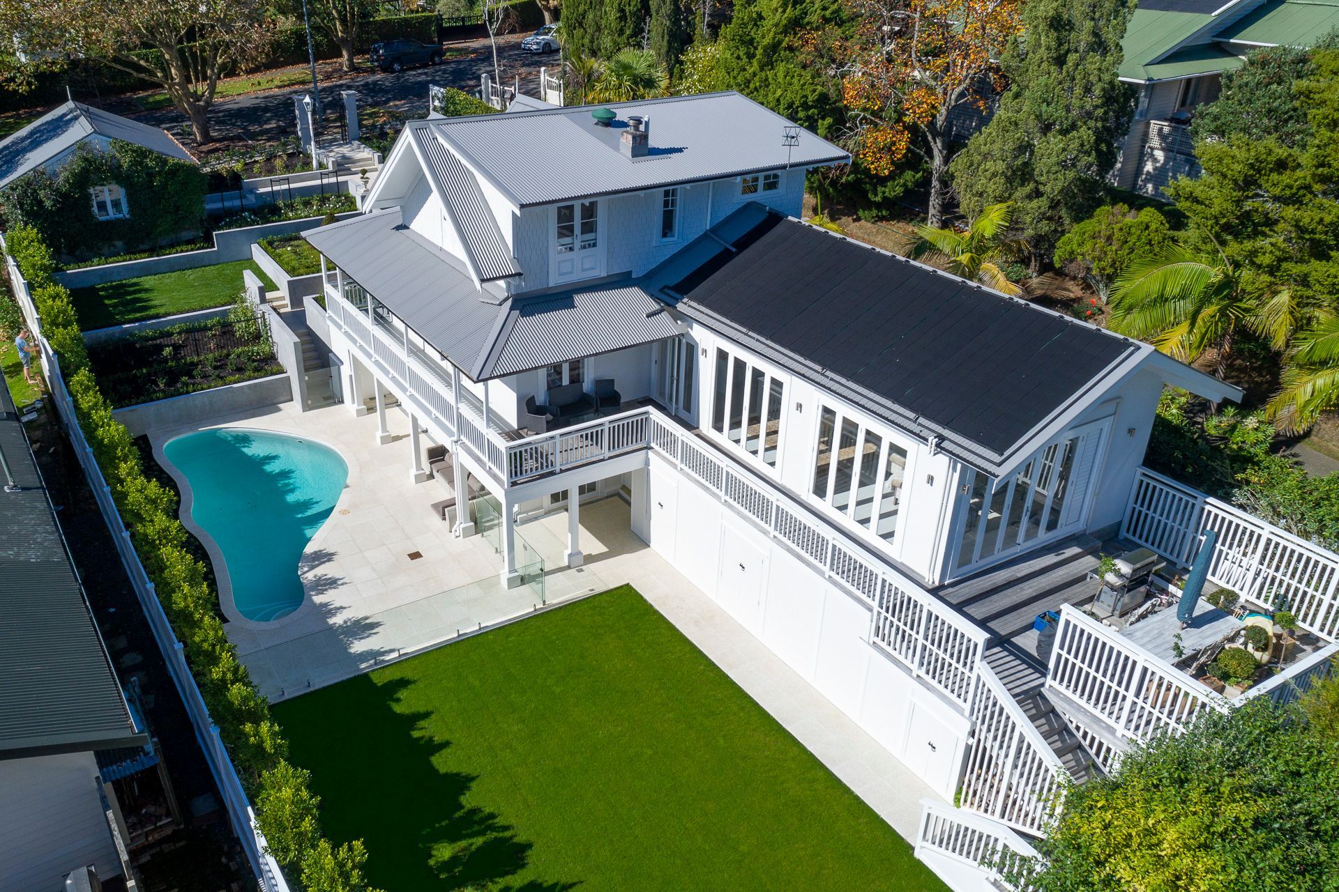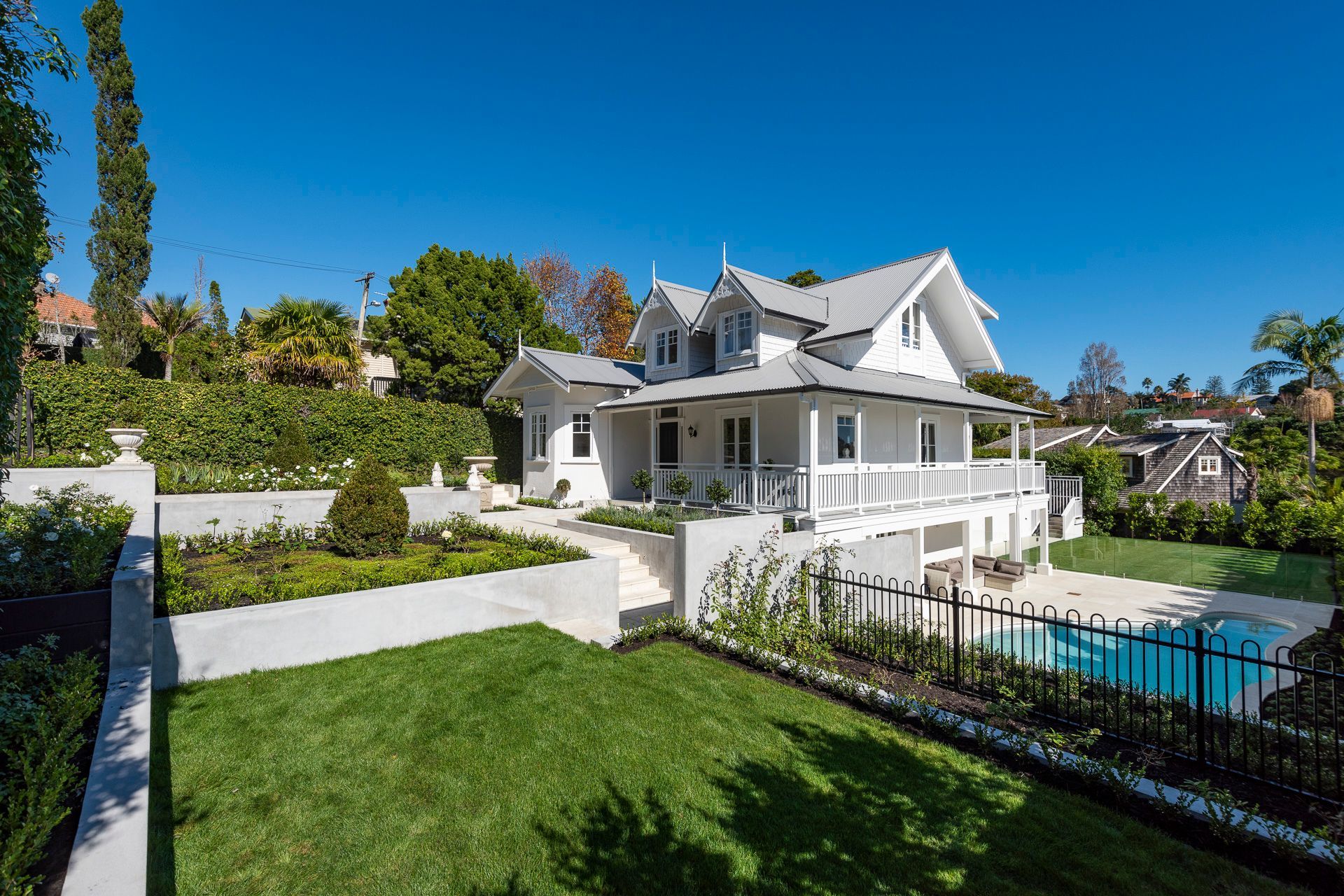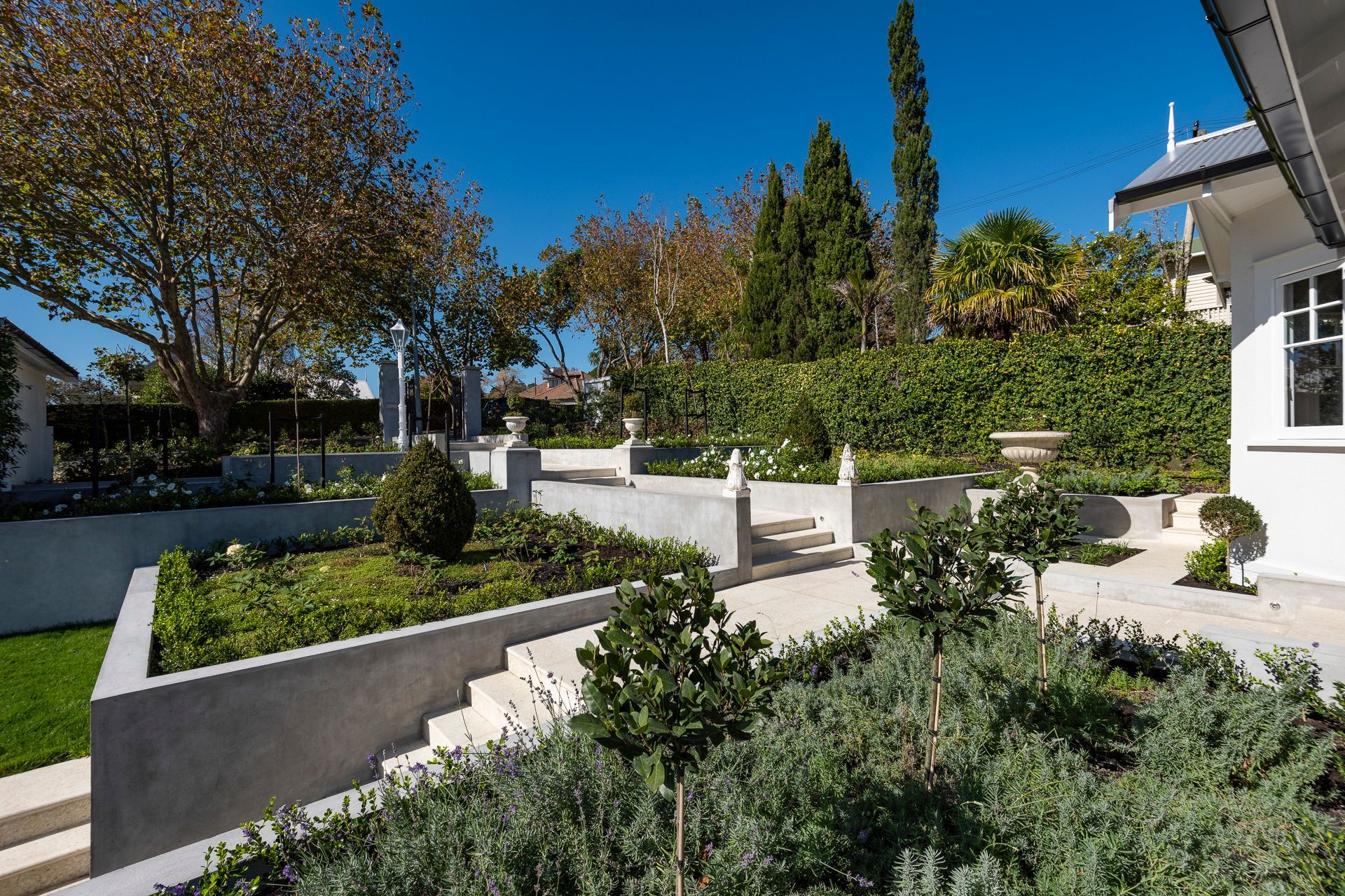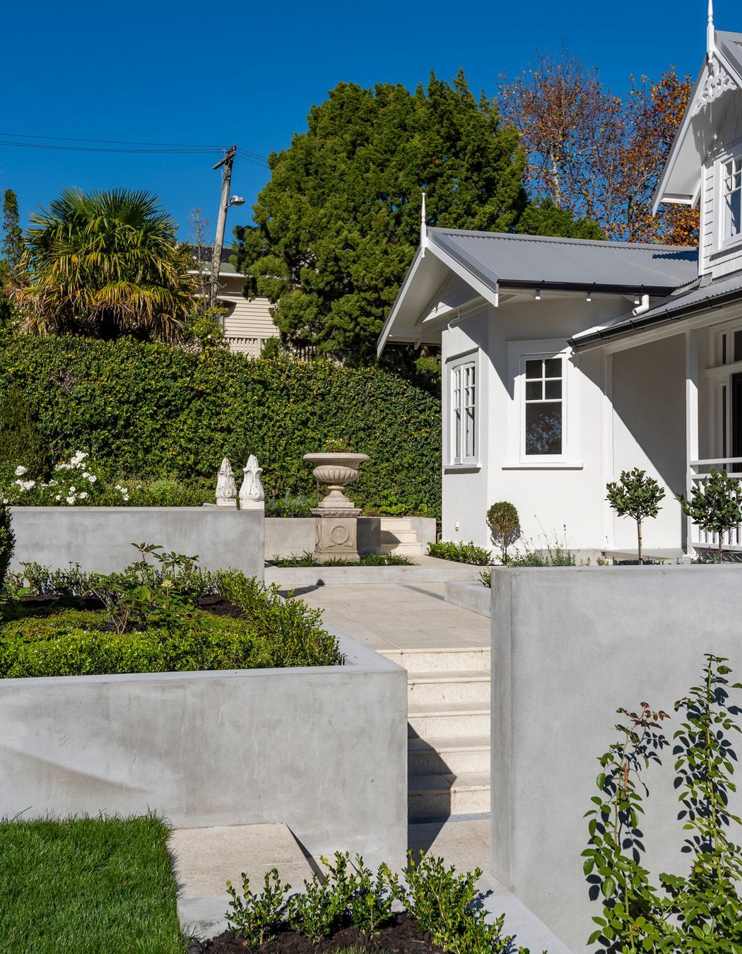 ArchiPro Project Summary - Elegant Remuera villa featuring a formal French-style garden, expertly designed to complement the sloping landscape, with clipped box hedges, a welcoming pool area, and an elevated deck for year-round enjoyment.