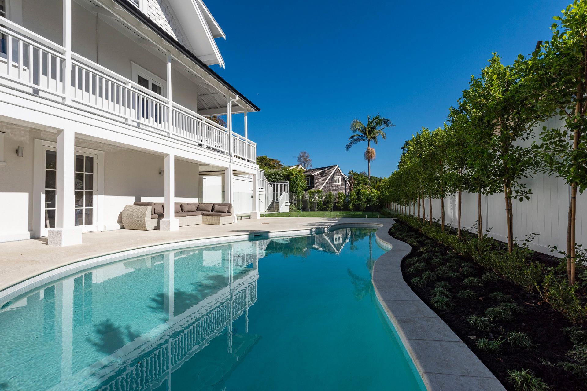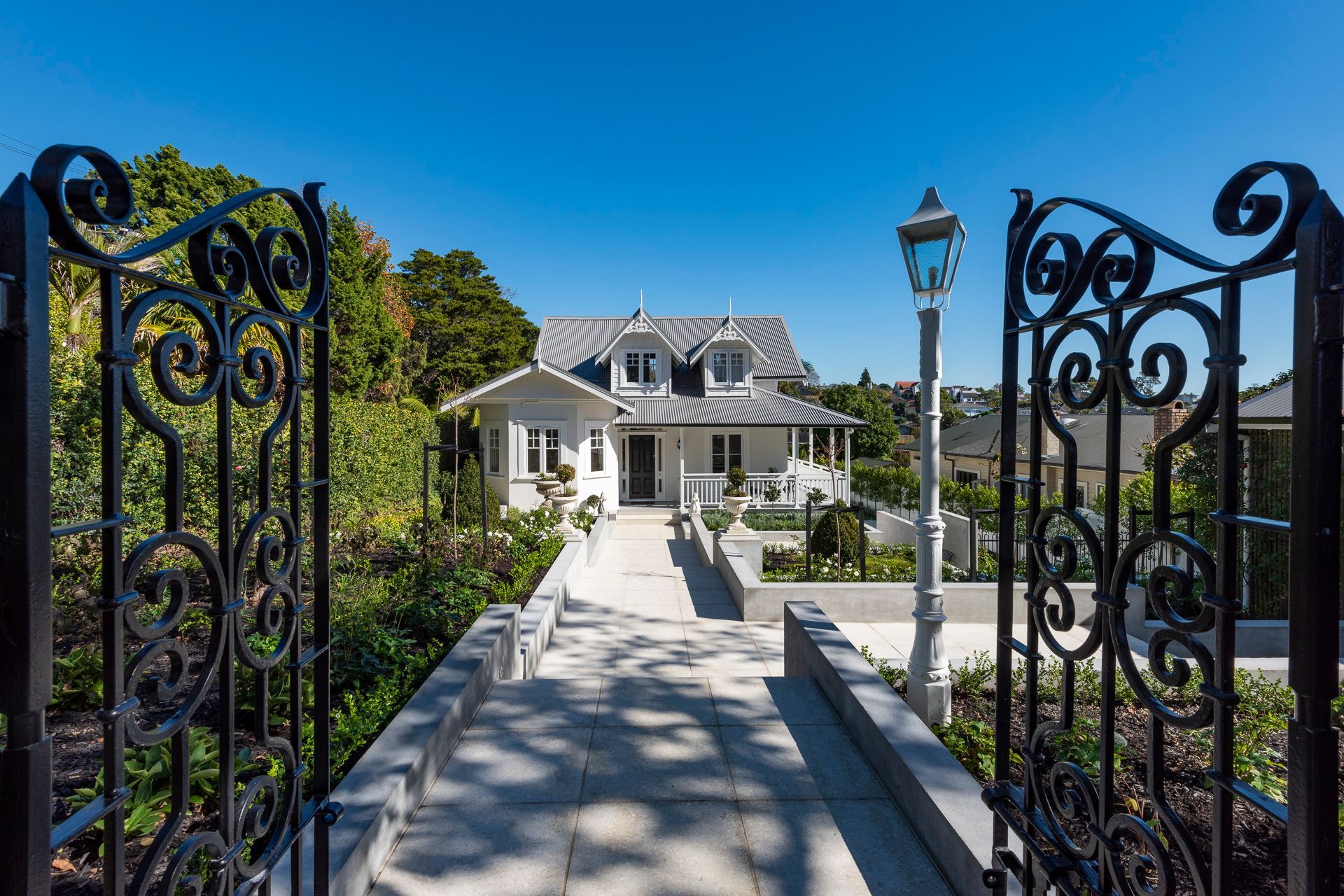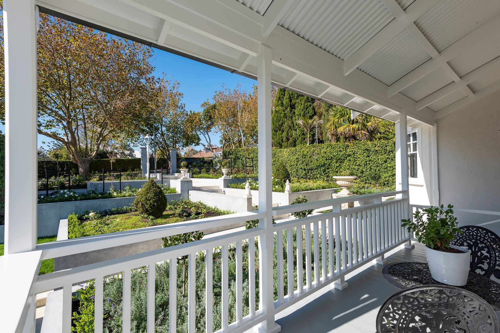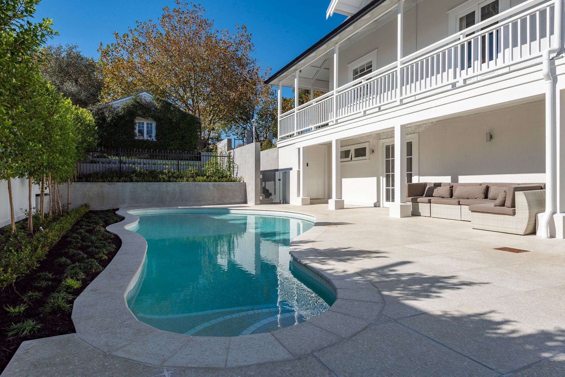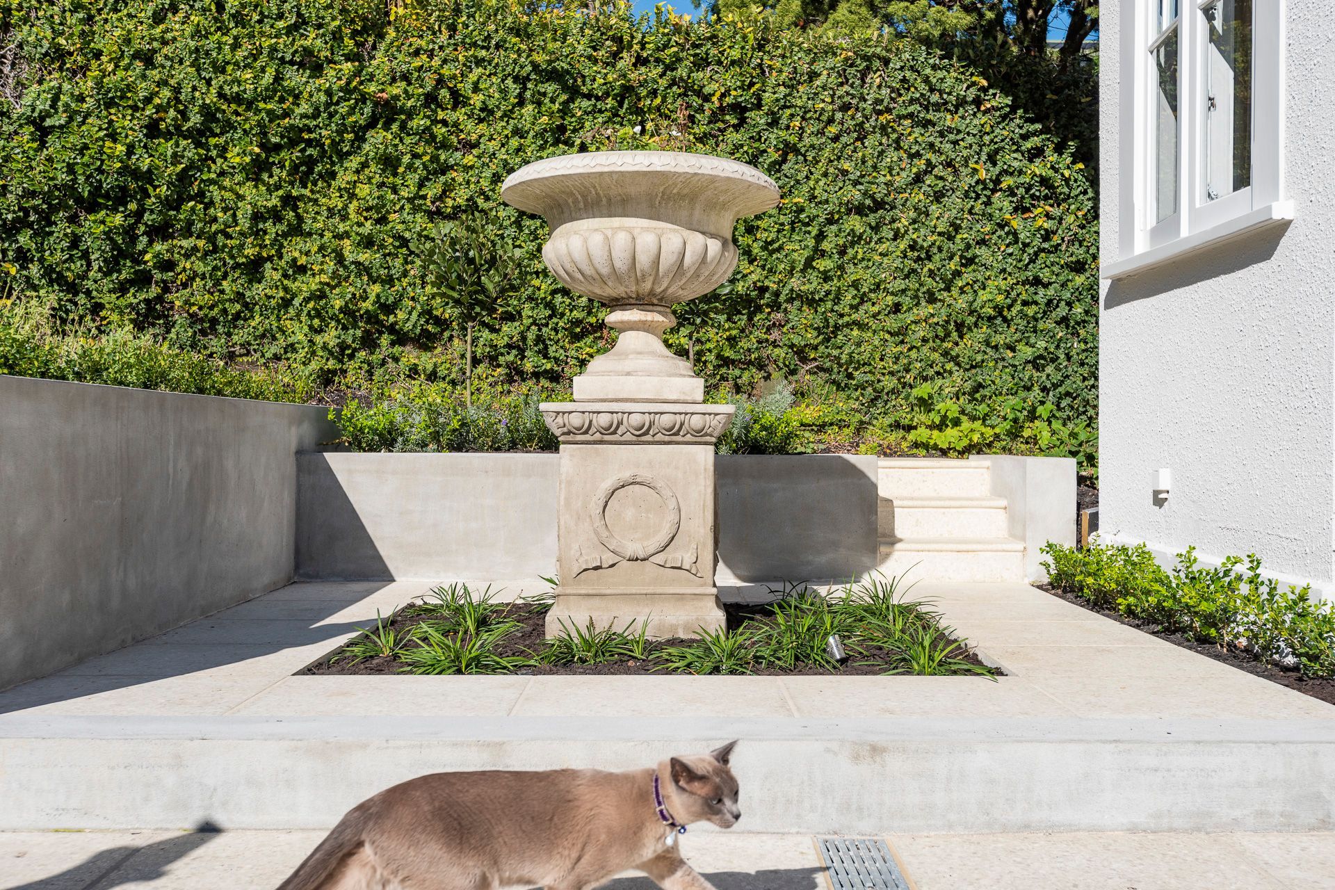 ArchiPro Project Summary - Elegant Remuera villa featuring a formal French-style garden, expertly designed to complement the sloping landscape, with clipped box hedges, a welcoming pool area, and an elevated deck for year-round enjoyment.
