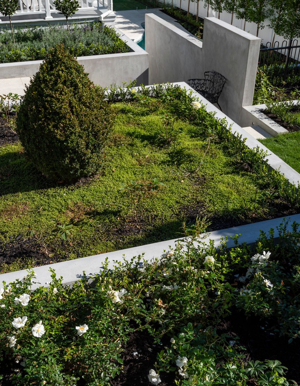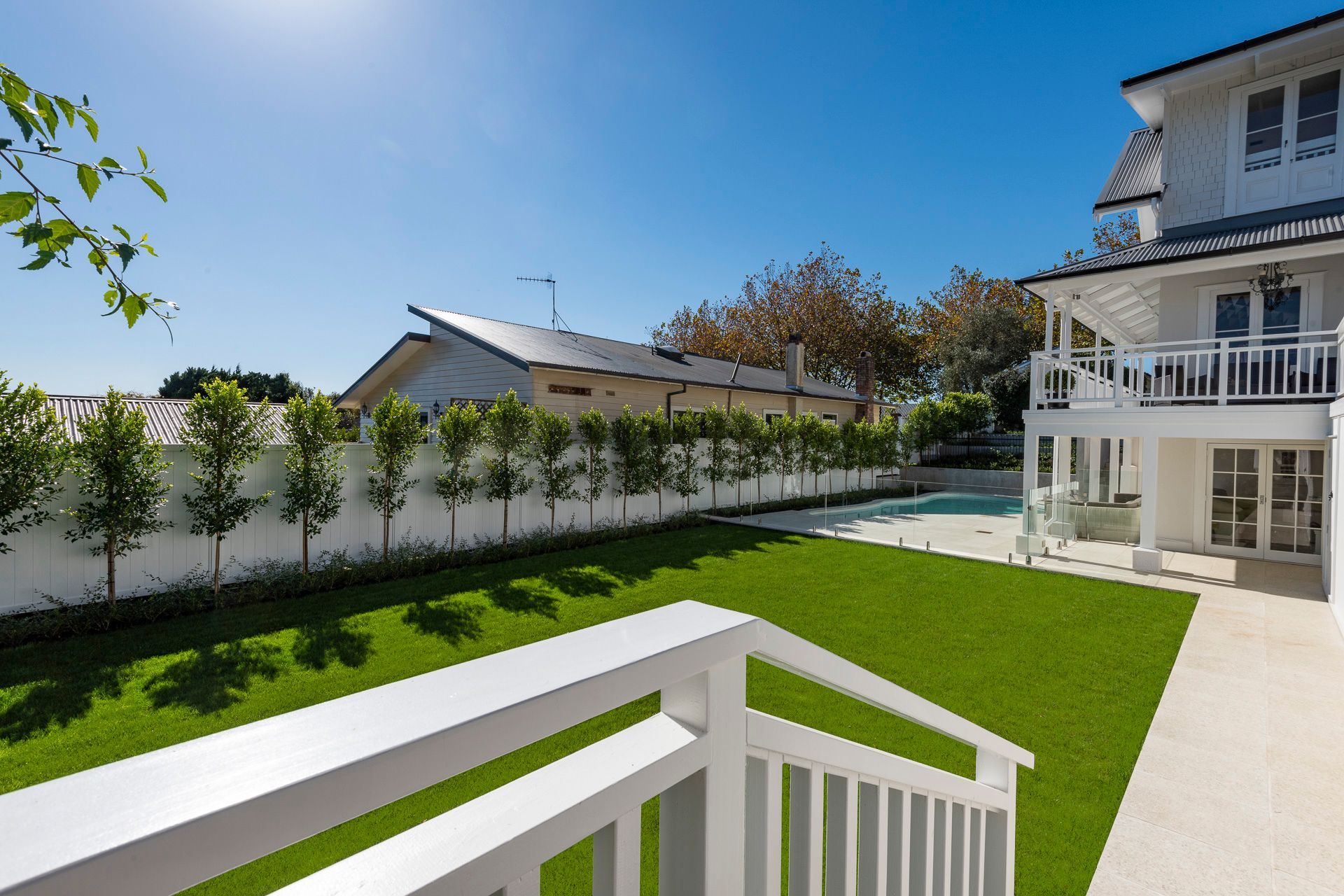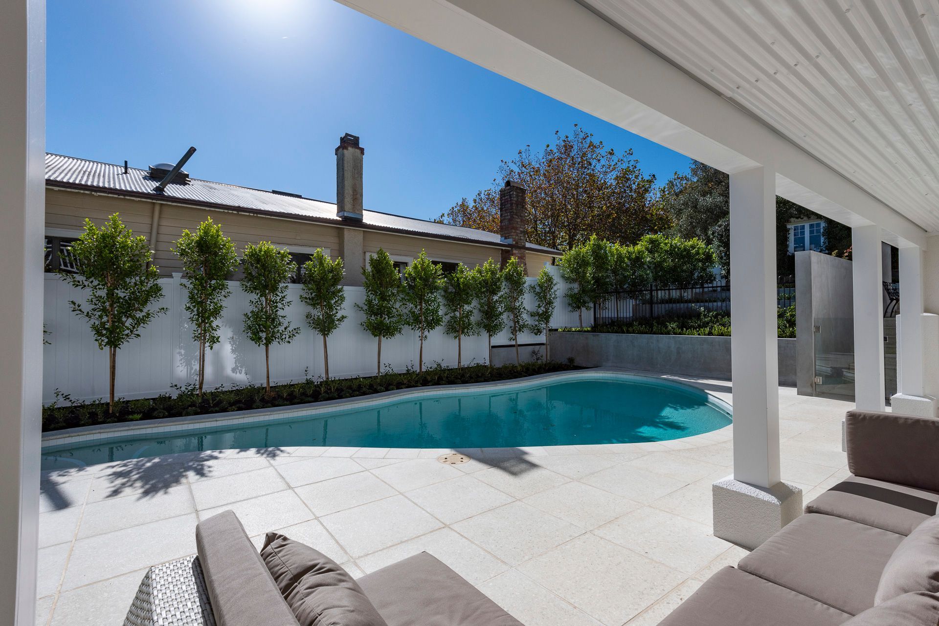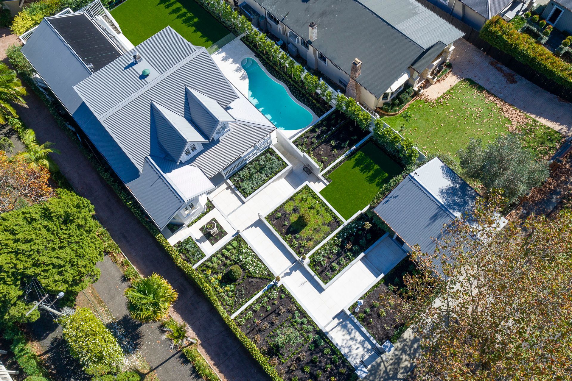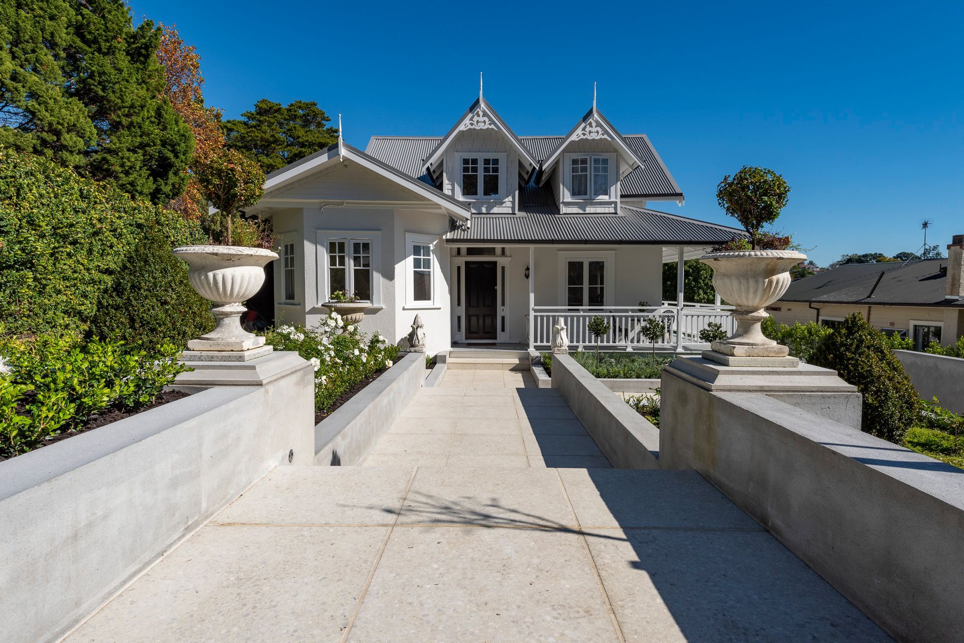 ArchiPro Project Summary - Elegant Remuera villa featuring a formal French-style garden, expertly designed to complement the sloping landscape, with clipped box hedges, a welcoming pool area, and an elevated deck for year-round enjoyment.