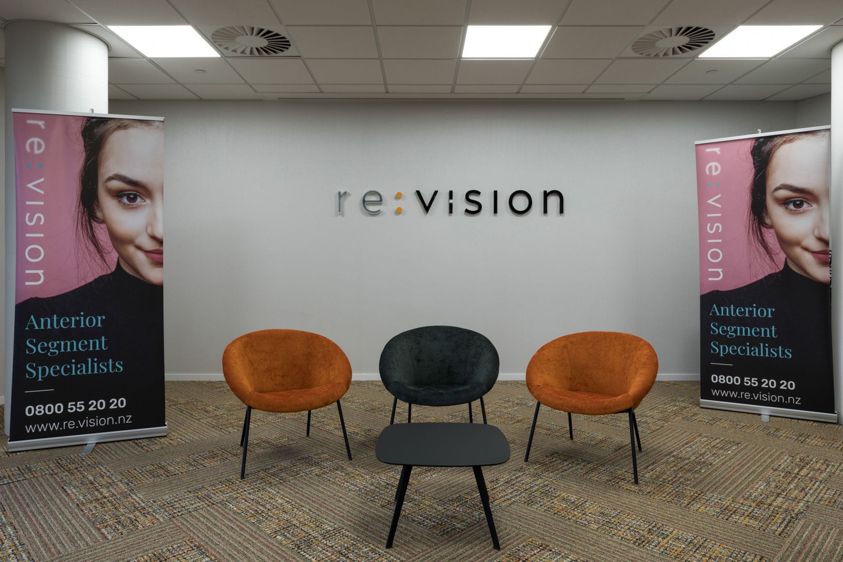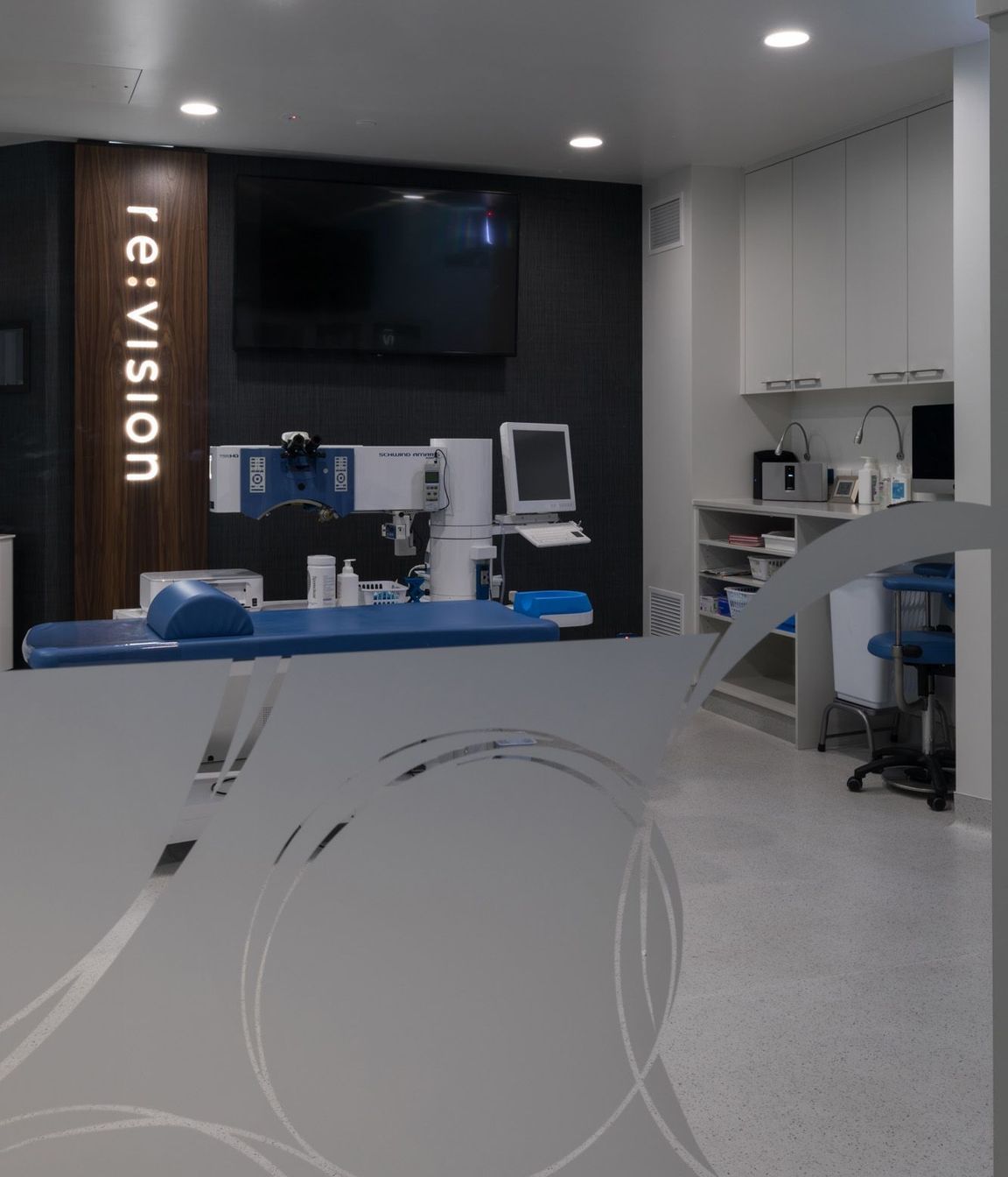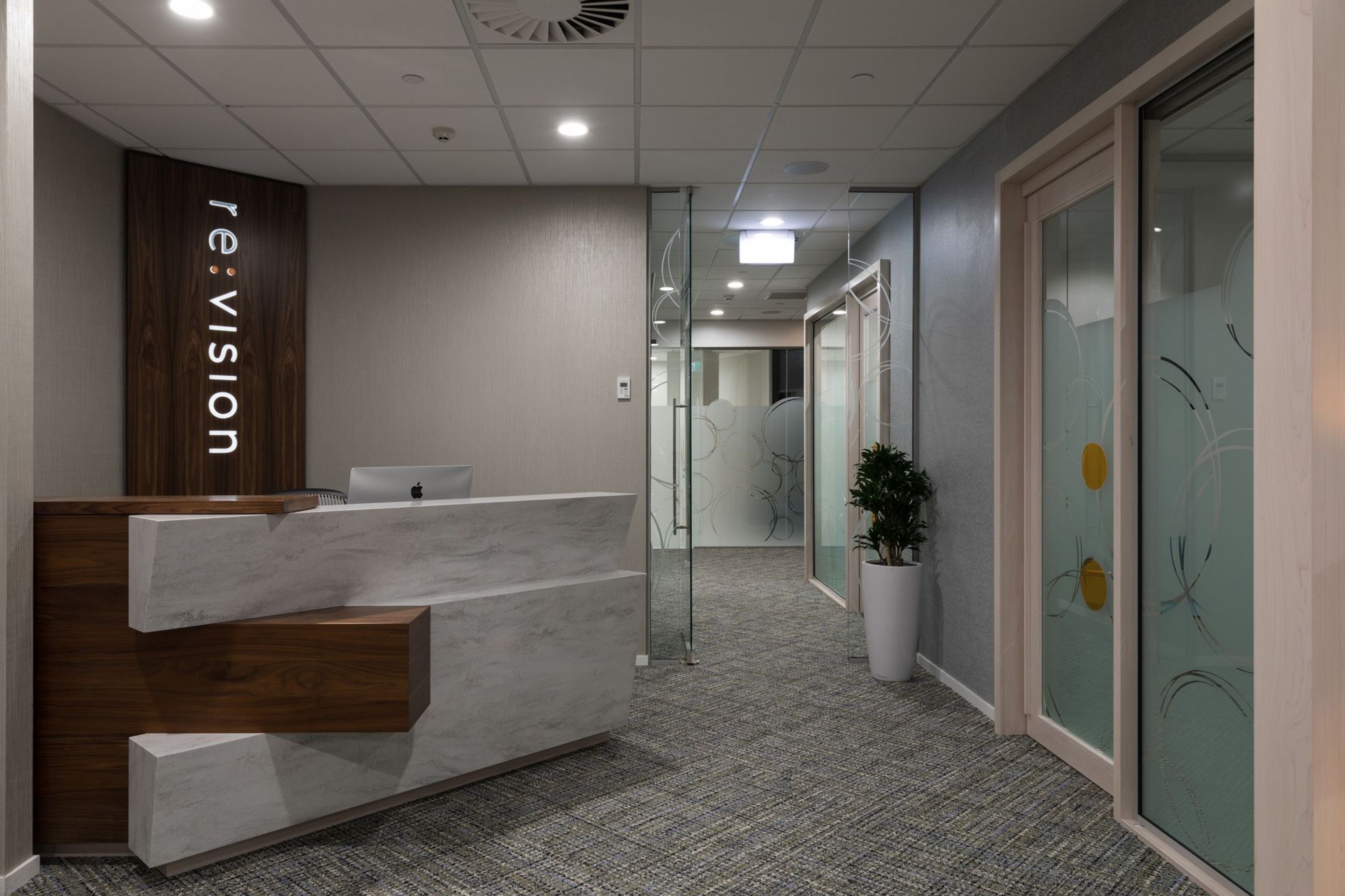 ArchiPro Project Summary - Re:Vision, a state-of-the-art eye clinic, features an open-plan design with floor-to-ceiling views, blending modern aesthetics with luxurious finishes to create an enjoyable experience for clients and staff alike.