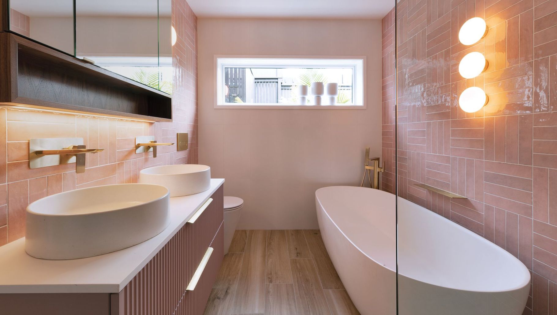 ArchiPro Project Summary - A vibrant 2022 renovation featuring bold pink subway tiles, mid-century inspired brass Como tapware, and a contemporary Forma Opaco vanity, harmoniously complemented by elegant walnut design details.