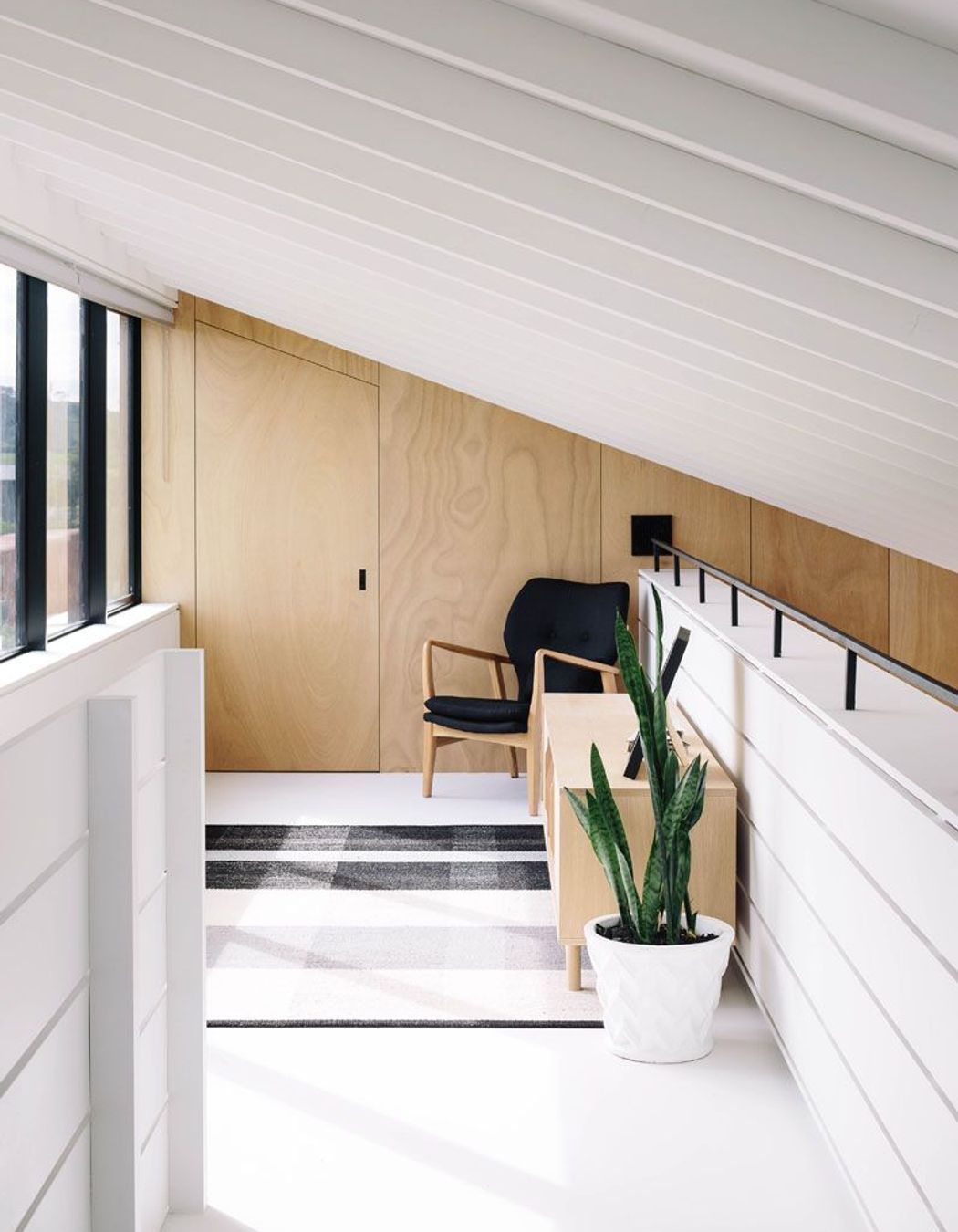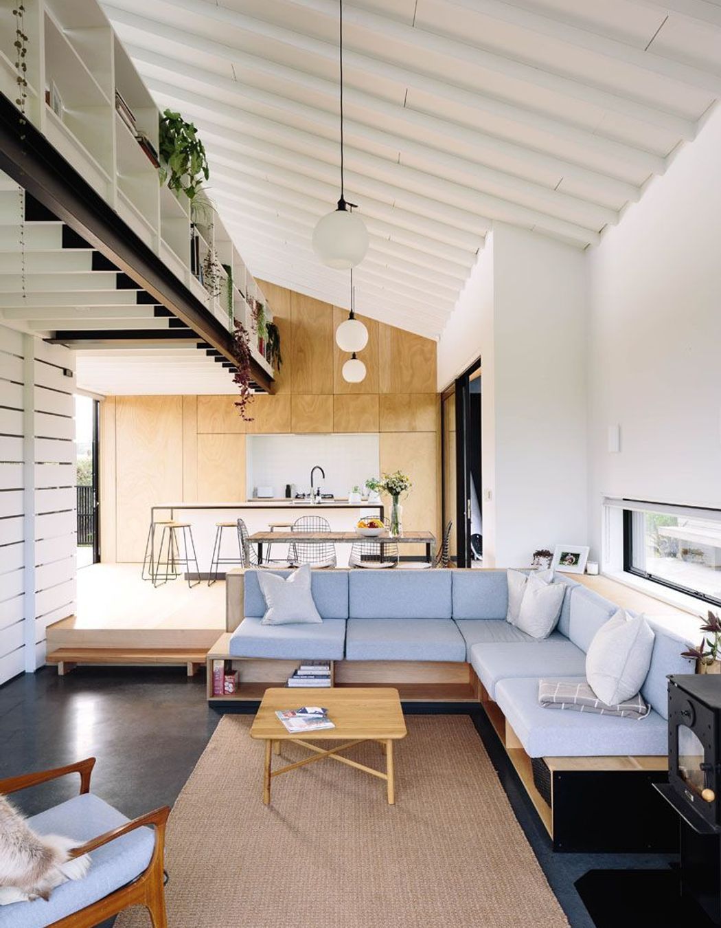 Our brief was to have a minimum of two bedrooms and a bathroom. We ended up putting a mezzanine above the living area, which was to gain more room but also to create separate zones for living. During construction, we realised that we could fit another small bedroom in the roof attic space. There is also a day bed and an office space upstairs.