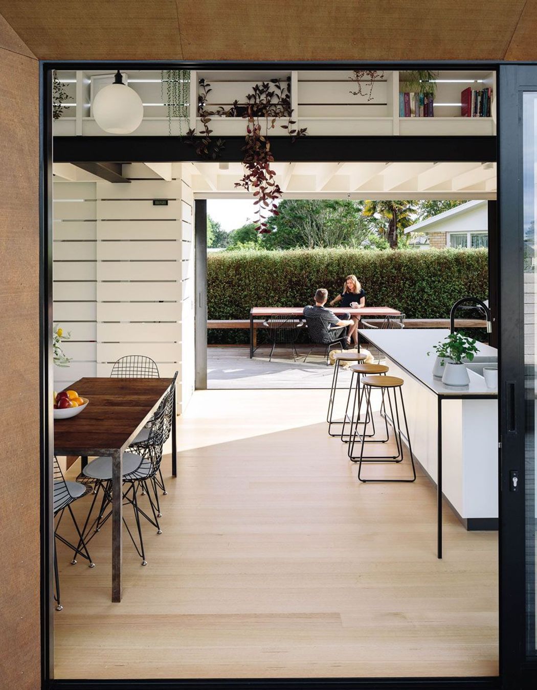 Inside, we wanted a modern-day home that still retained the bach feel, so we instigated three rules with the interior materials. Anything generic and cost efficient, such as pine or GIB, was painted white. Anything in steel/aluminium was powdercoated black, and any natural material – such as the ply, the Tasmanian Oak flooring and the built-in cabinetry – was exposed to impart a light, natural aesthetic.