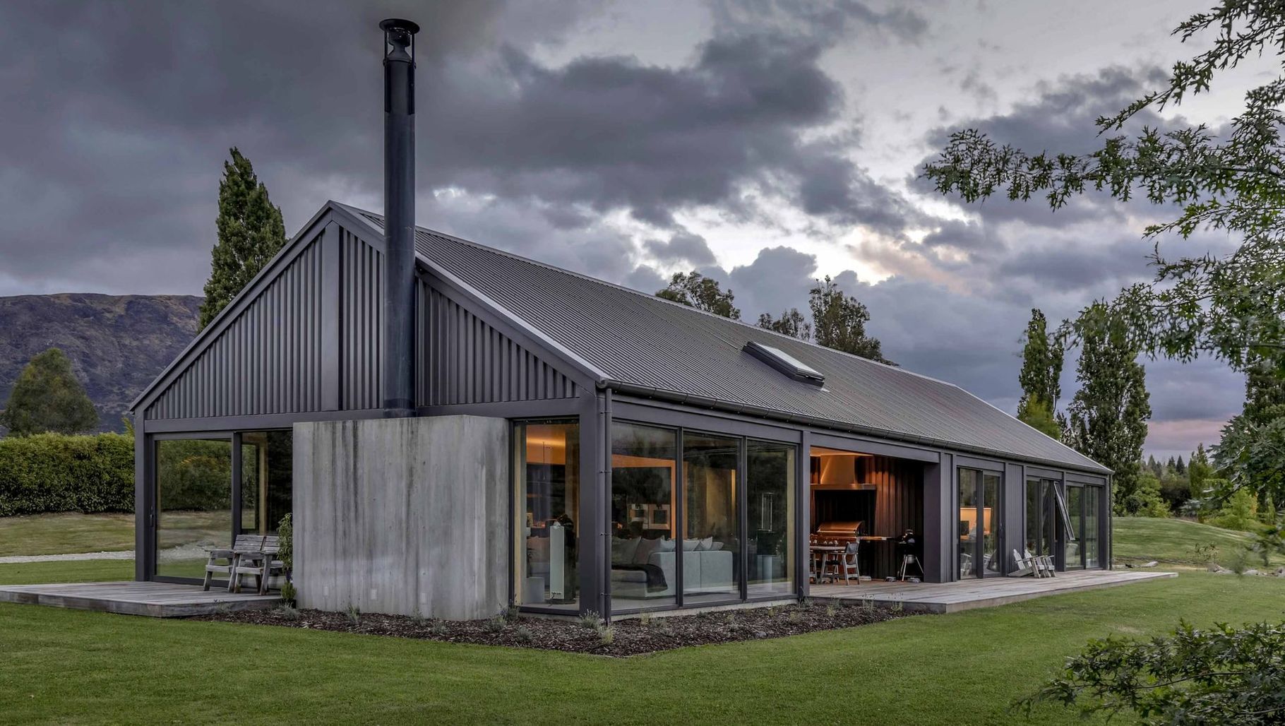 ArchiPro Project Summary - A striking T-shaped family home harmoniously blending dark barn-like aesthetics with textured in situ concrete, designed on a modest budget to embrace the scenic Otago landscape and provide functional outdoor spaces for year-round enjoyment.