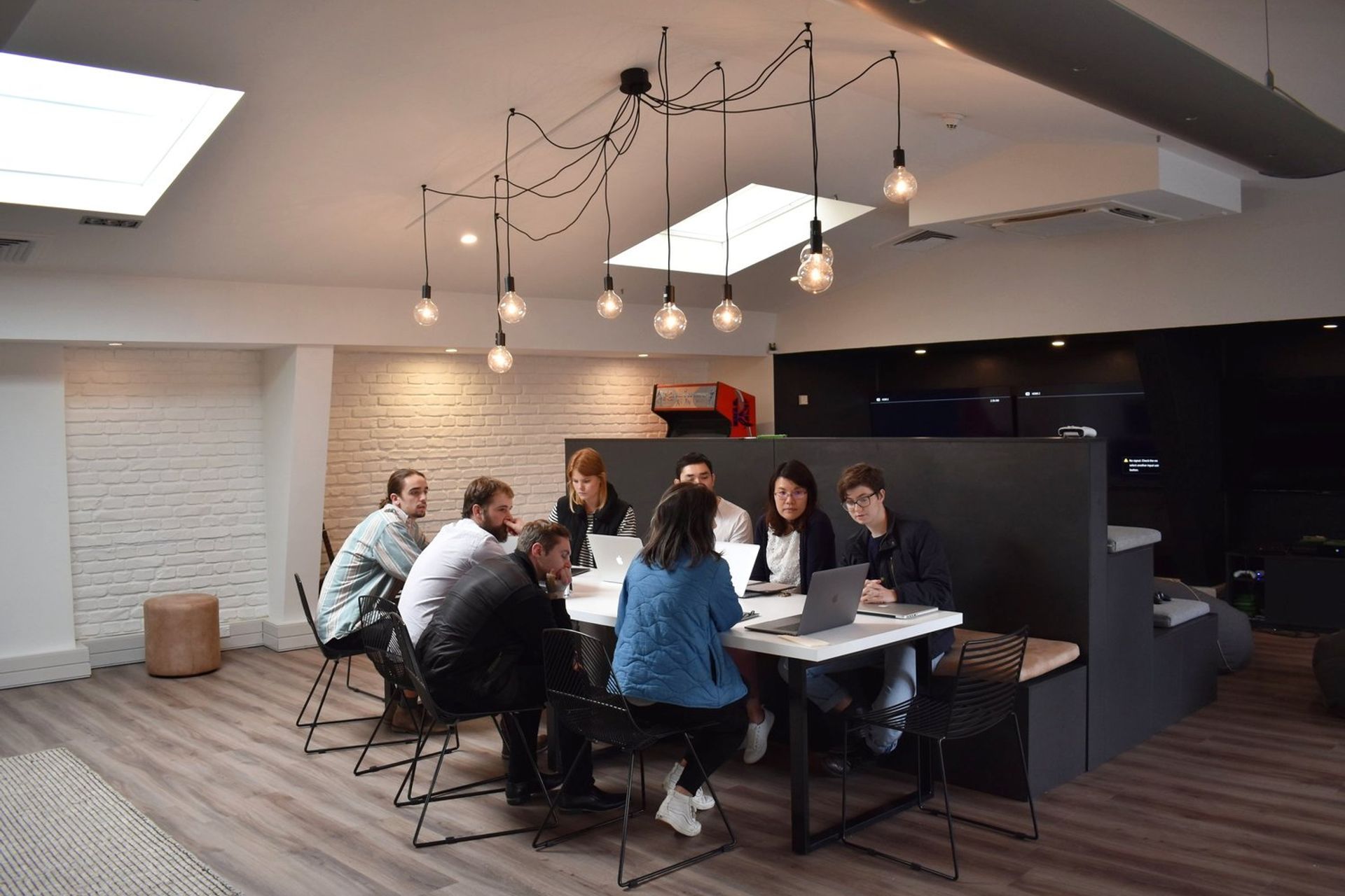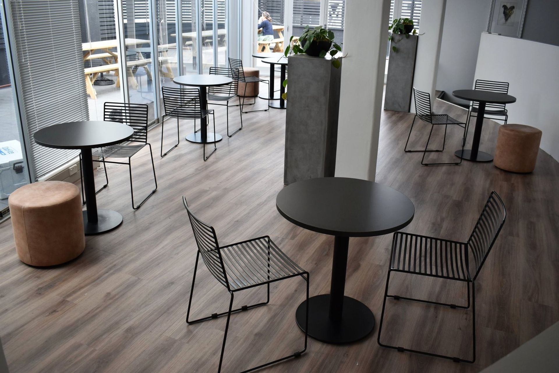 We specified a mix of black wire chairs, beautiful leather look ottomans and simplistic tables with concrete look pillars dotted with plants. The black track lighting hit the monochrome Scandinavian style right on the head, and makes the space much brighter, suitable for task working. People are seen having an impromptu meeting at a free table, others having lunch while they check Instagram. The employees really own the space and are embracing the culture.