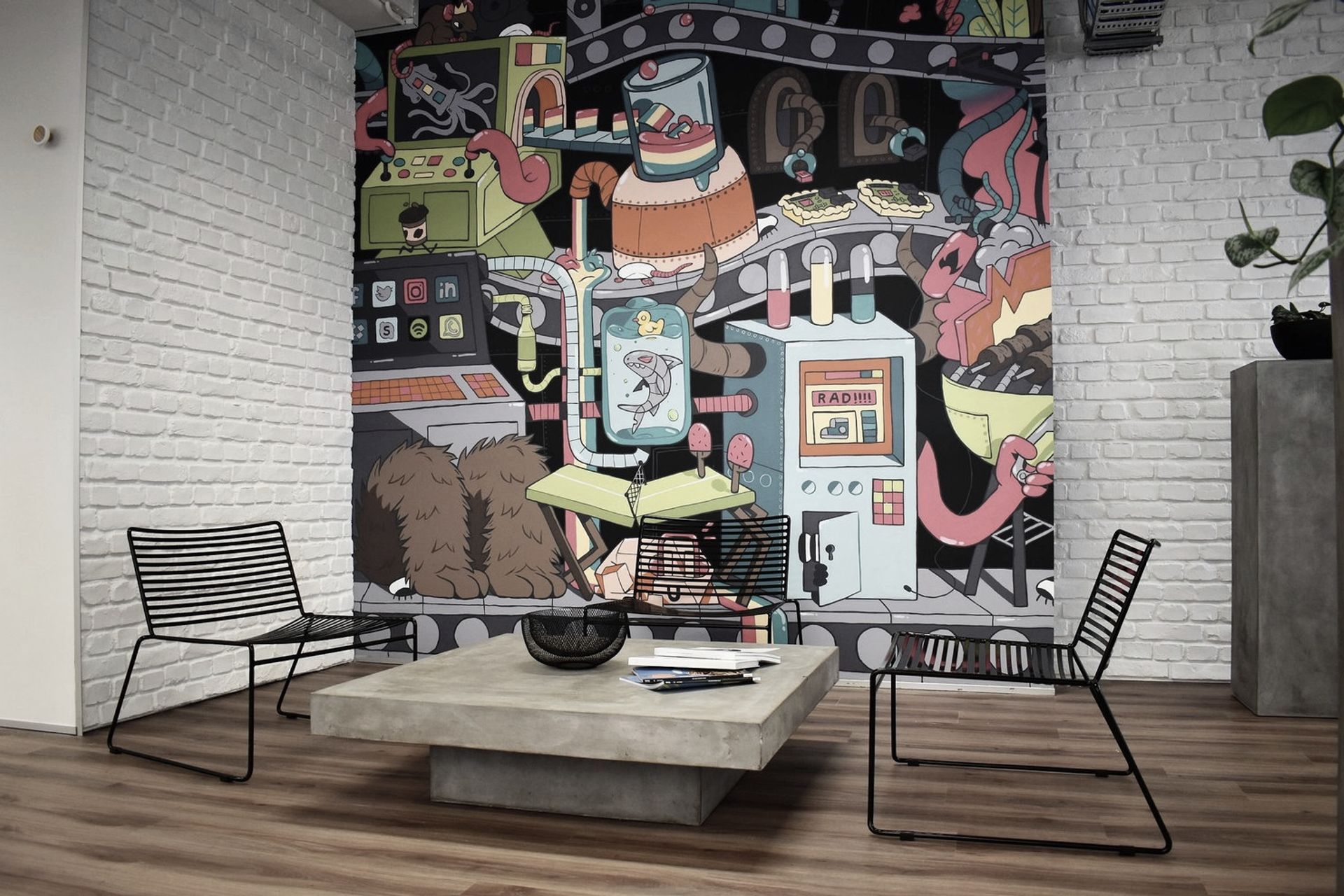 Collaboration spaces were high on the priority list as there were initially only three meeting rooms split over the levels, which were not enough to fit the needs of this growing company. We space planned to add an additional four casual meeting spaces. The first one is as you walk in, and there is no way you can miss it. With vinyl wood flooring and exposed mechanical services suspended, this space has a custom mural painted by Watermark at the heart of the space. Dotted with robots, social references and a bold palette it really makes an impact. Subtle black wire chairs and concrete coffee table and pillars, the space works together to create a vibrant first impression and functions as a casual meeting space and reception.