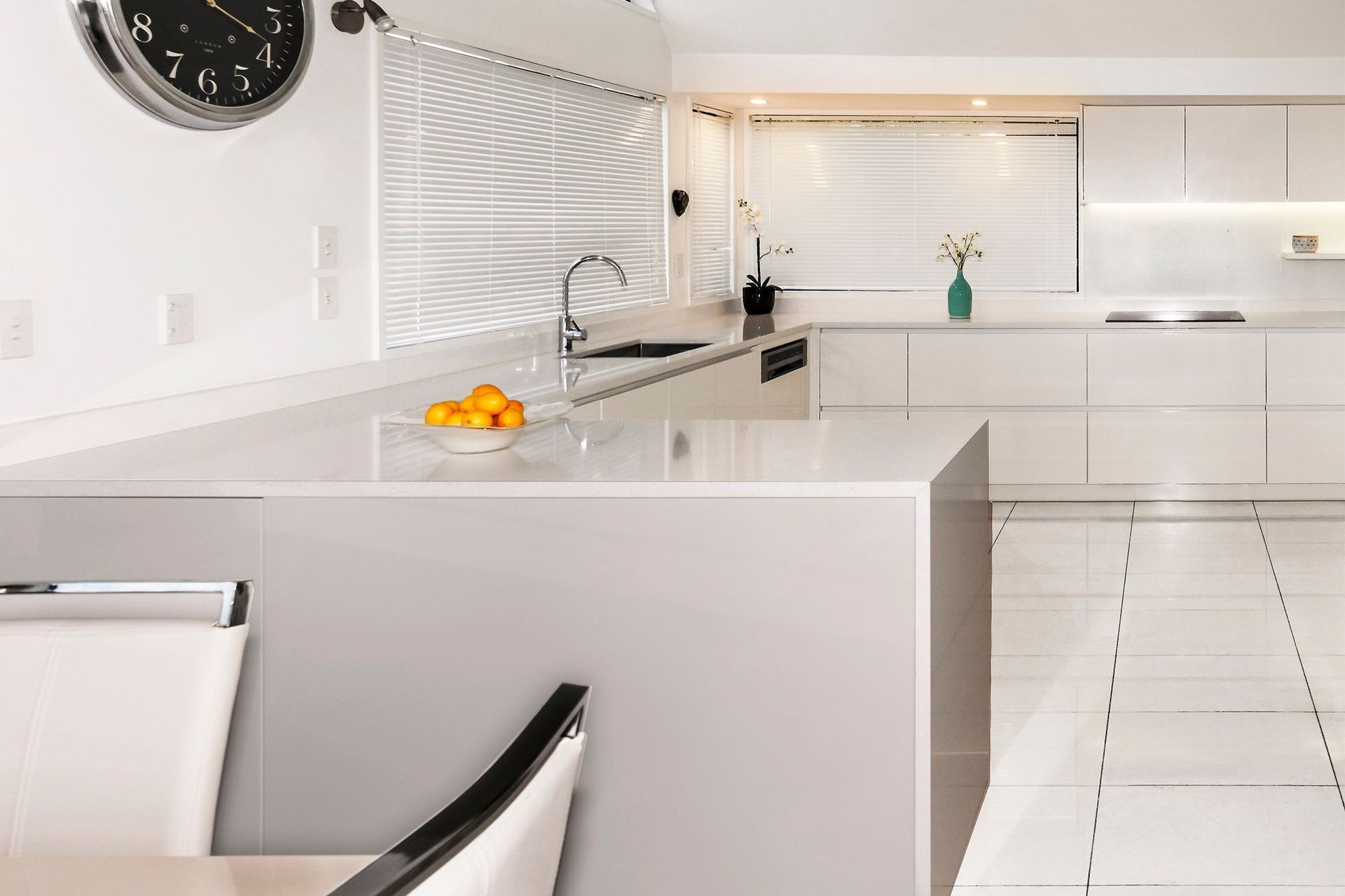 ArchiPro Project Summary - A sleek, handle-free kitchen design featuring a clean, white aesthetic tailored to the client's vision.