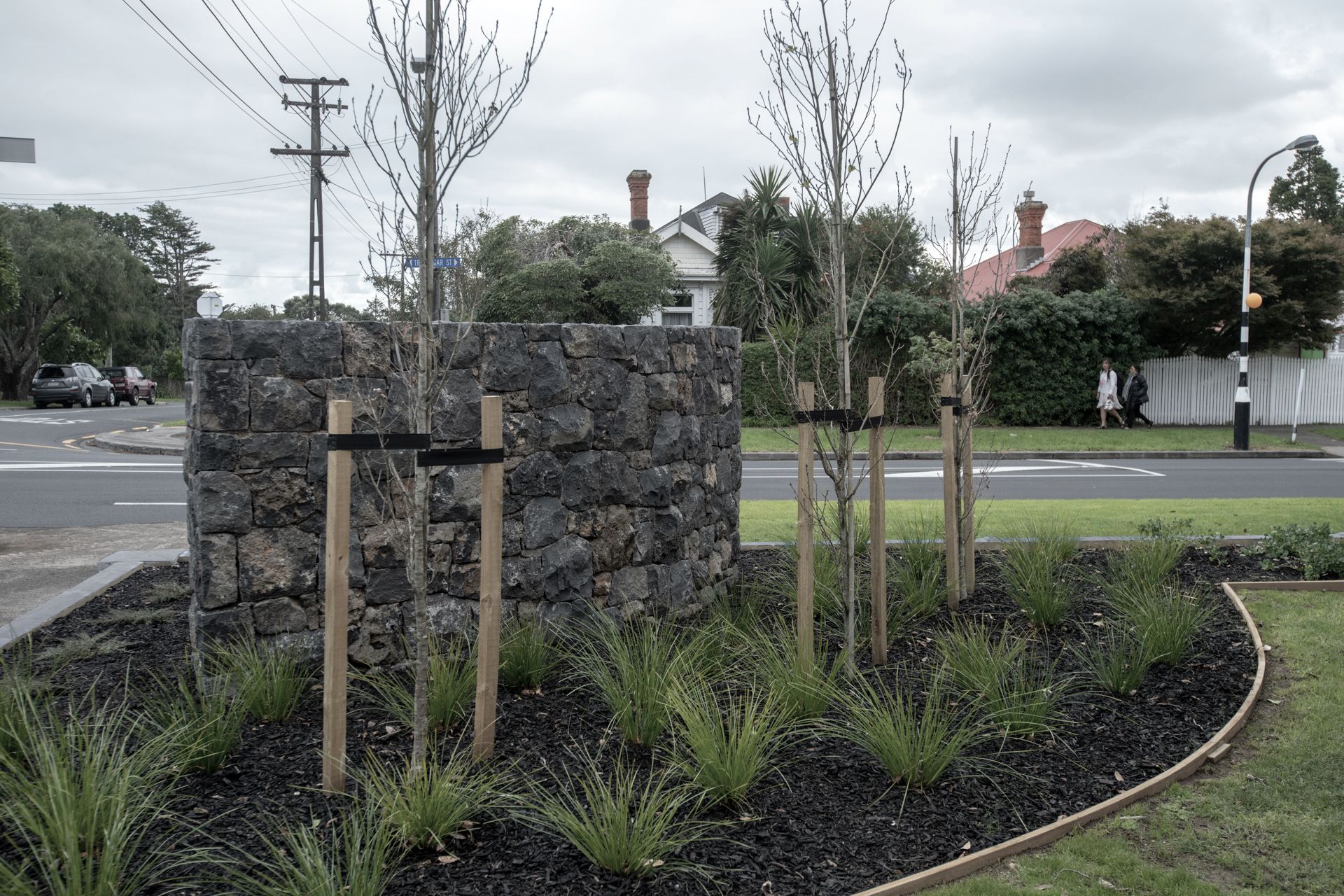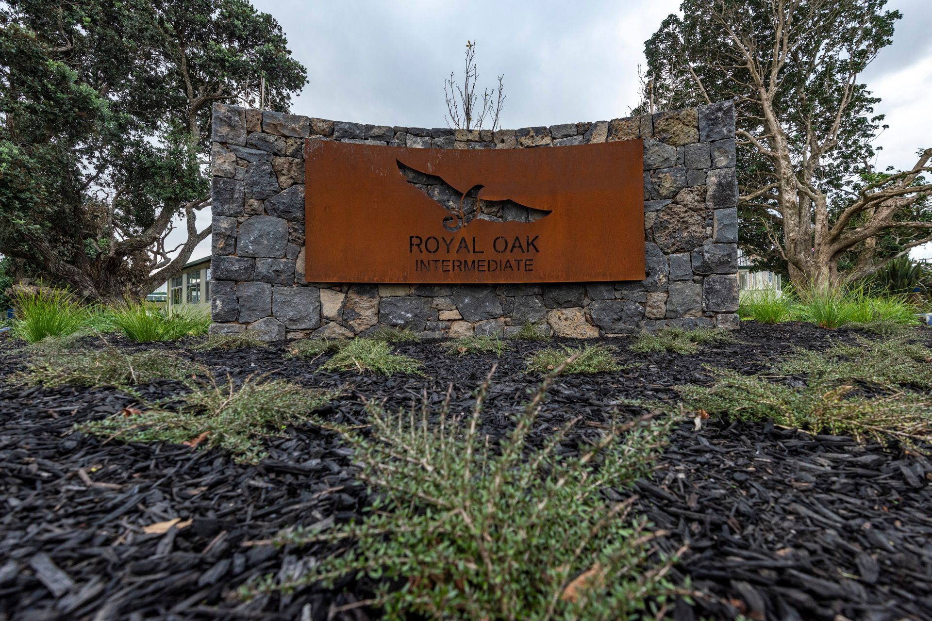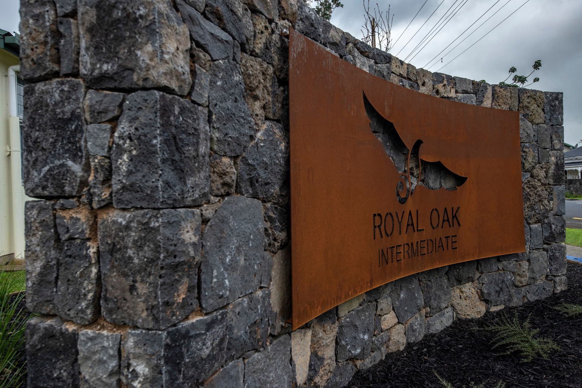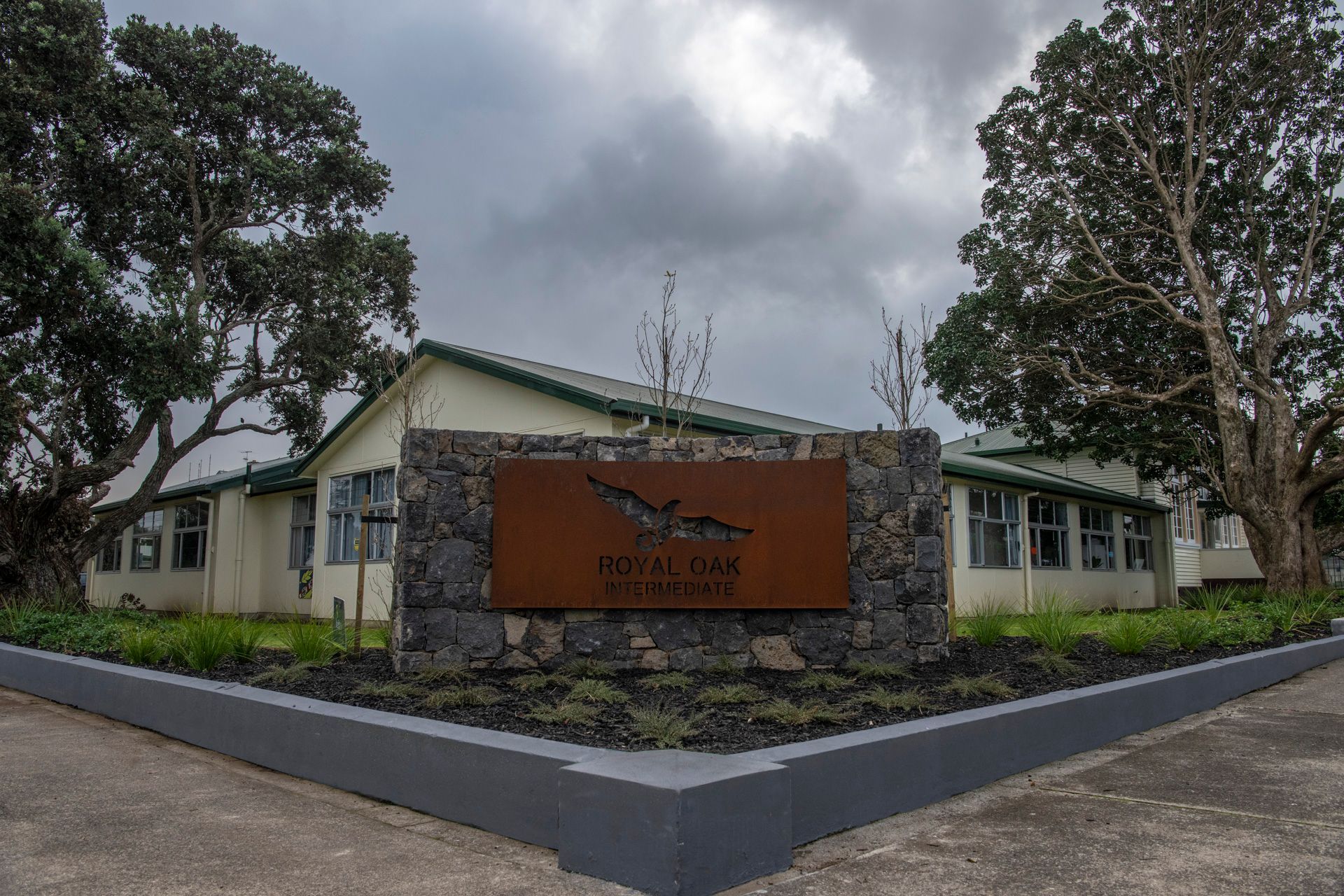 ArchiPro Project Summary - Enhancing Royal Oak School's outdoor areas with native planting, a basalt block wall, and a Coreten sign, creating an inviting entrance that fosters enthusiastic learning.