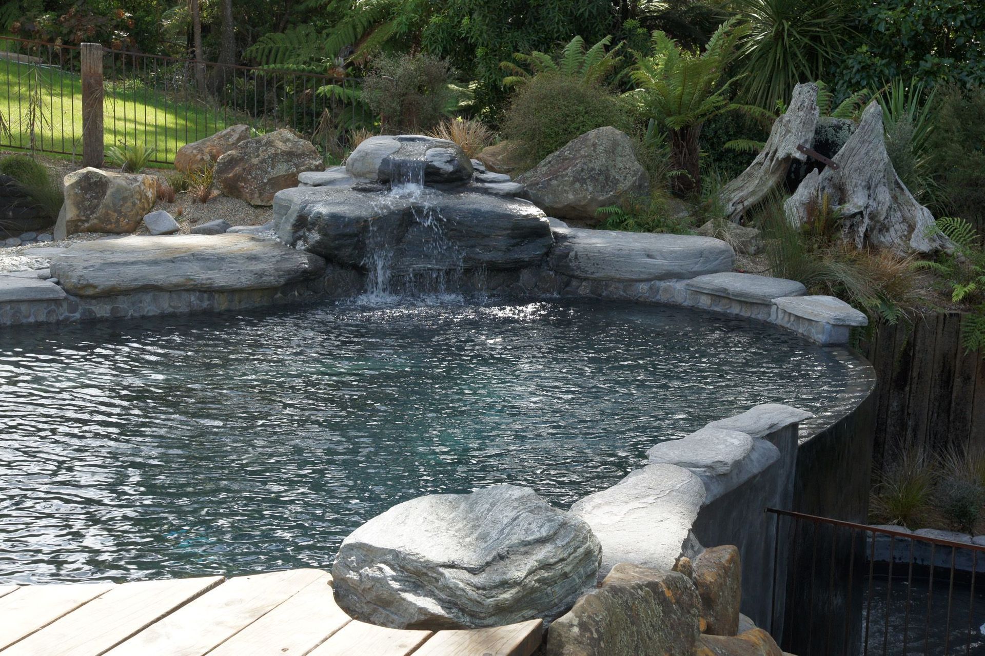 Infinity edge natural style swimming pool and Corten steel pool fencing