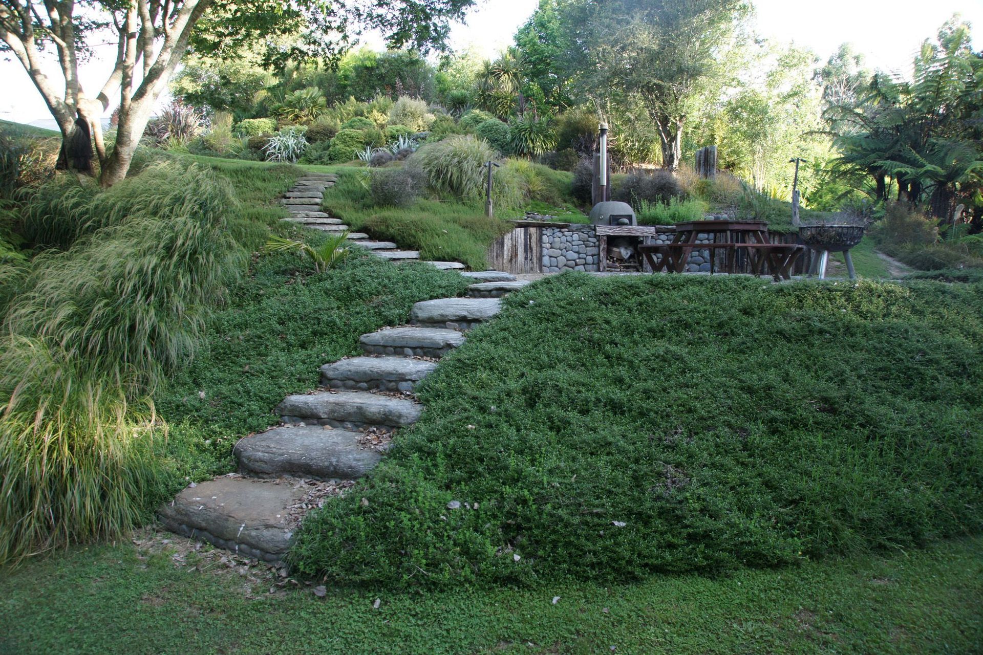 ArchiPro Project Summary - A transformative landscape project featuring erosion control, pathways, an entertainment terrace with a wood-fired pizza oven, and a stunning natural-style swimming pool, all enhanced by a diverse planting program that honors both native flora and English heritage.