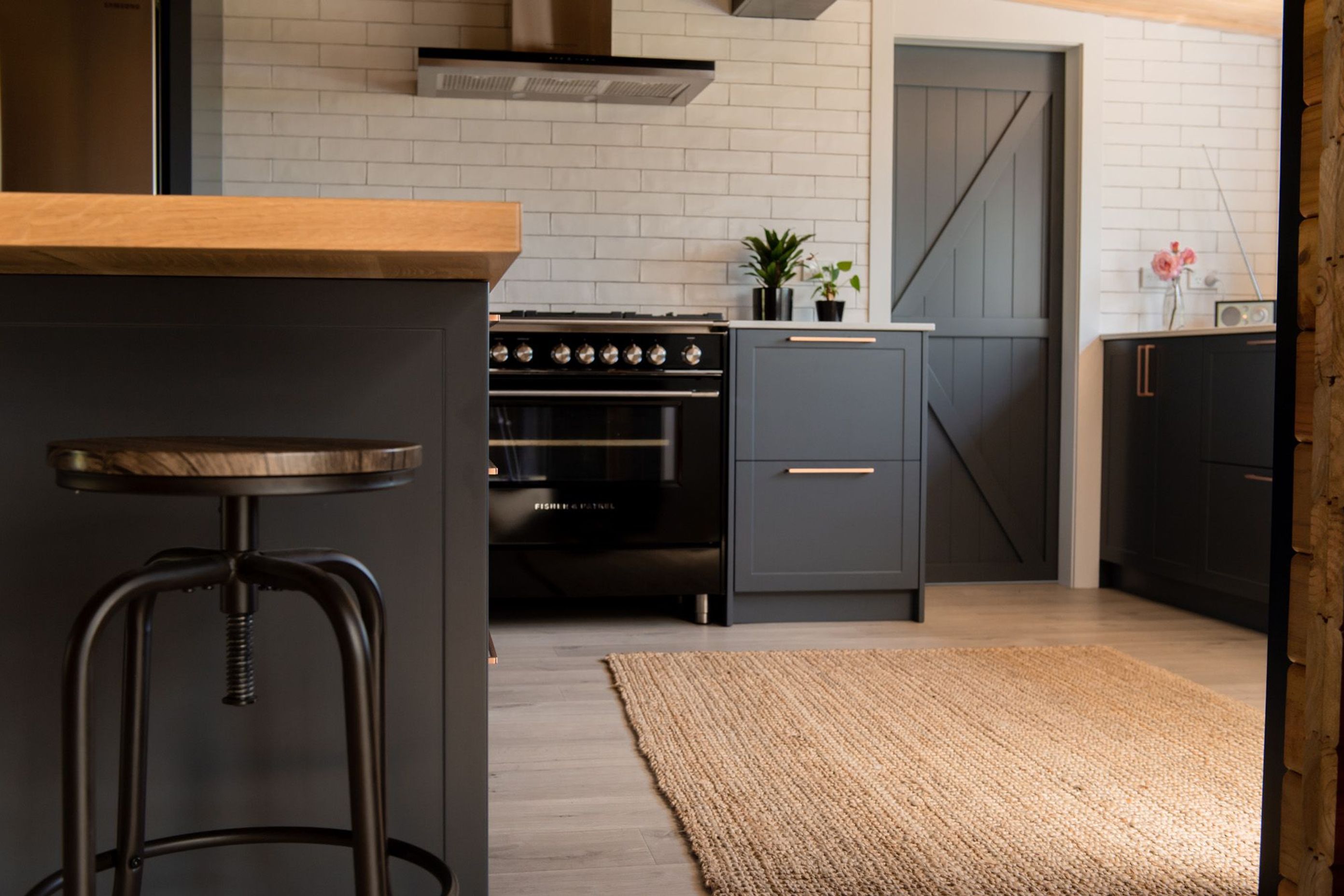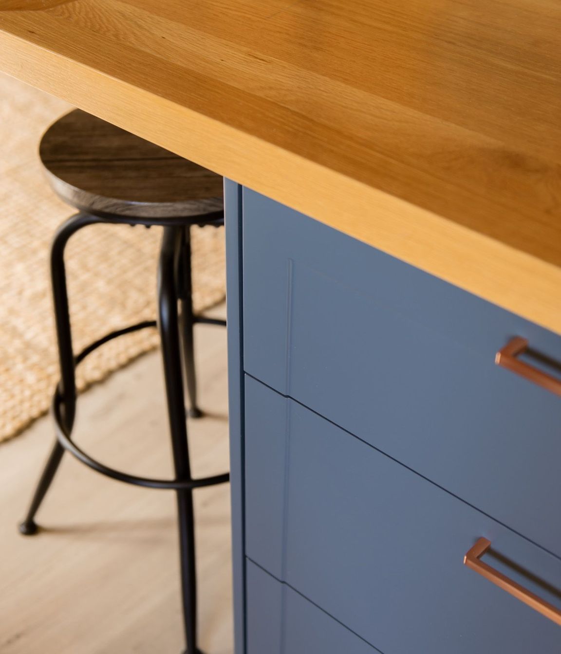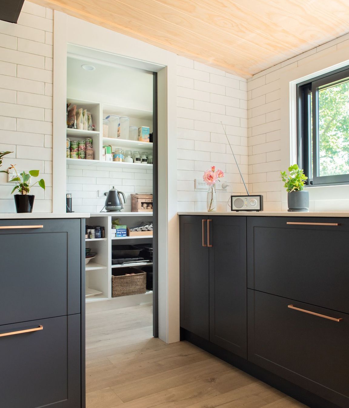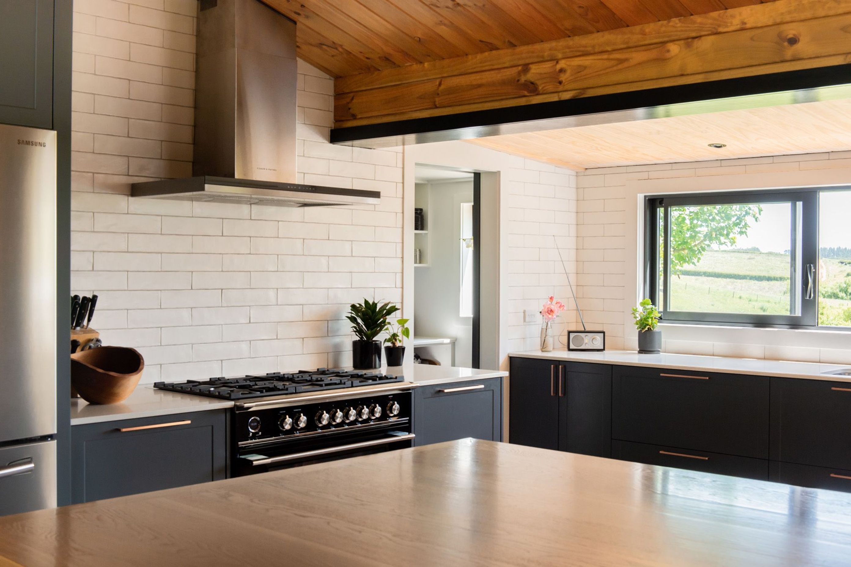 ArchiPro Project Summary - A stylish kitchen featuring navy blue cupboards, stunning copper handles, tiled walls, and engineered stone benchtops, anchored by a solid white oak timber island that serves as the central gathering point for family activities.