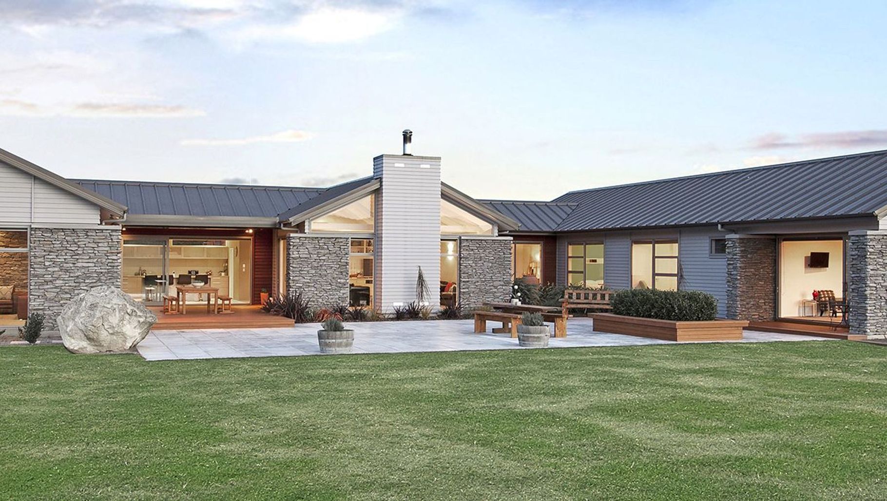 ArchiPro Project Summary - A contemporary rural house in North Canterbury, featuring stunning views, extensive glazing, and a blend of stonework and weatherboards, designed with three distinct wings for optimal living and outdoor spaces.