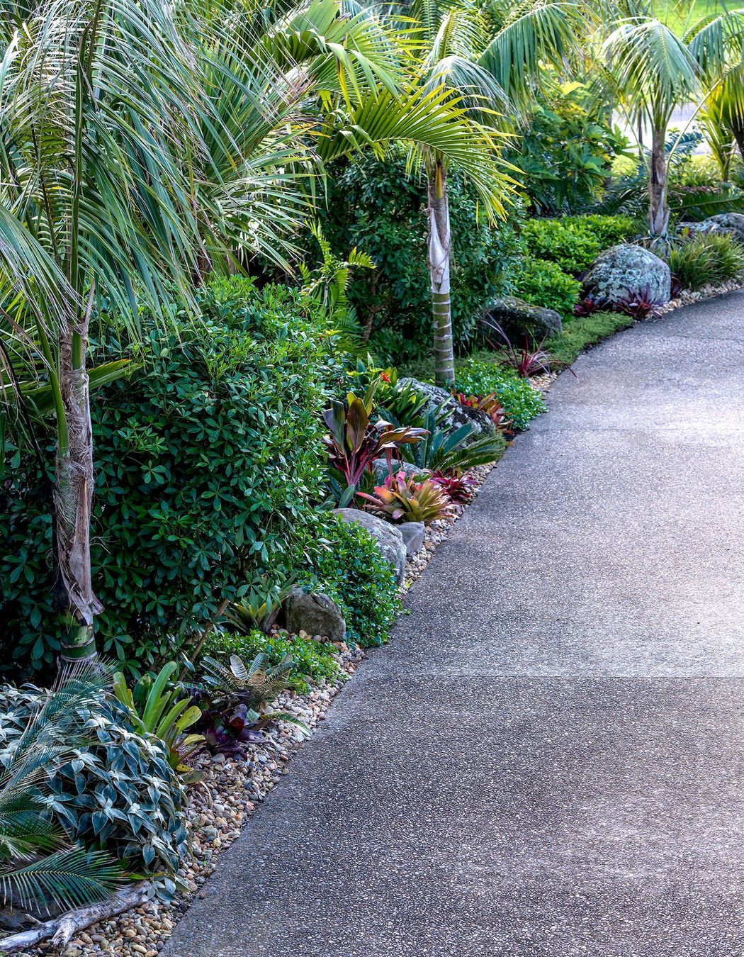 ArchiPro Project Summary - The Russell Landscape project features lush gardens, woody plants, and palm trees, creating an inviting outdoor space that enhances the estate's natural beauty.
