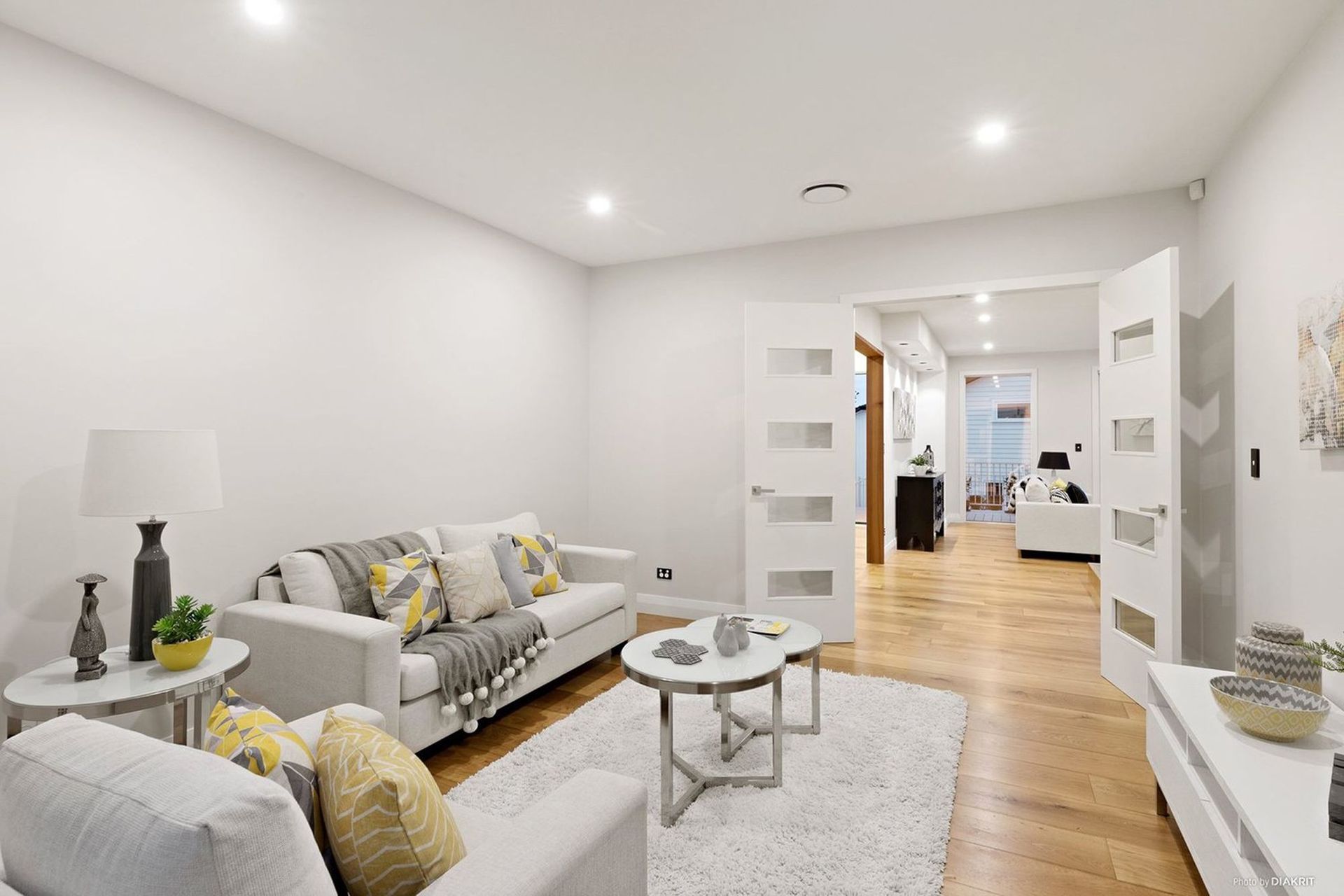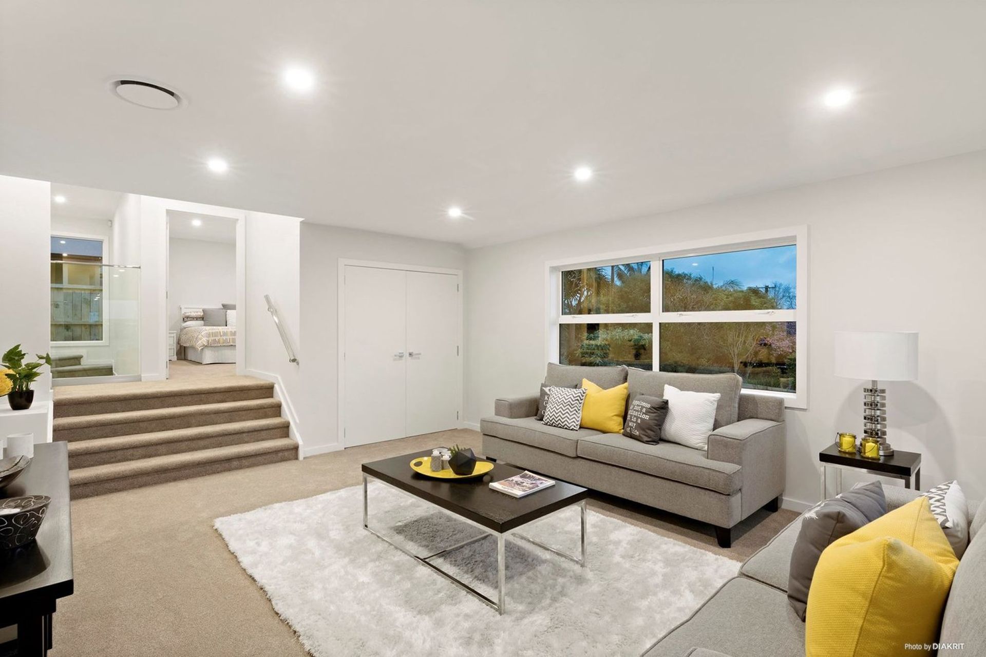 ArchiPro Project Summary - Modern split-level family home designed for a steep site, featuring 5 bedrooms, 3 living areas, and a private front yard living court, completed in 2017 as part of a 2-lot subdivision with distinct architectural appearances.