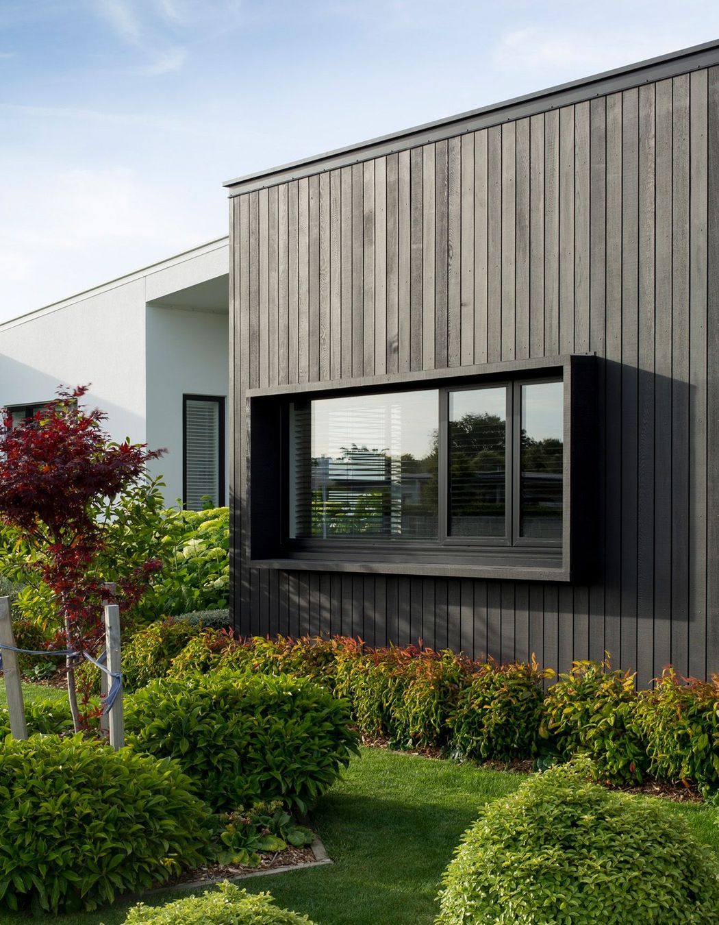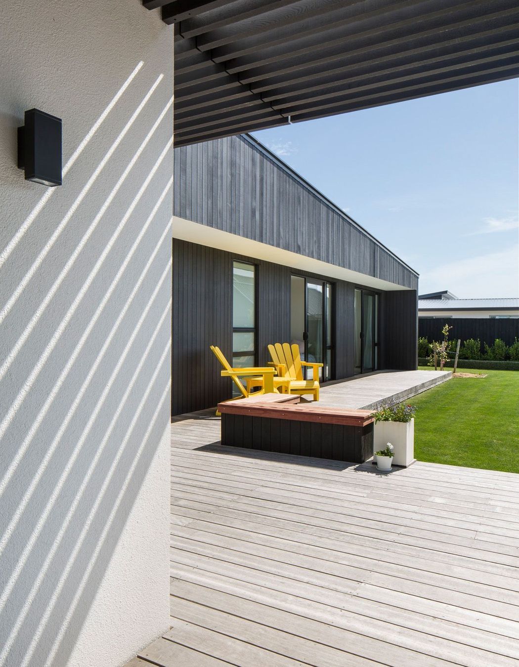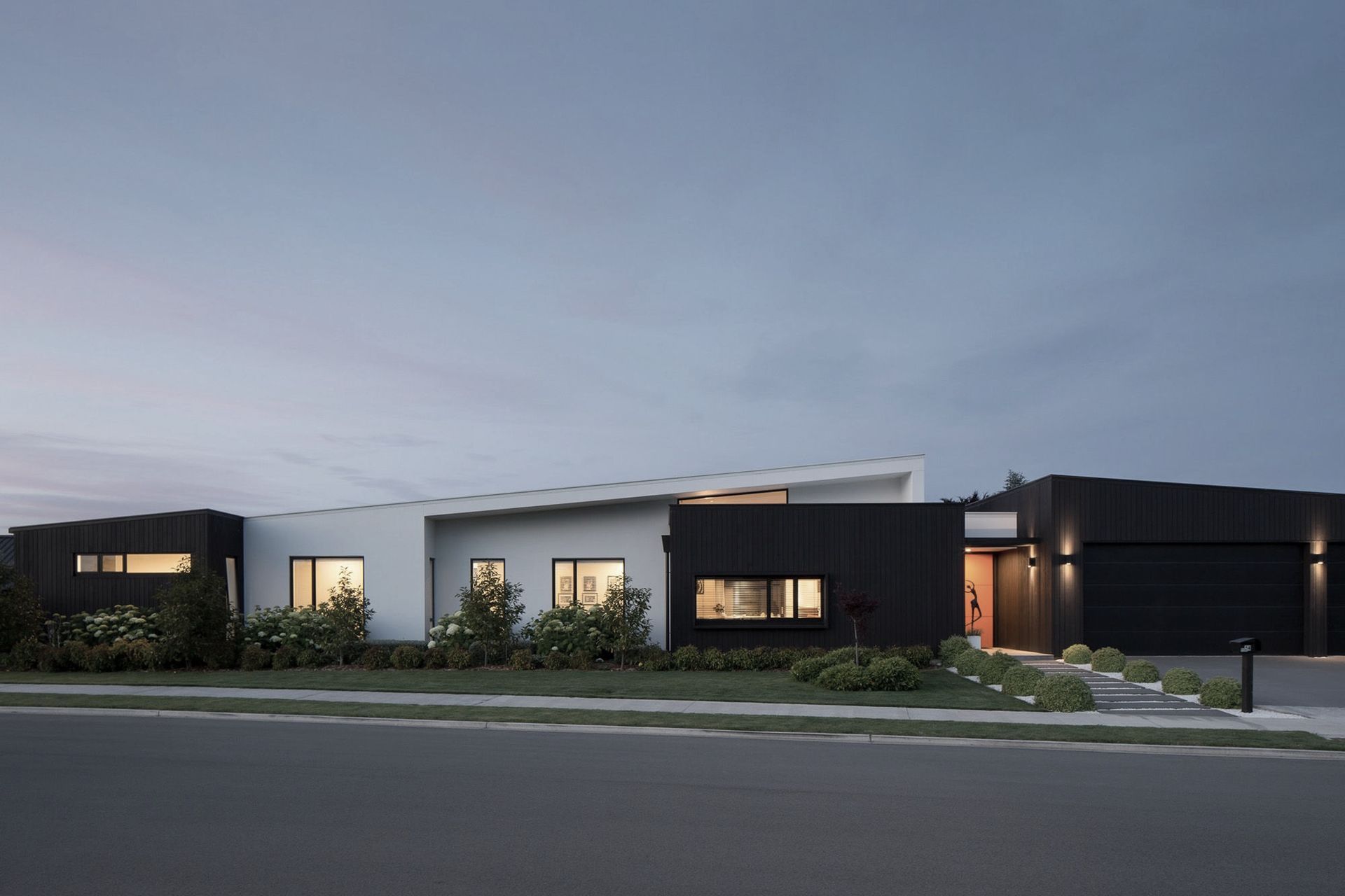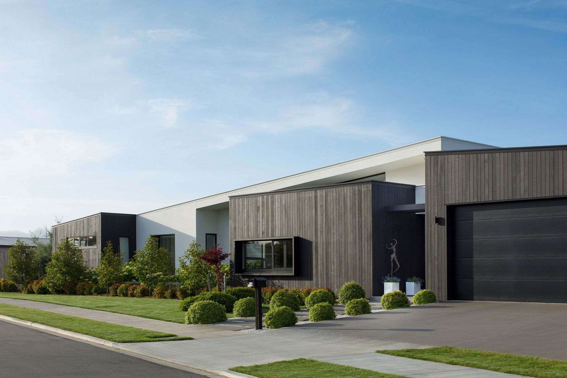 ArchiPro Project Summary - A thoughtfully designed residence featuring a blend of dark stained cedar and white Rockcote Integra, maximizing natural light and ventilation, completed in 2018 in collaboration with Hamish Ryan Construction.