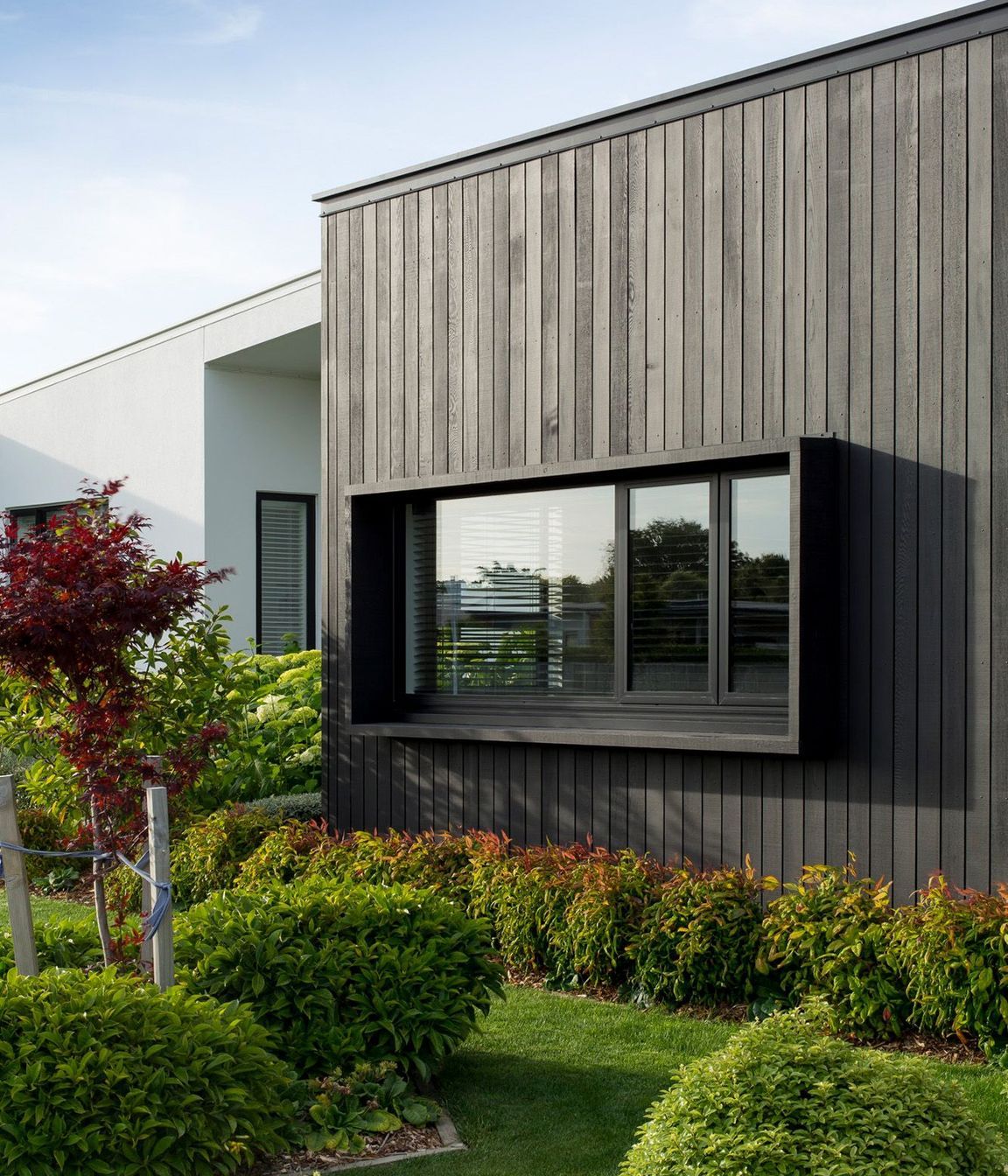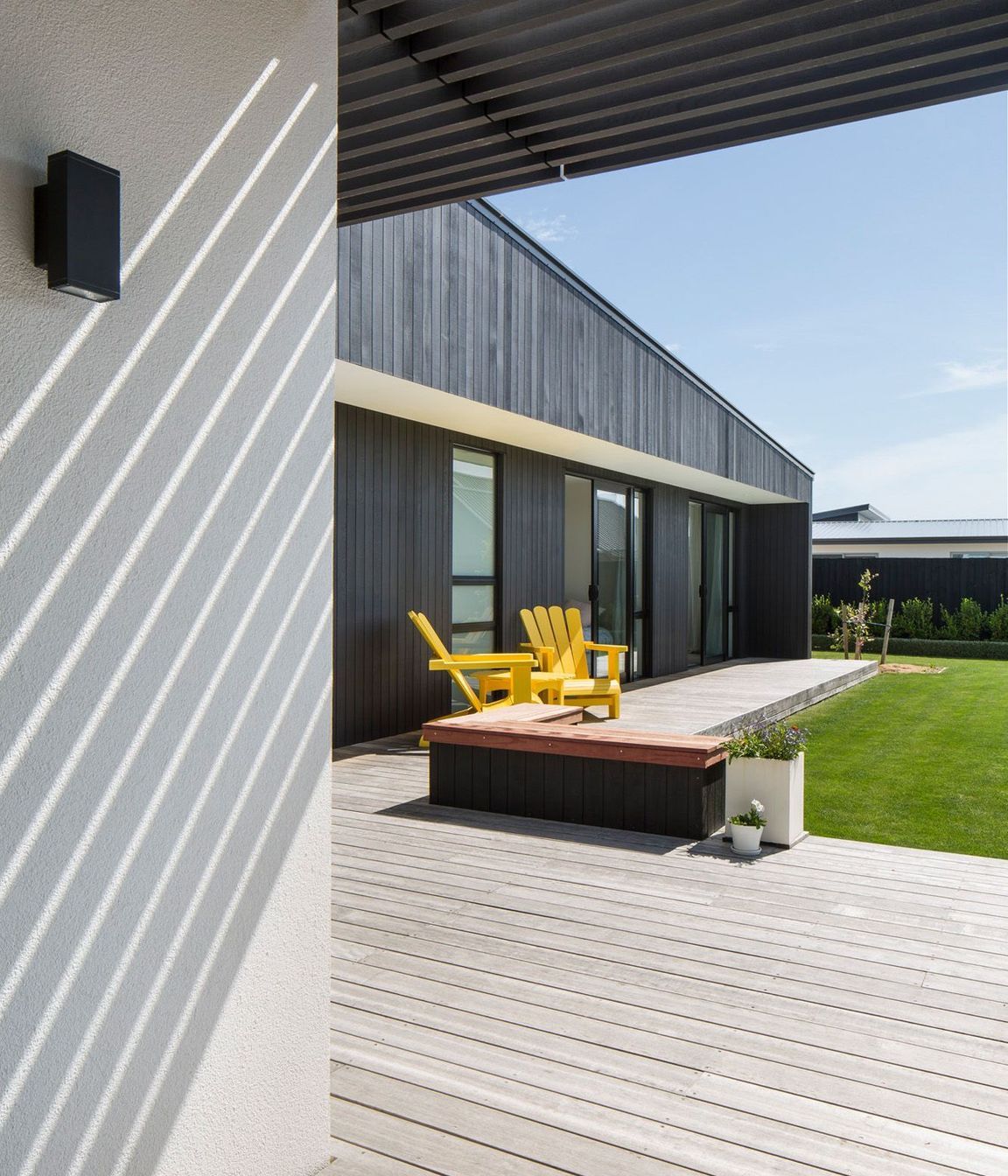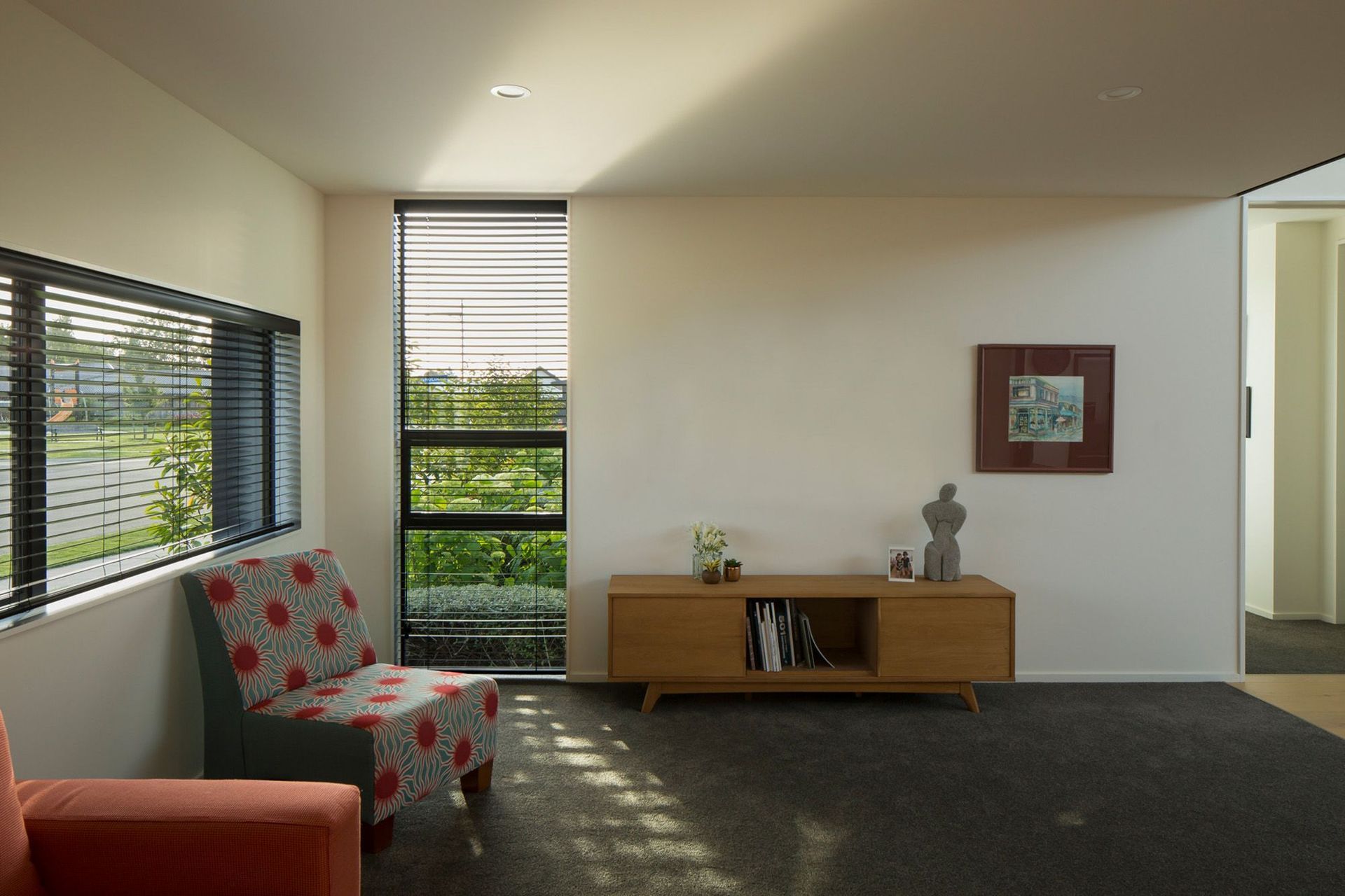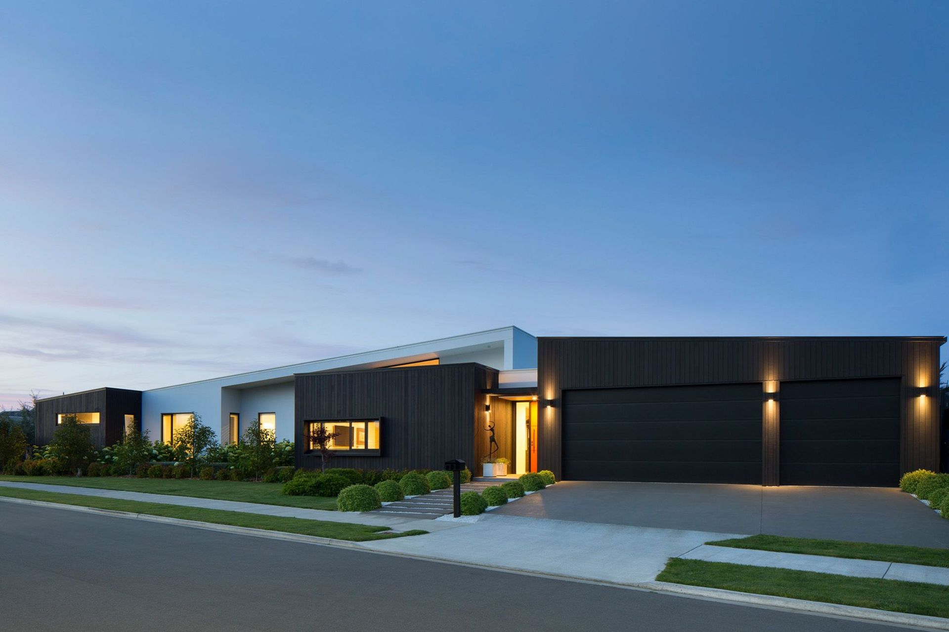 ArchiPro Project Summary - A thoughtfully designed residence featuring a blend of dark stained cedar and white Rockcote Integra, maximizing natural light and ventilation, completed in 2018 in collaboration with Hamish Ryan Construction.