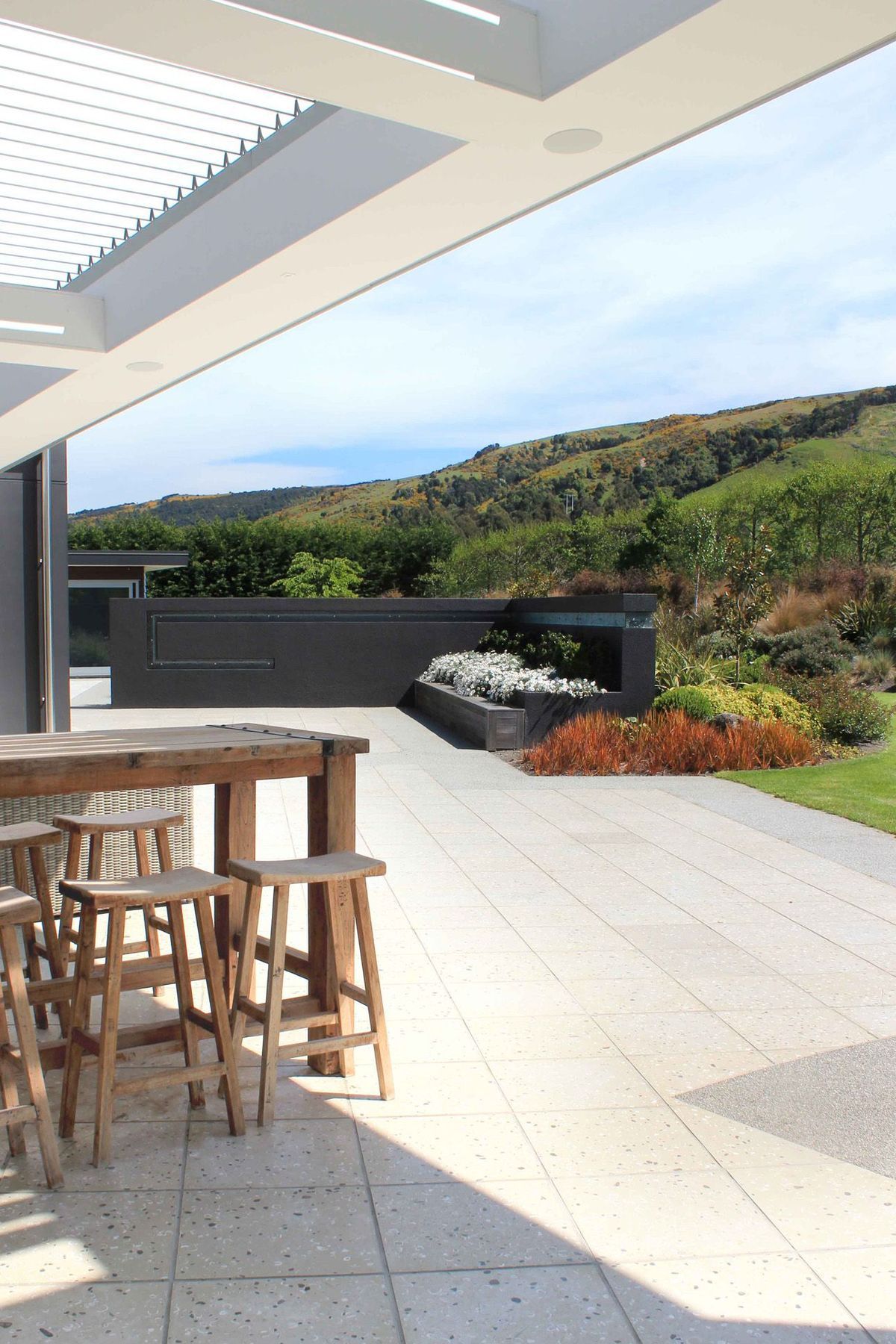 ArchiPro Project Summary - Award-winning Mosgiel garden featuring a large outdoor entertainment space, naturalistic materials, and a thoughtfully designed landscape that combines functionality with aesthetic appeal.