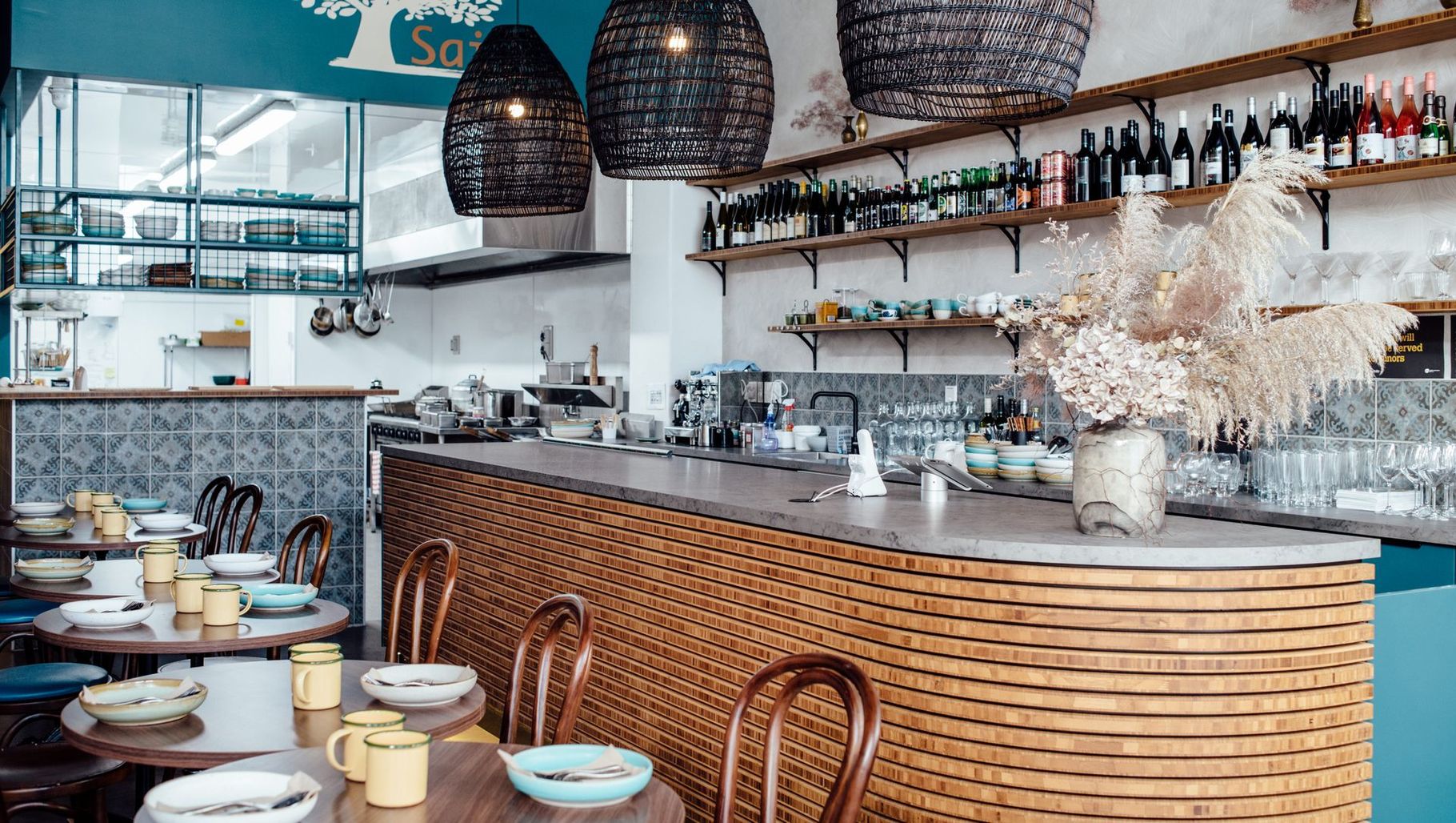 ArchiPro Project Summary - Joinery project for a popular restaurant in Napier featuring bamboo open shelving, V grooved panelling, and a sophisticated curved bar end, designed to create a modern and inviting atmosphere while withstanding the demands of a commercial environment.