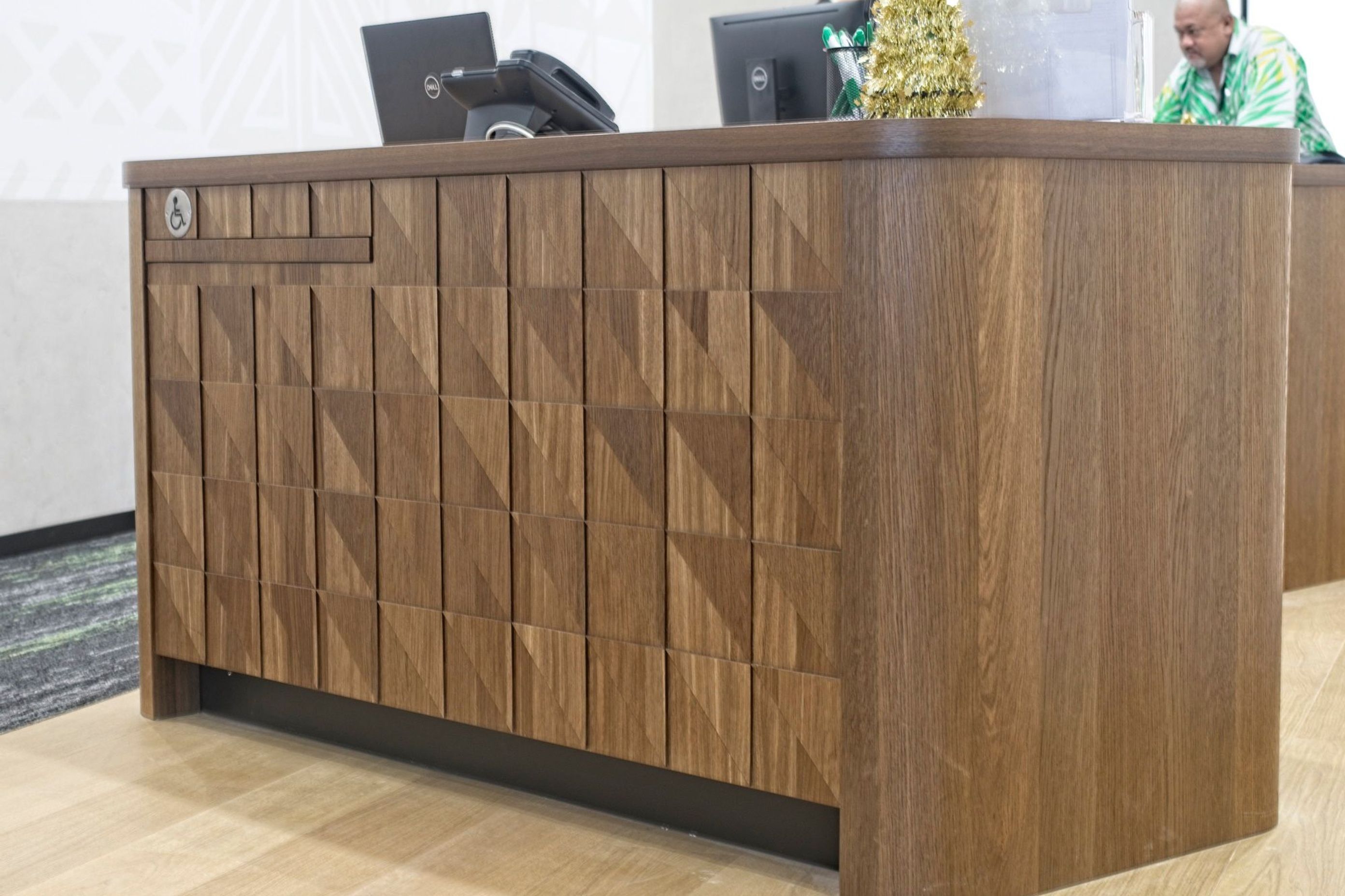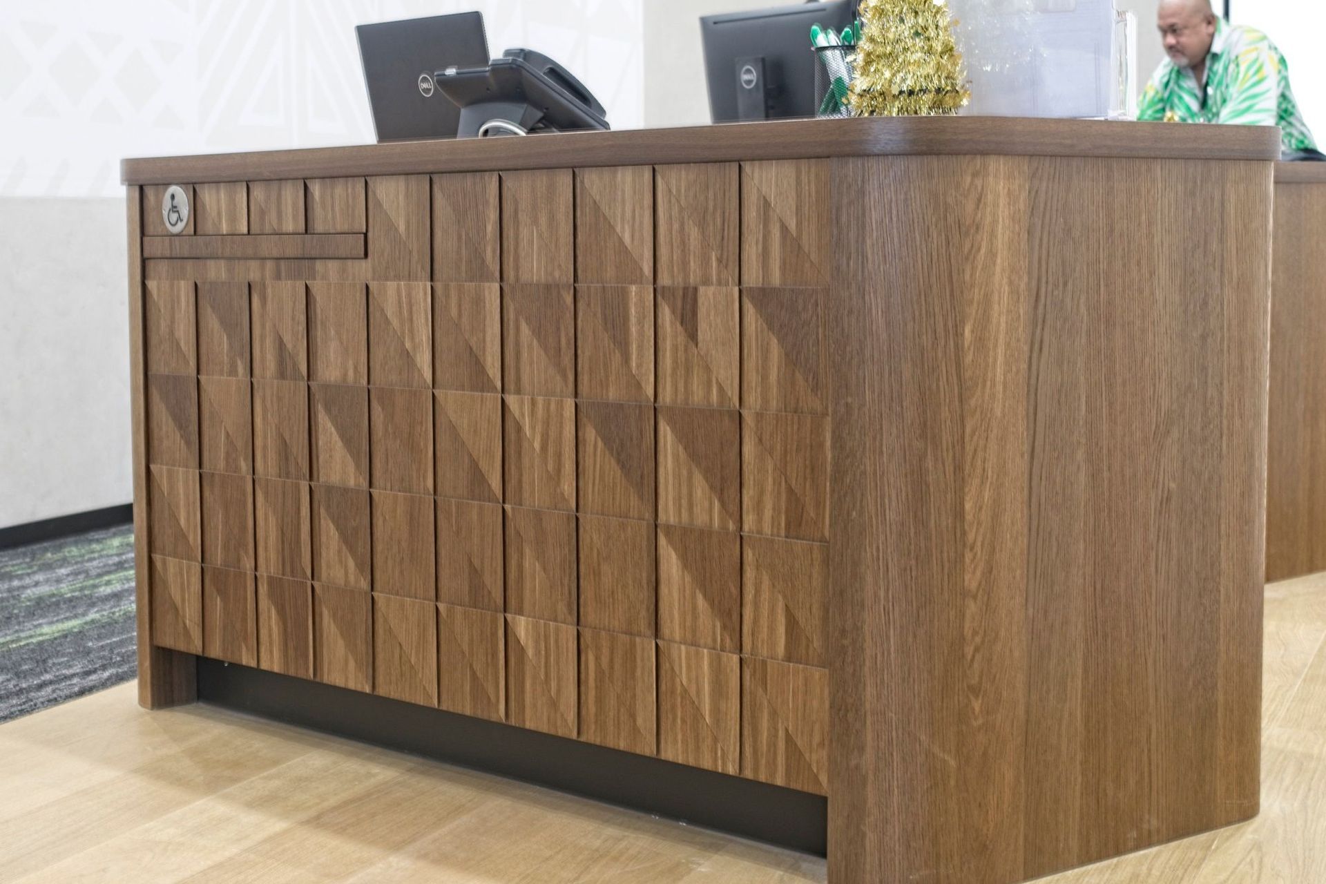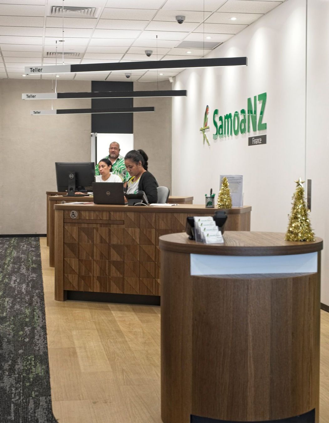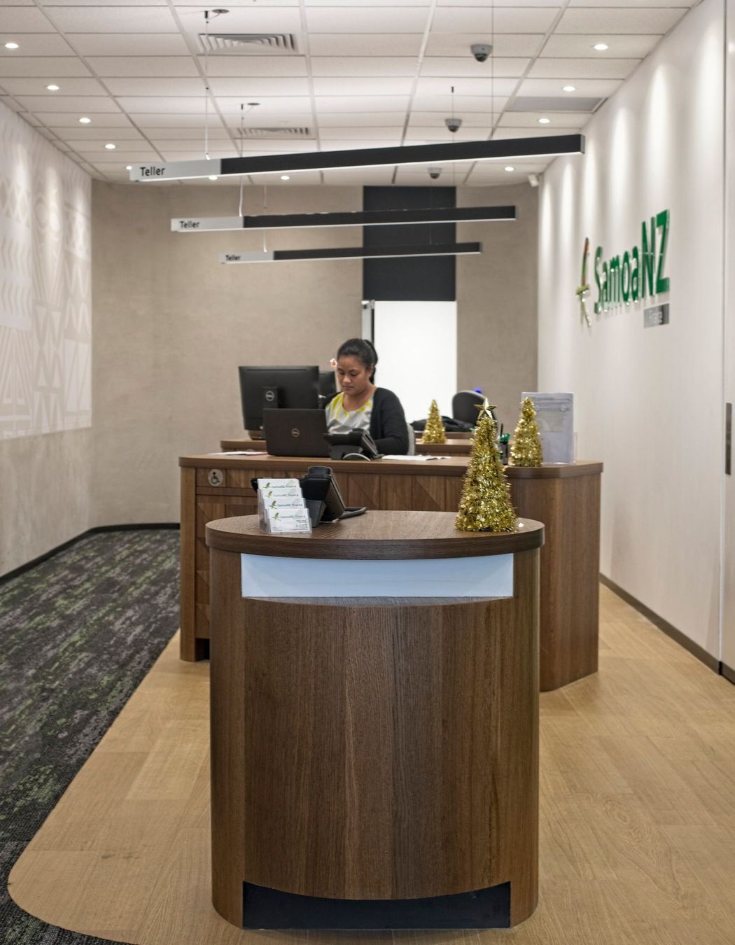 ArchiPro Project Summary - Joinery installation for Samoa NZ bank in Manukau, featuring curved veneer counters, timber wall features, and a staff kitchenette, all crafted in collaboration with a local architect to bring an innovative design to life.
