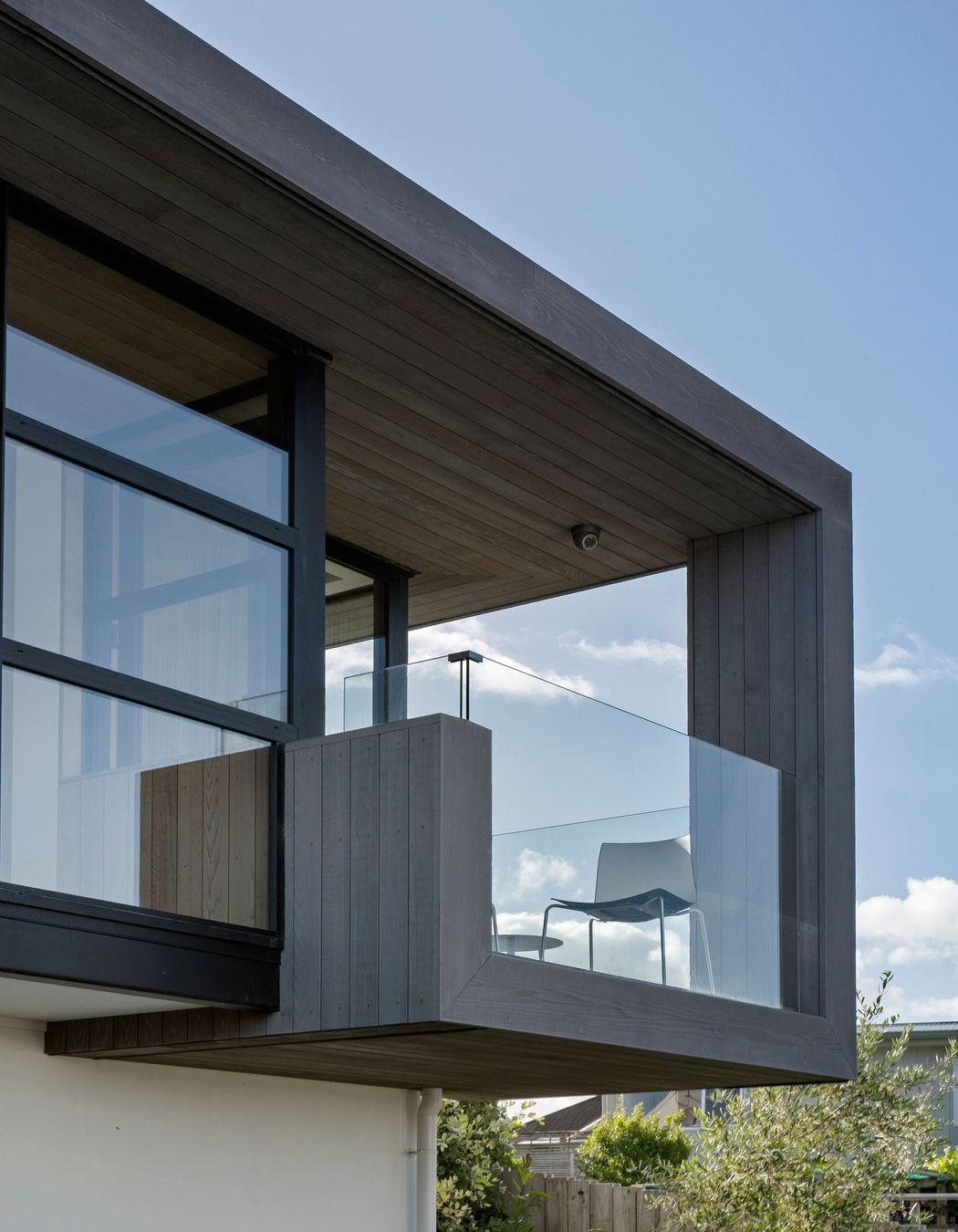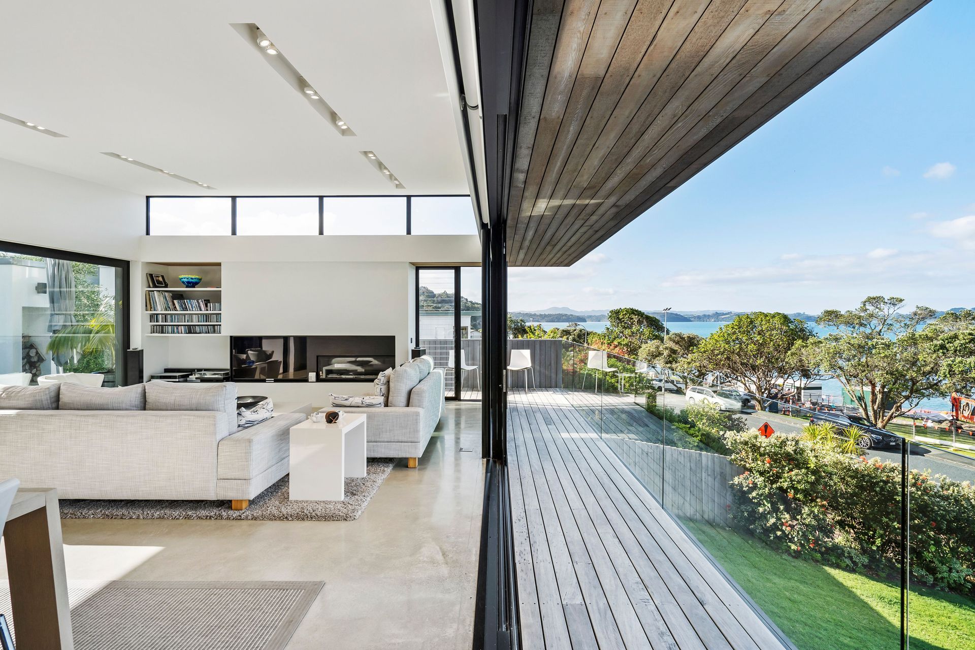 The architect says, “We have lifted the house up well above the street to allow for the use of large floor-to-ceiling glass sliding doors with an uninterrupted outlook to the water. The narrow balcony across the street front has a frameless glass balustrade and creates connection to the sea frontage, allowing for amazing ventilation through the living space without looking into the back end of a row of furniture.”