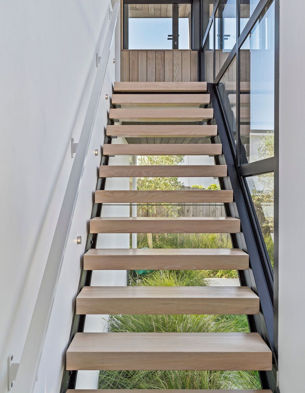 Julian points out the rather unusual, unique floating staircase that leads up to the bedroom. “We wanted to do something special with the stairwell, so we have designed an open tread staircase that is encased by glass both underneath and down the side, creating a connection to the outdoors and enforcing the idea that the entrance to the master is an exterior link.”