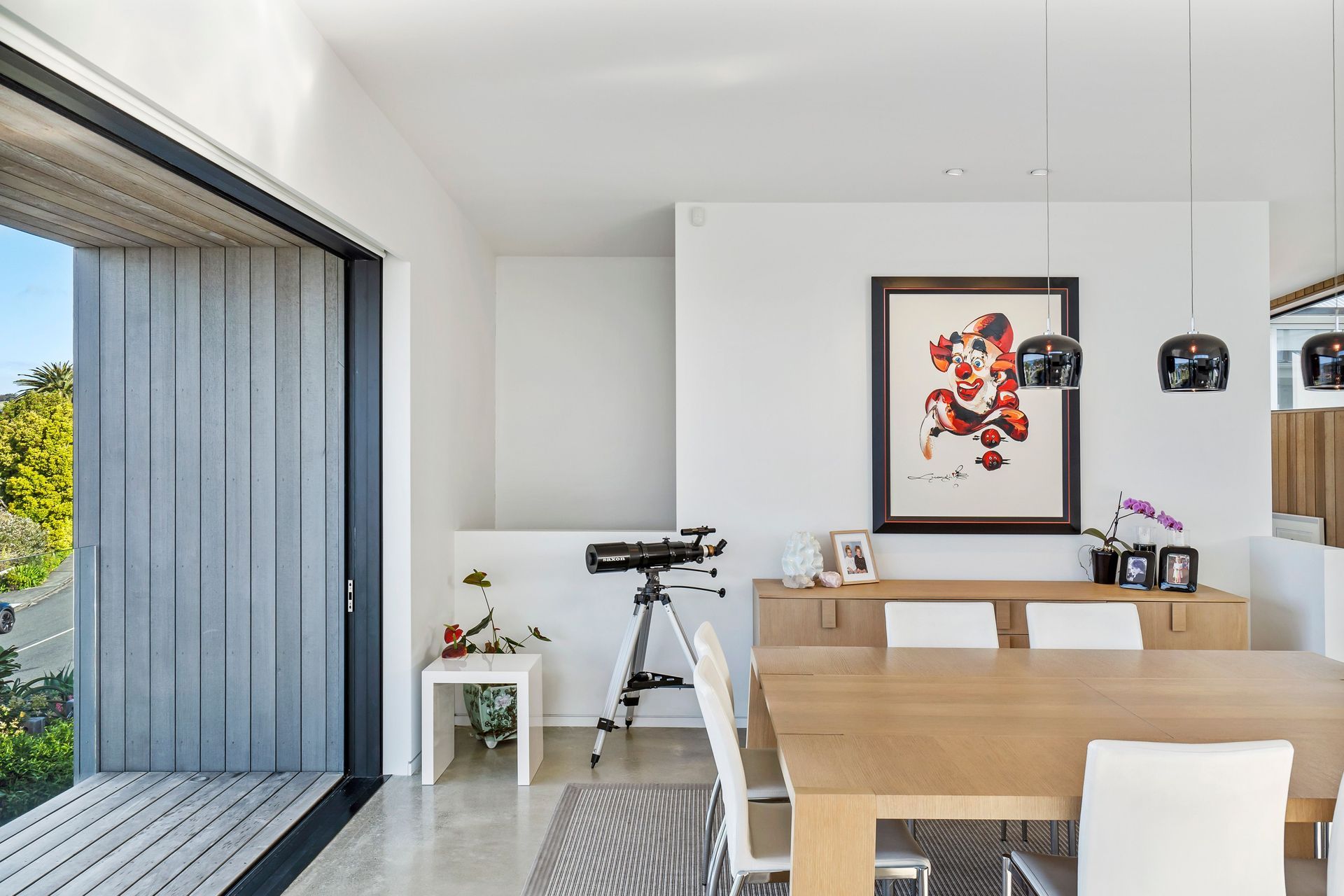 Links between outside and in are brought through in this room with a feature wall crafted of the same cedar cladding that has been used on the exterior, while a low rectangular feature window offers enticing glimpses of the bay from the comfort of the couch.