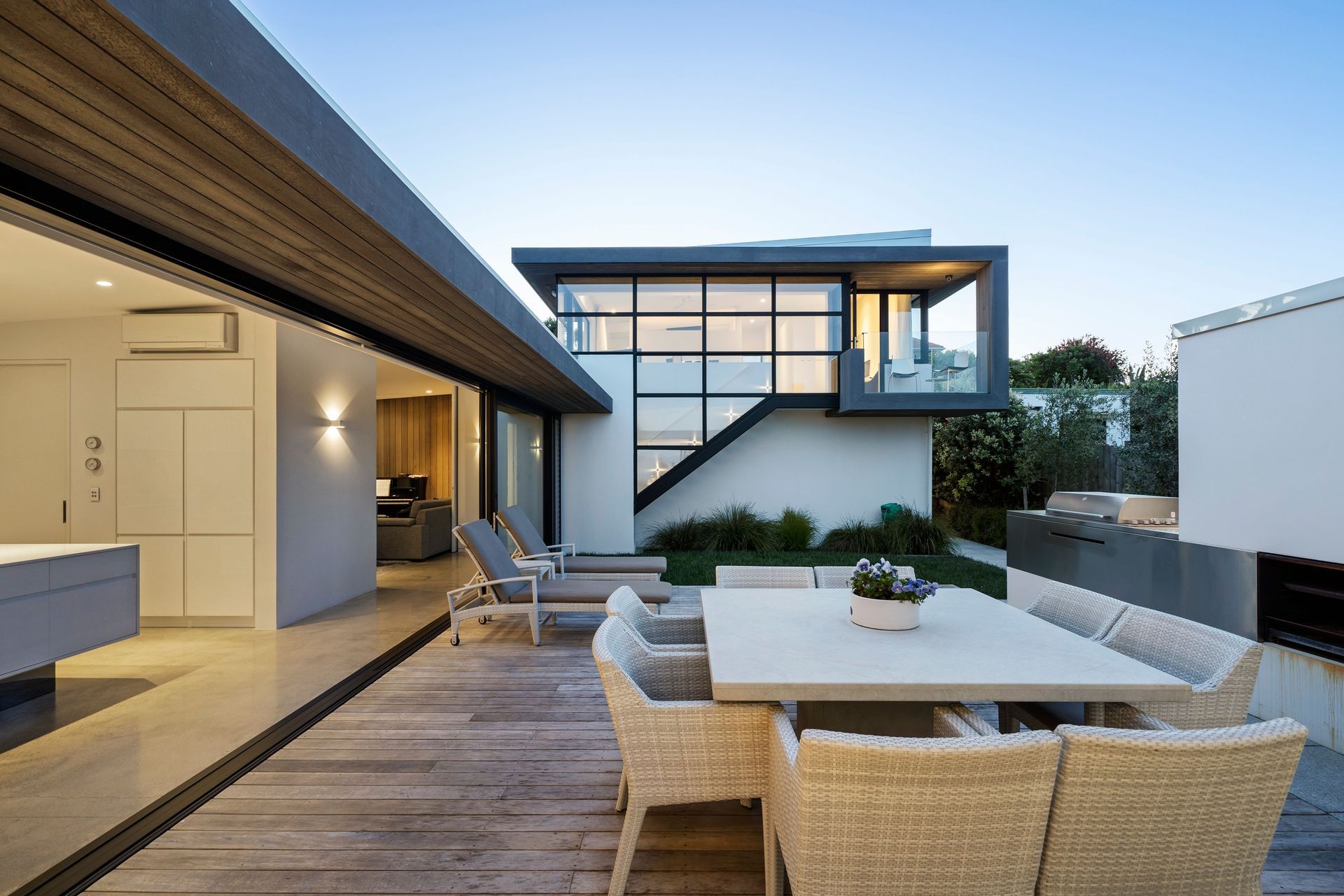 The central courtyard becomes a sheltered, sunny outdoor area where the large glass sliders on both the north and the west can be left open or closed up depending on the weather and location of the sun. The space is sheltered from cold breezes and is extremely private but also enables connection with the ocean via a direct view out through the living space, says Guthrie.