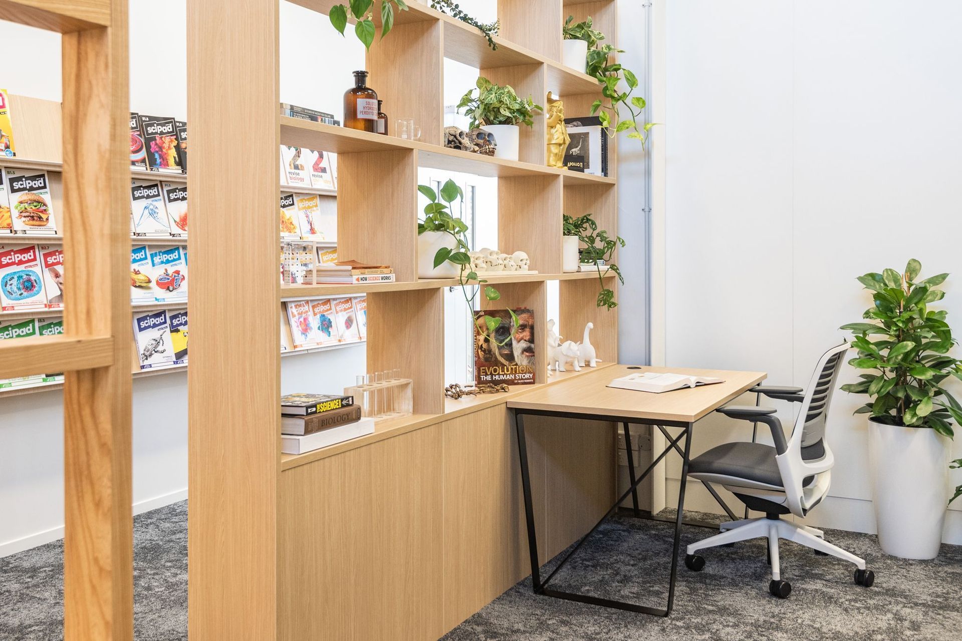 ArchiPro Project Summary - A dynamic office fitout for SciPad, blending functionality and aesthetics with warm timbers, greenery, and thoughtful design elements to create an inspiring workspace for a diverse team in the scientific education sector.