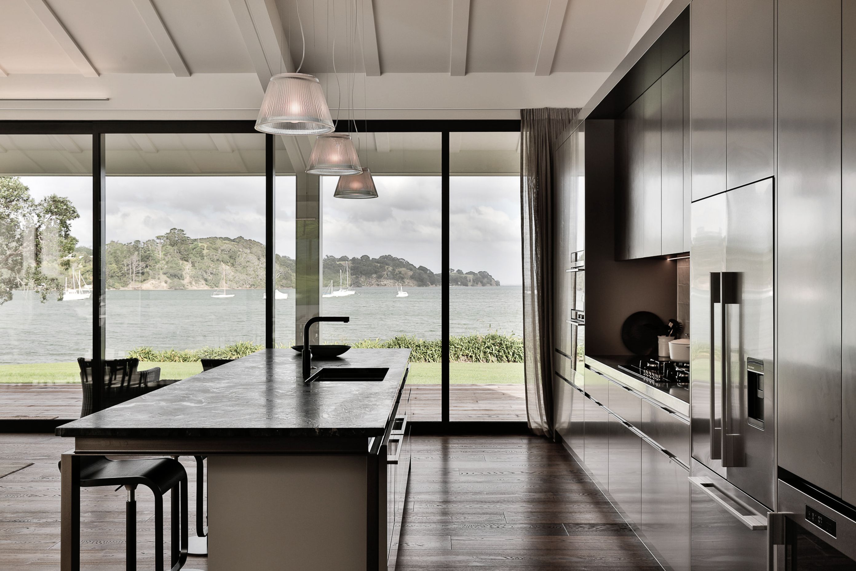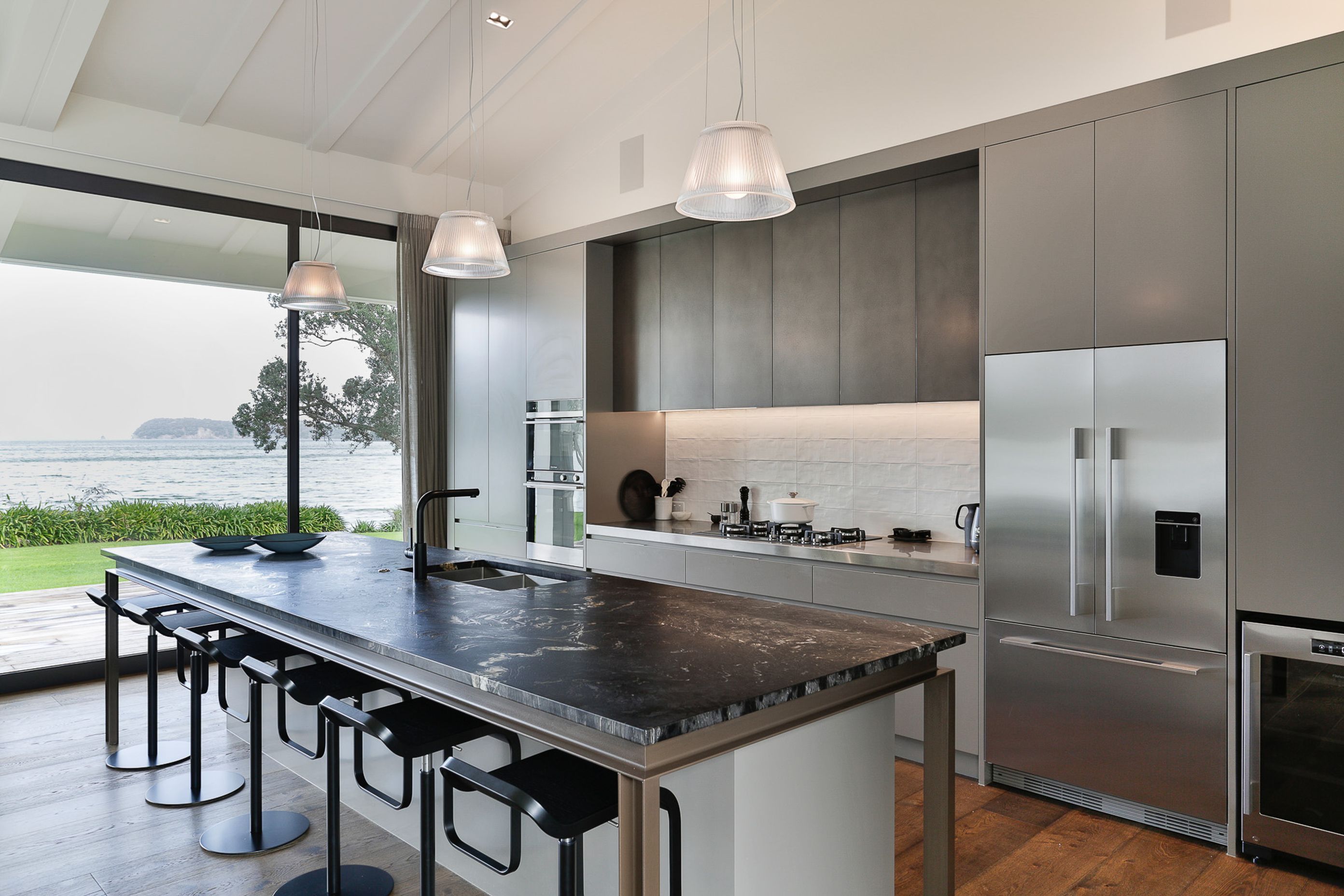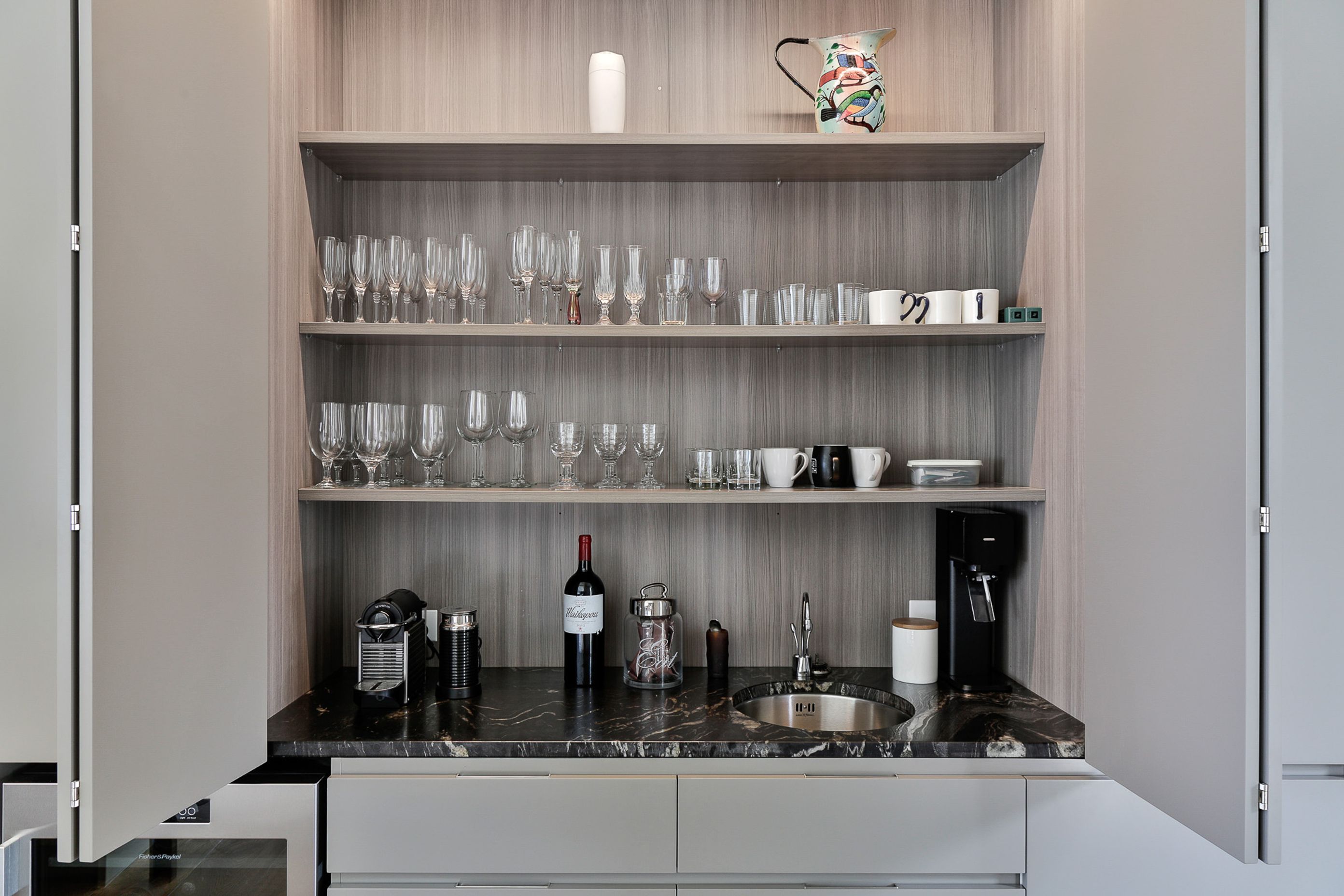 ArchiPro Project Summary - Contemporary kitchen harmoniously designed for a coastal home, featuring symmetrical cabinetry, a functional pantry, and a refined palette of taupe grey and bronzed metallic finishes.
