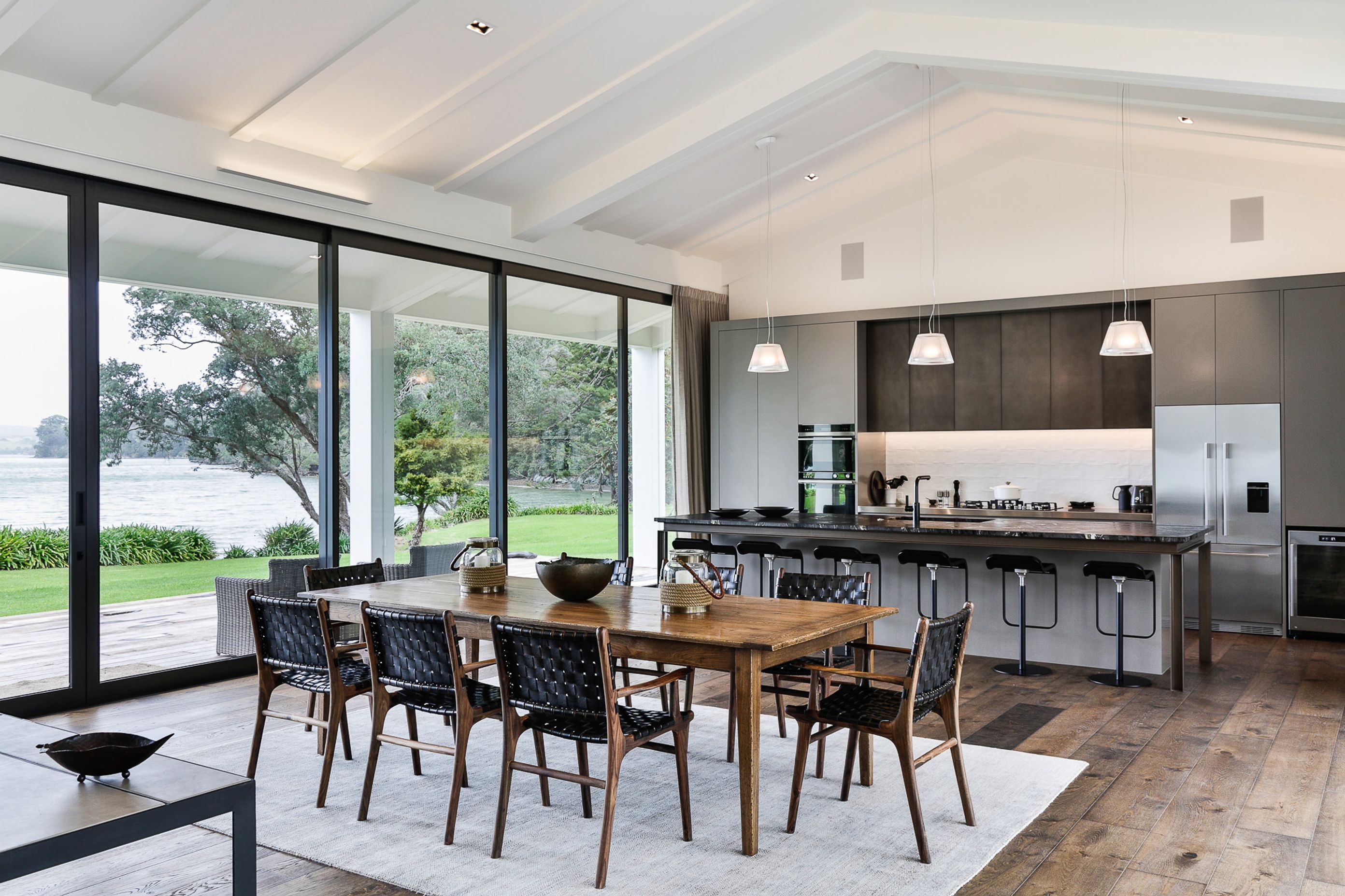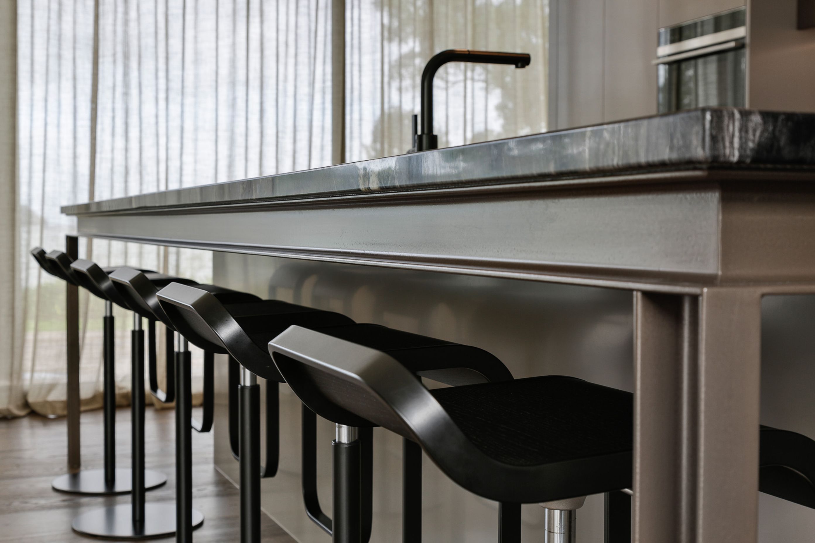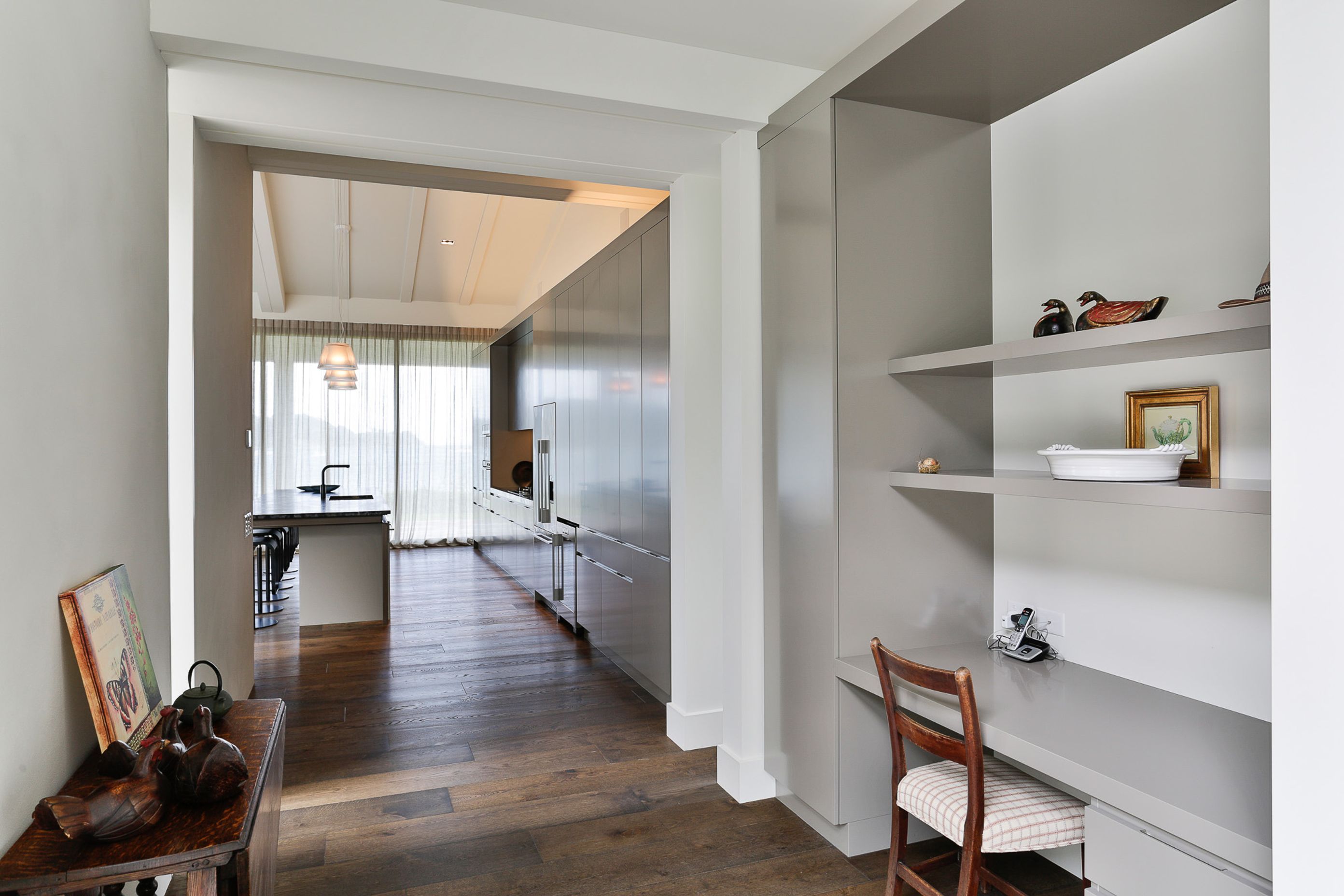 ArchiPro Project Summary - Contemporary kitchen harmoniously designed for a coastal home, featuring symmetrical cabinetry, a functional pantry, and a refined palette of taupe grey and bronzed metallic finishes.
