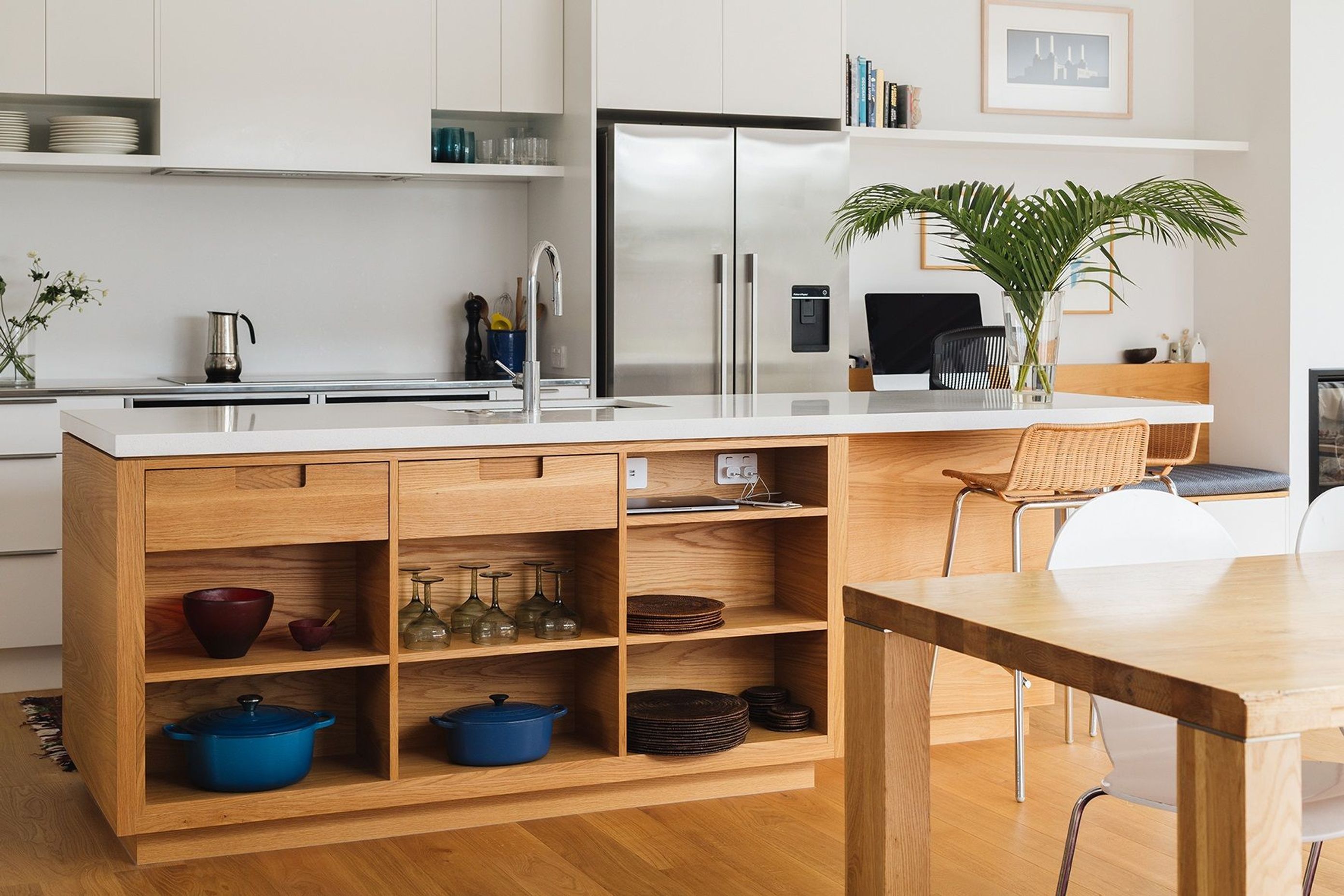 Two complimentary benchtop surfaces — we used a slim profile stainless steel around the hob and Caesarstone from Laminex for the island. Kitchen and custom joinery by Honour Creative.
