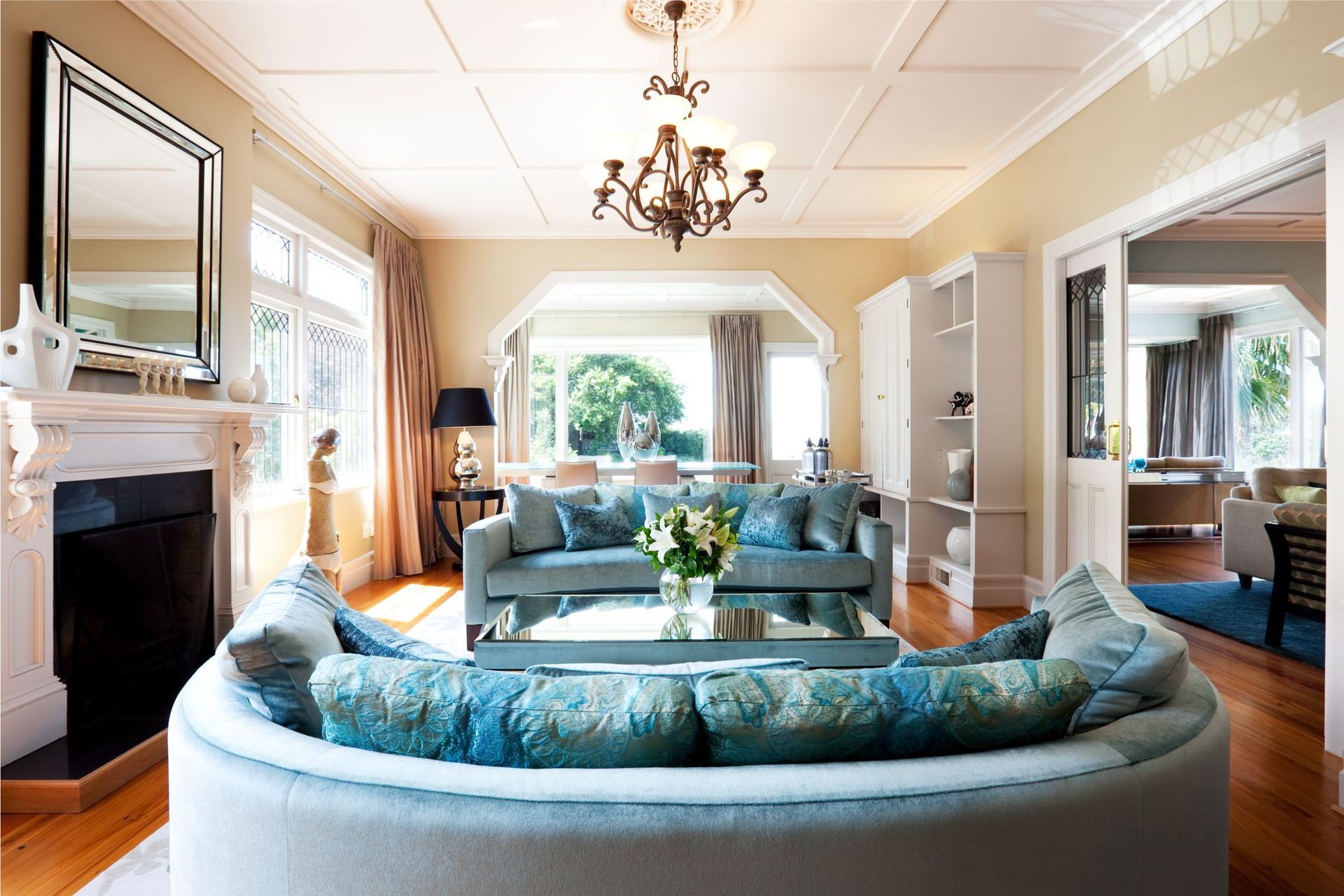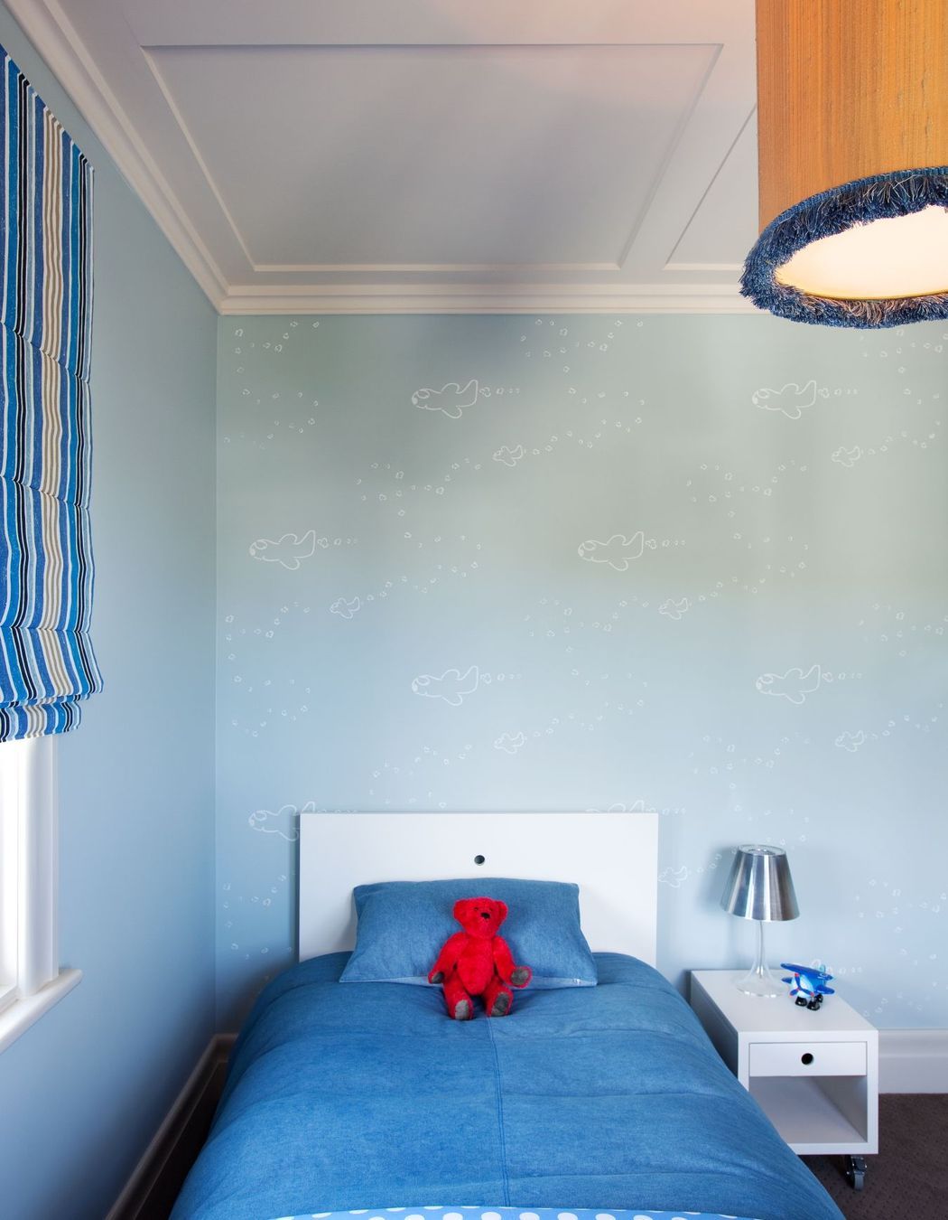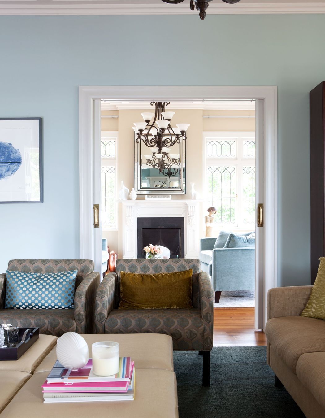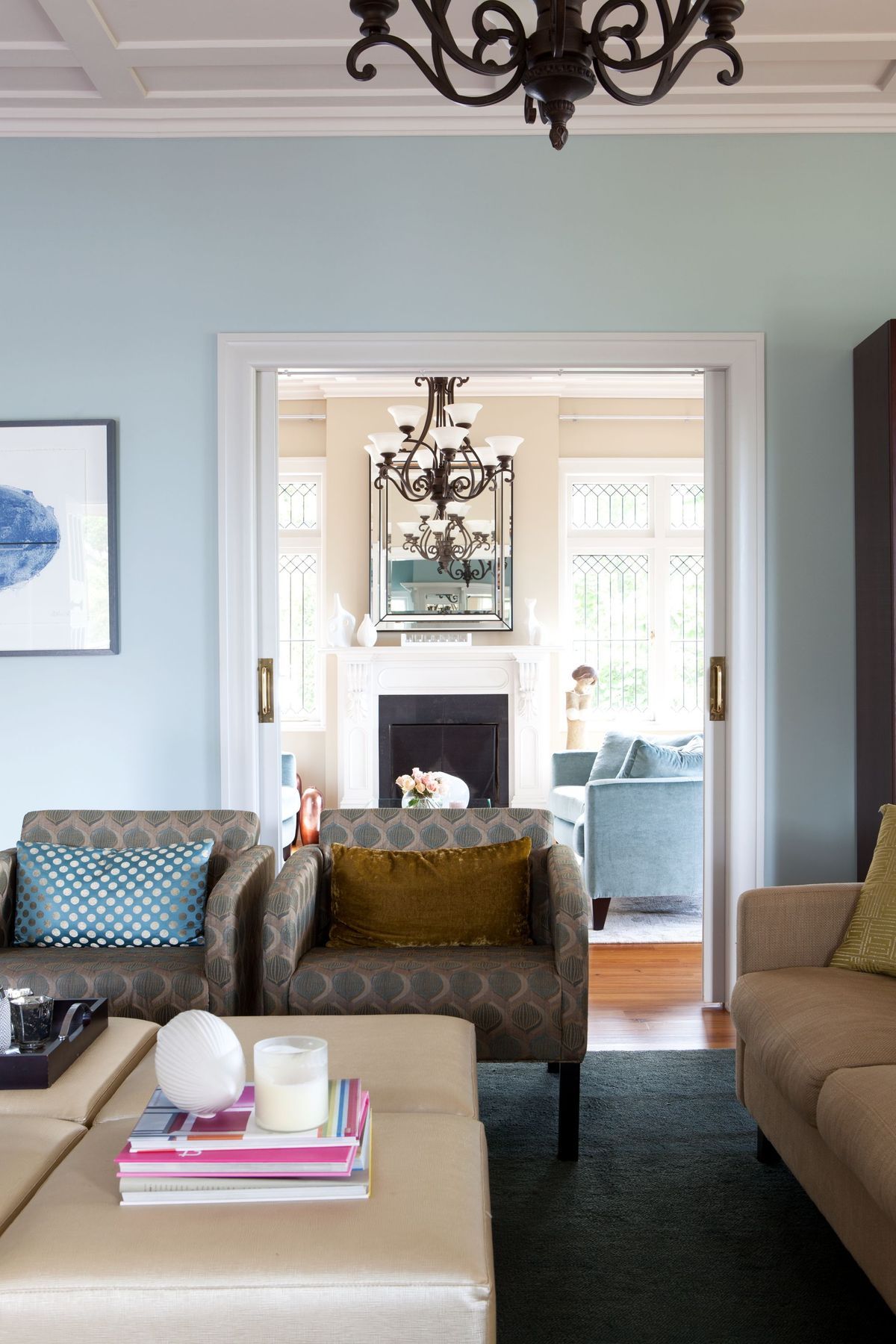 ArchiPro Project Summary - A vibrant transformation of a family home featuring a new color palette, layered furnishings, and custom designs for living areas and bedrooms, including a formal living room with pale blue velvet sofas and a guest bedroom adorned with Designers Guild wallpaper.