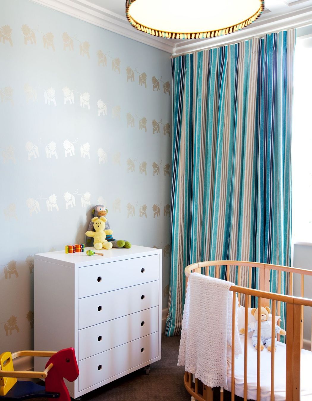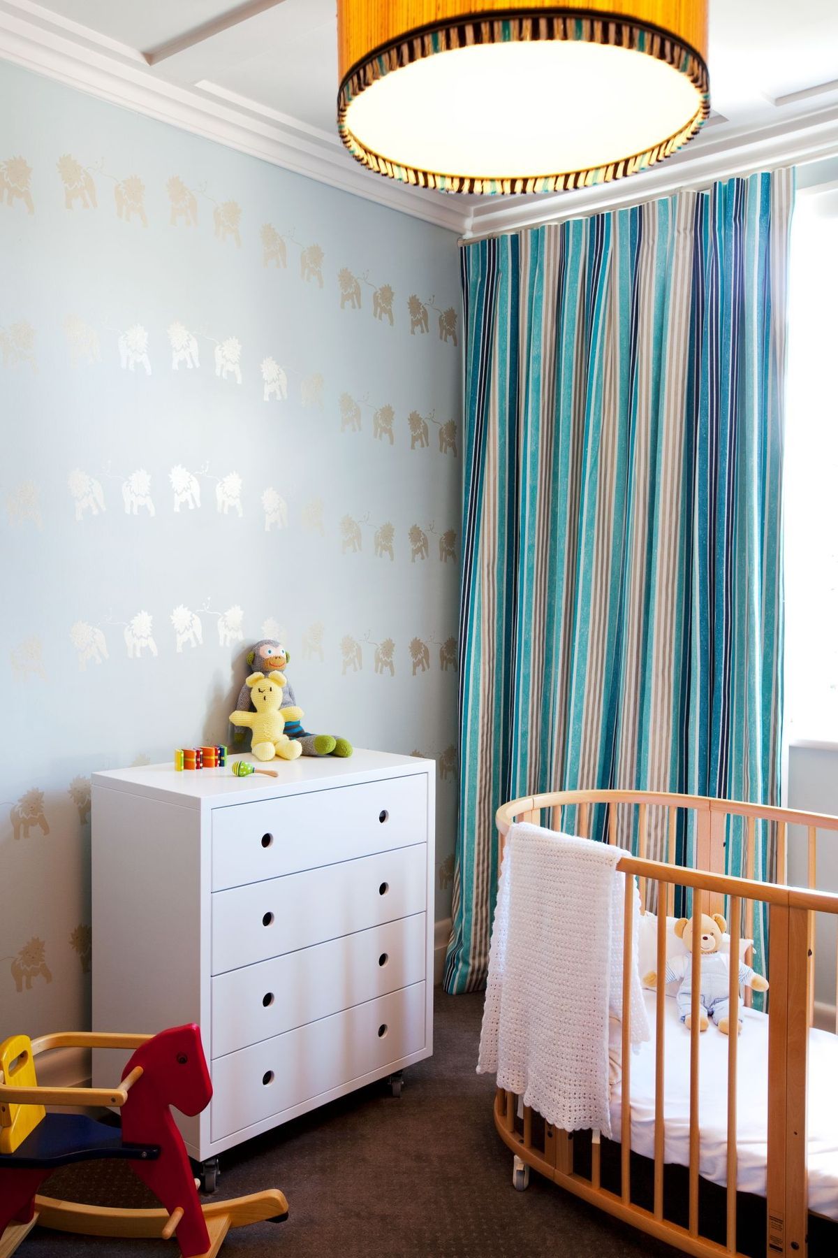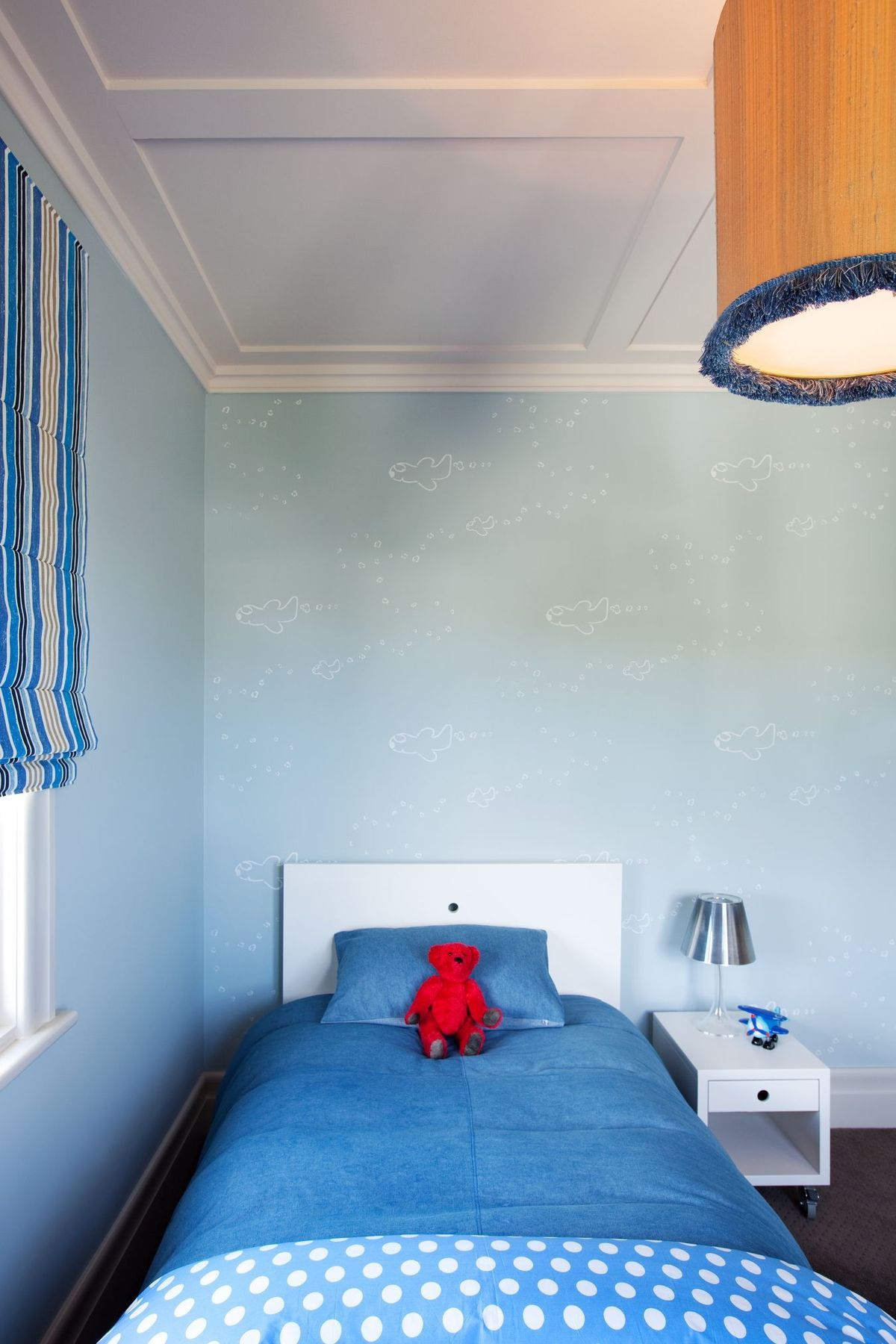 ArchiPro Project Summary - A vibrant transformation of a family home featuring a new color palette, layered furnishings, and custom designs for living areas and bedrooms, including a formal living room with pale blue velvet sofas and a guest bedroom adorned with Designers Guild wallpaper.