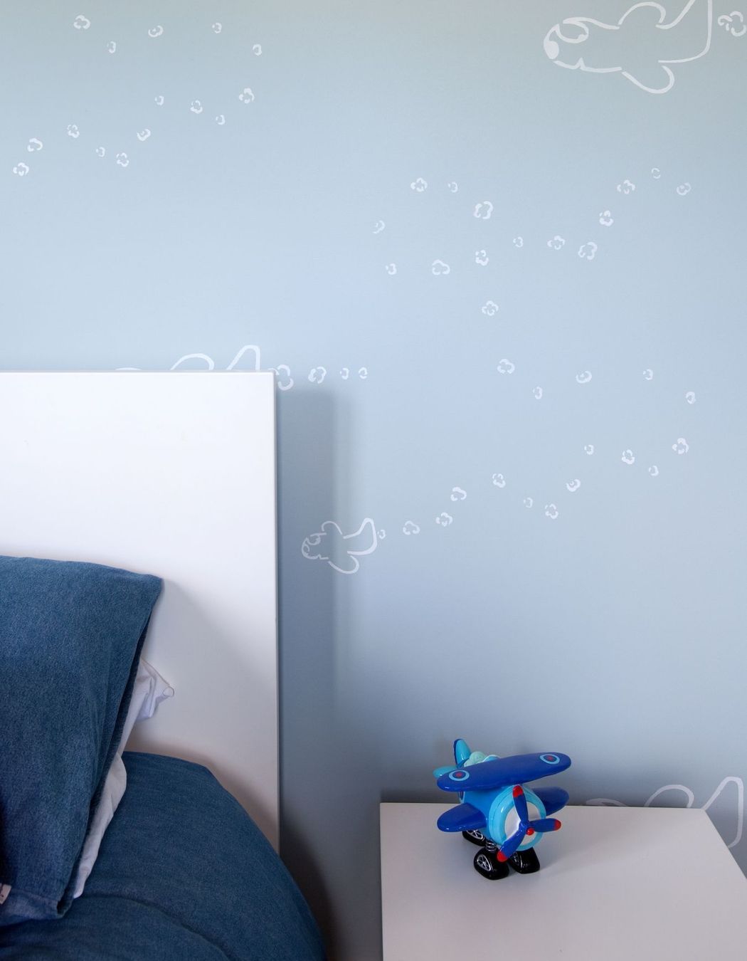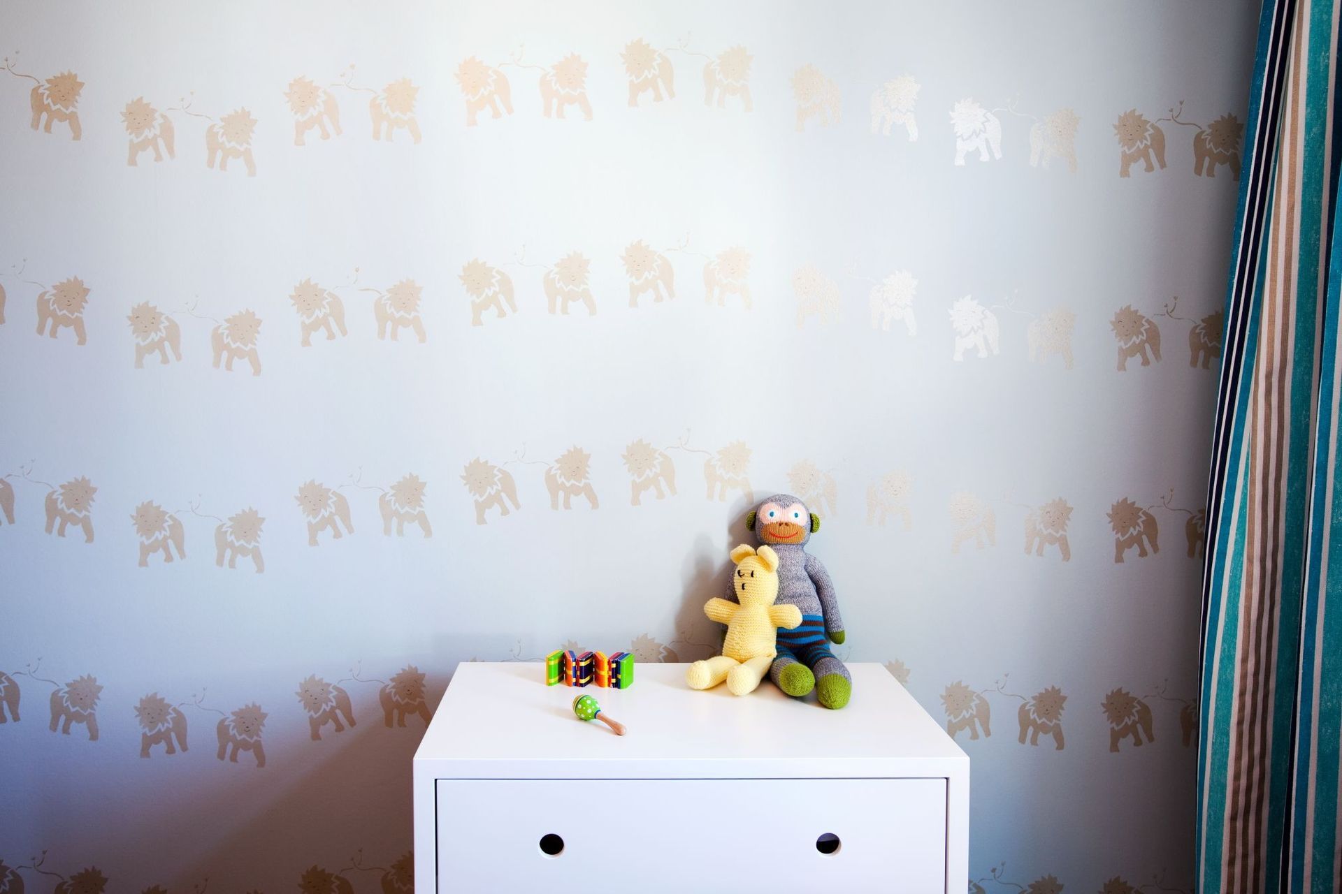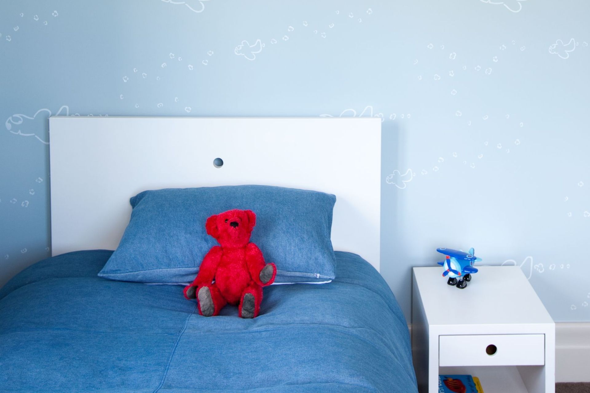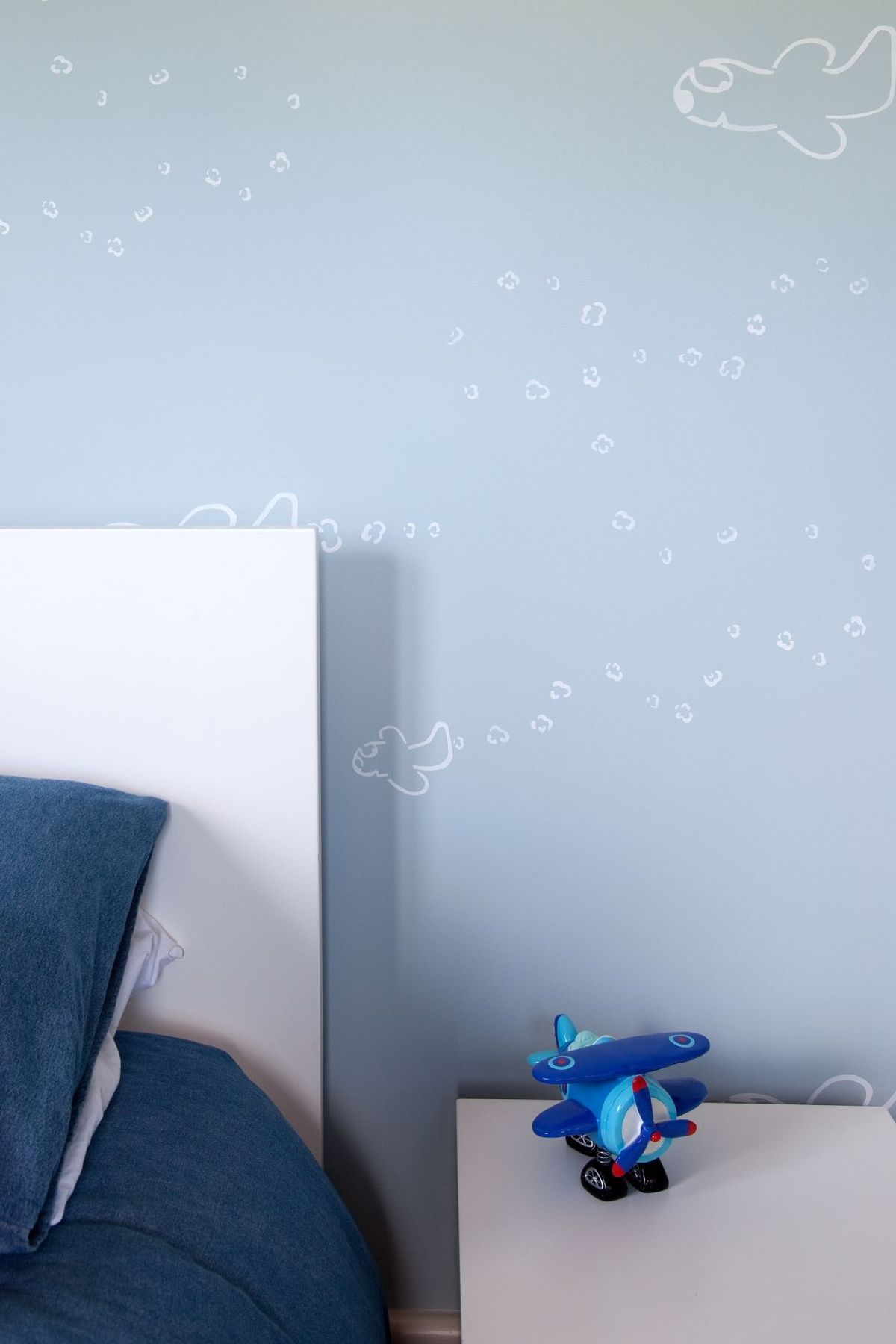 ArchiPro Project Summary - A vibrant transformation of a family home featuring a new color palette, layered furnishings, and custom designs for living areas and bedrooms, including a formal living room with pale blue velvet sofas and a guest bedroom adorned with Designers Guild wallpaper.