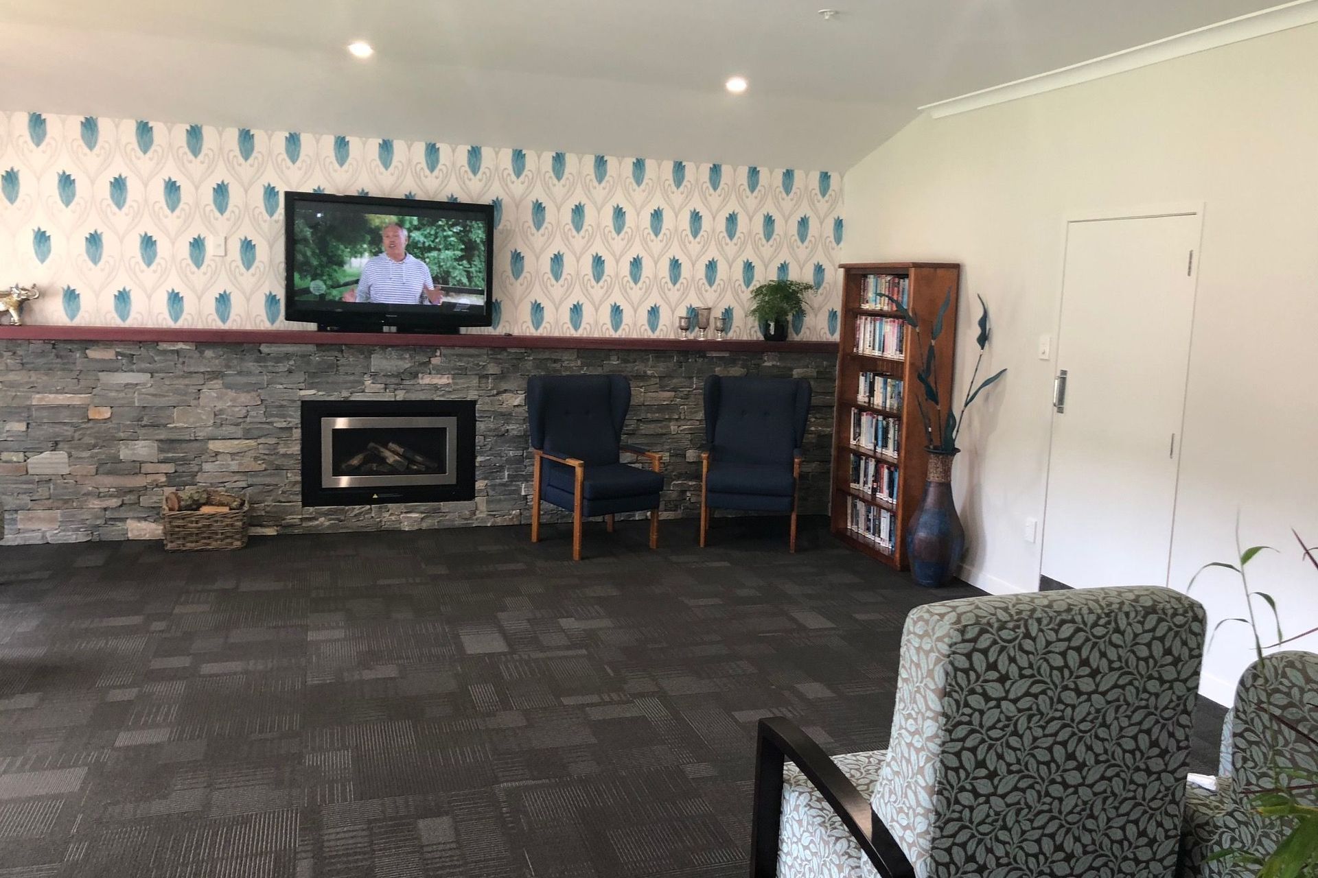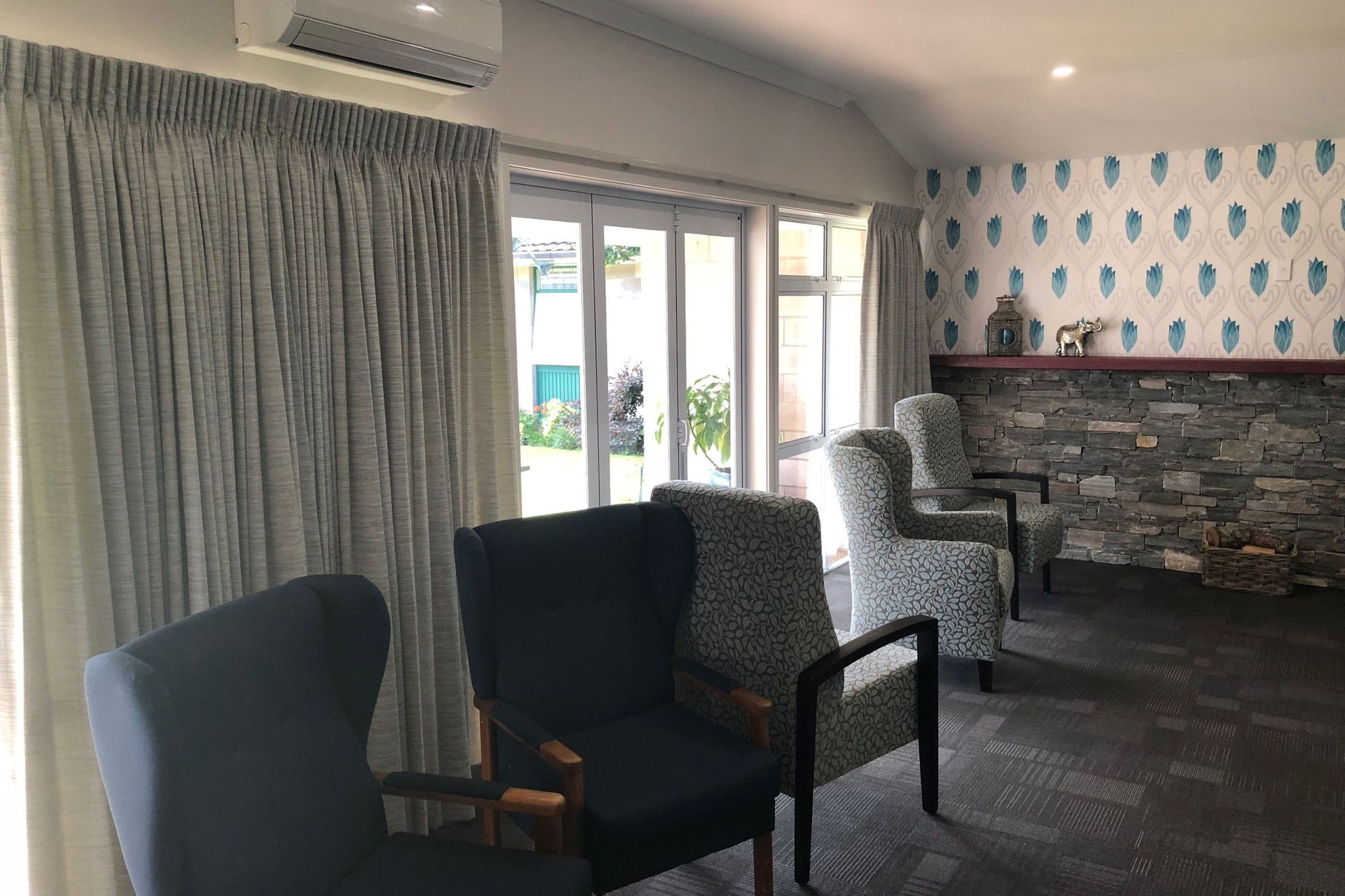 ArchiPro Project Summary - Renovation of the Selwyn Village Residents Lounge, transforming an outdated space into a bright and inviting area featuring a stone feature wall and fireplace, enhancing comfort and community for residents.