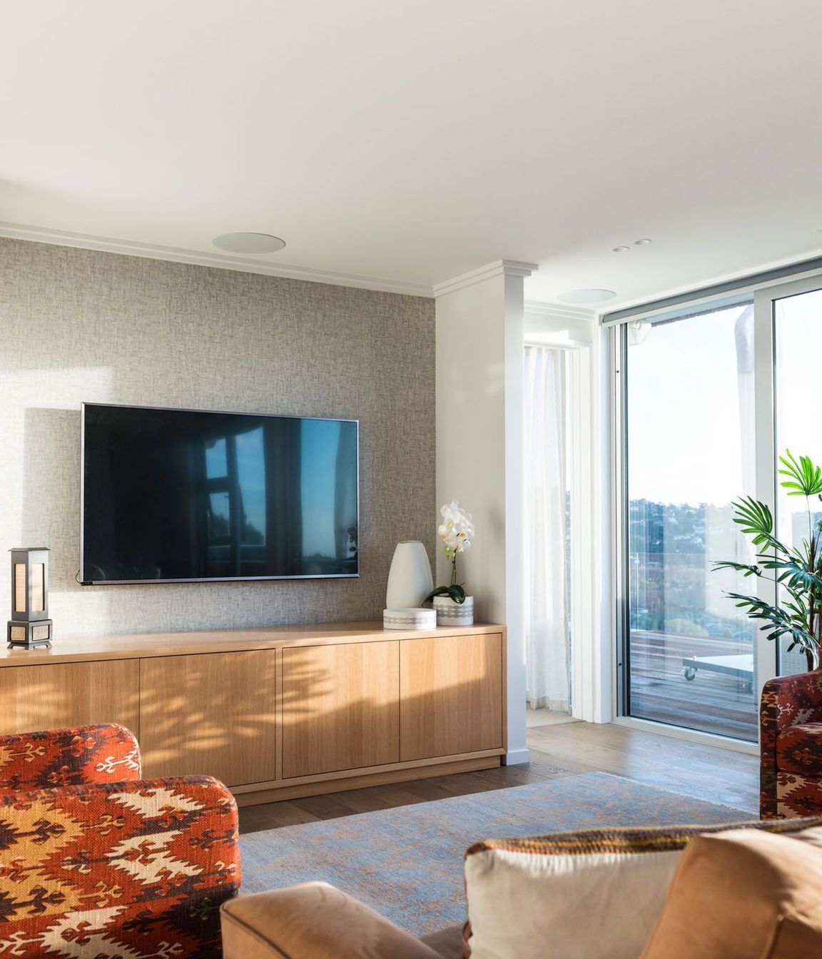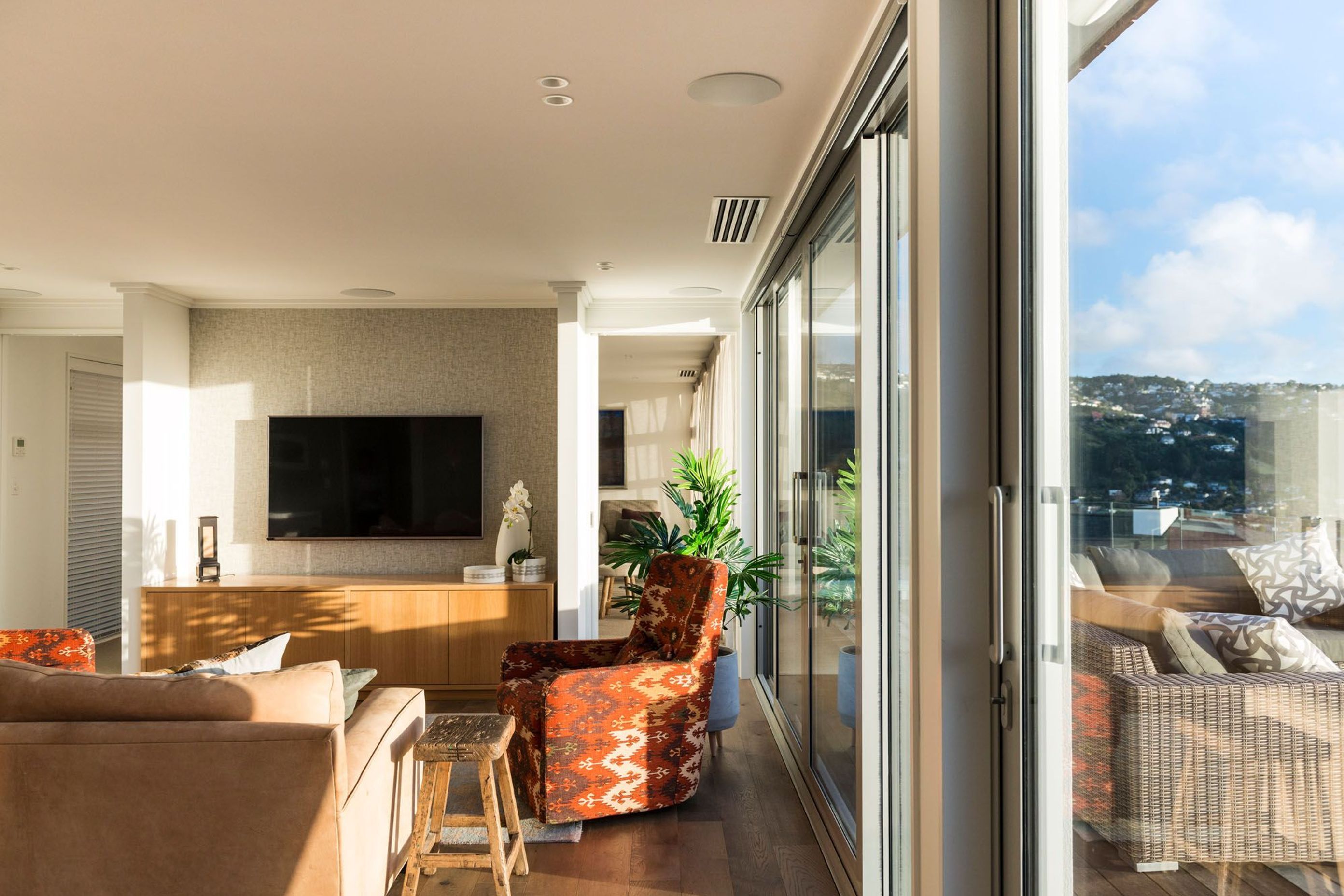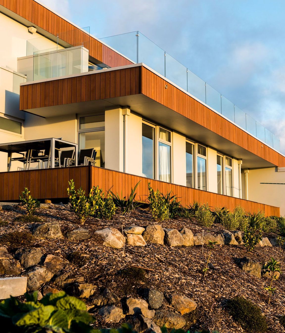 ArchiPro Project Summary - A stunning hillside home designed for optimal views of Christchurch and the Southern Alps, featuring seamless construction, a thoughtful layout, and expansive outdoor decks with frameless glass balustrades.