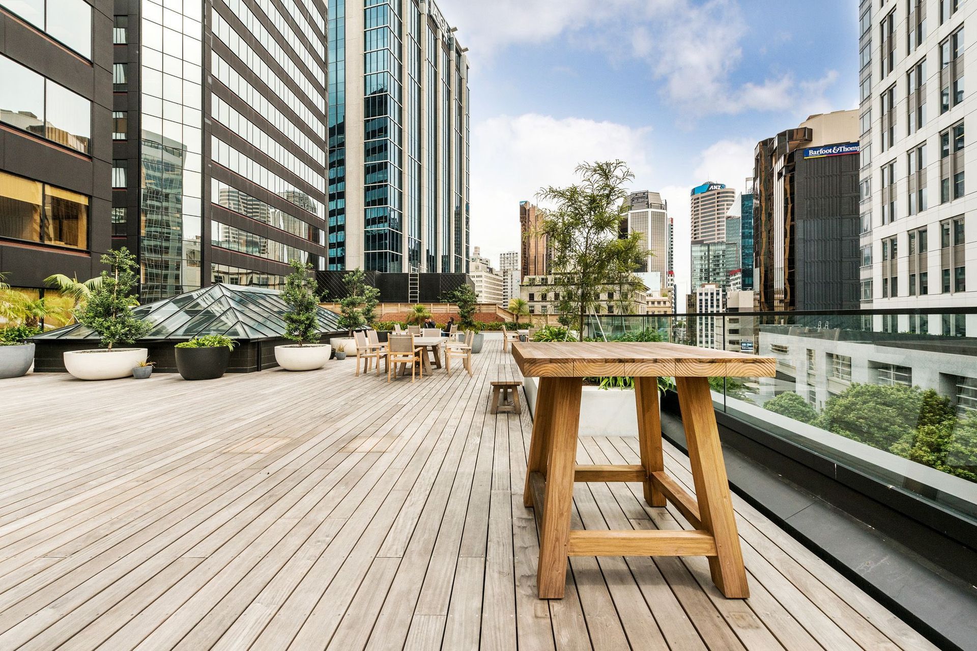ArchiPro Project Summary - A modern architectural oasis at Level 7, 55 Shortland Street, completed in 2017, featuring a contemporary deck refurbishment and tropical-themed pergola that enhances outdoor experiences for tenants in a mixed-use environment.