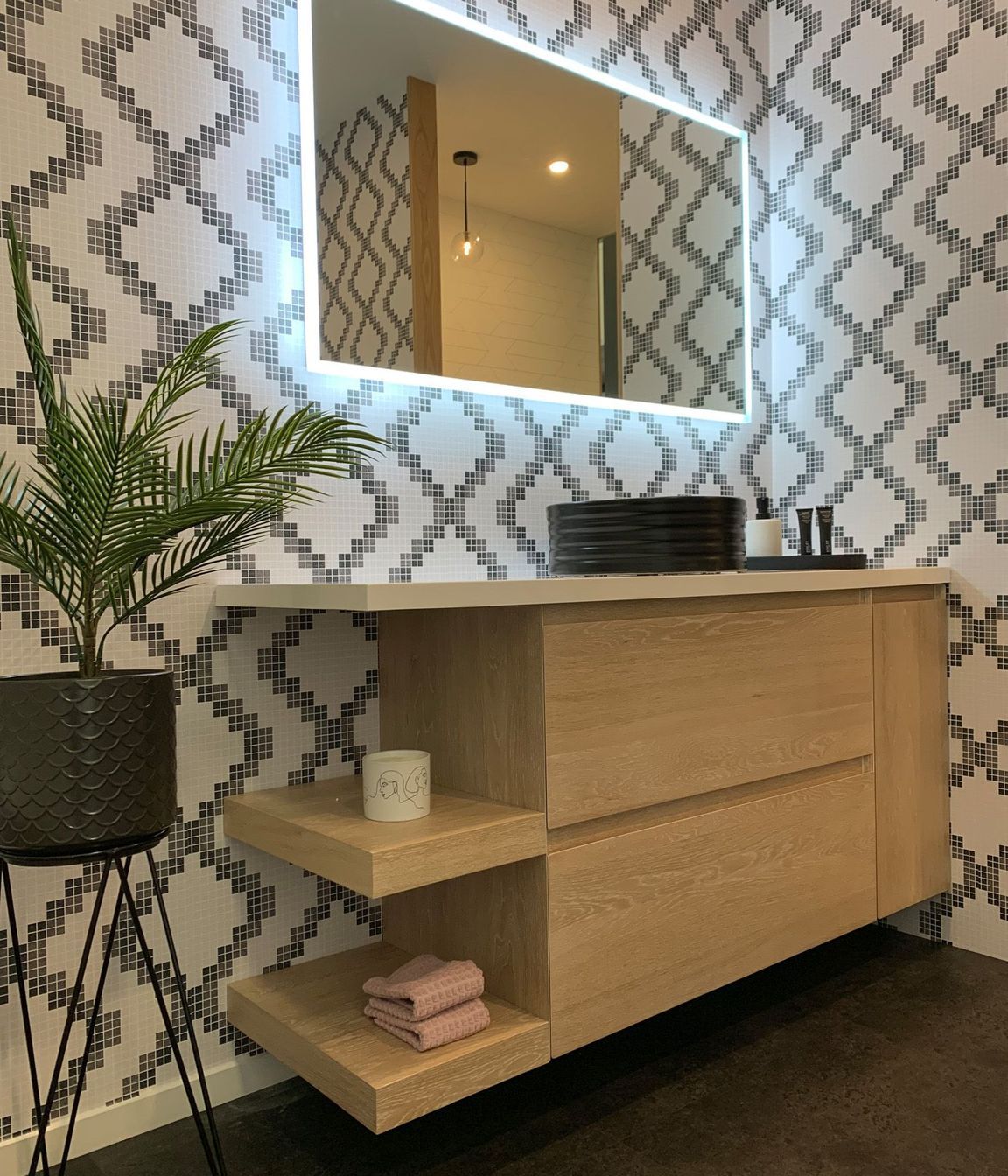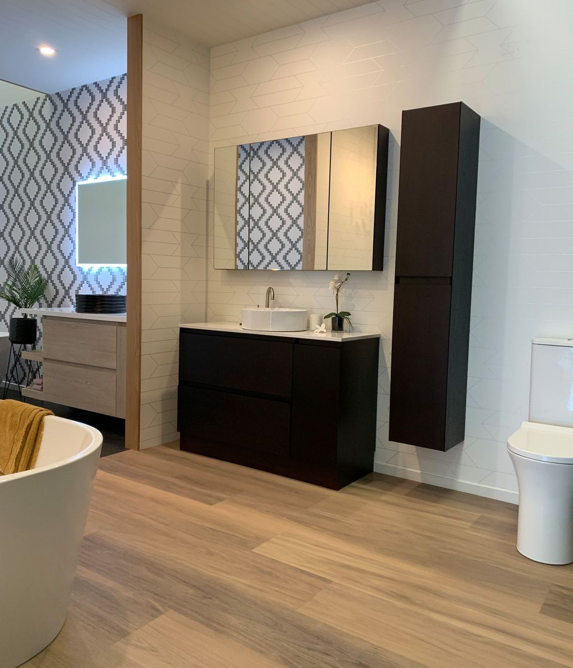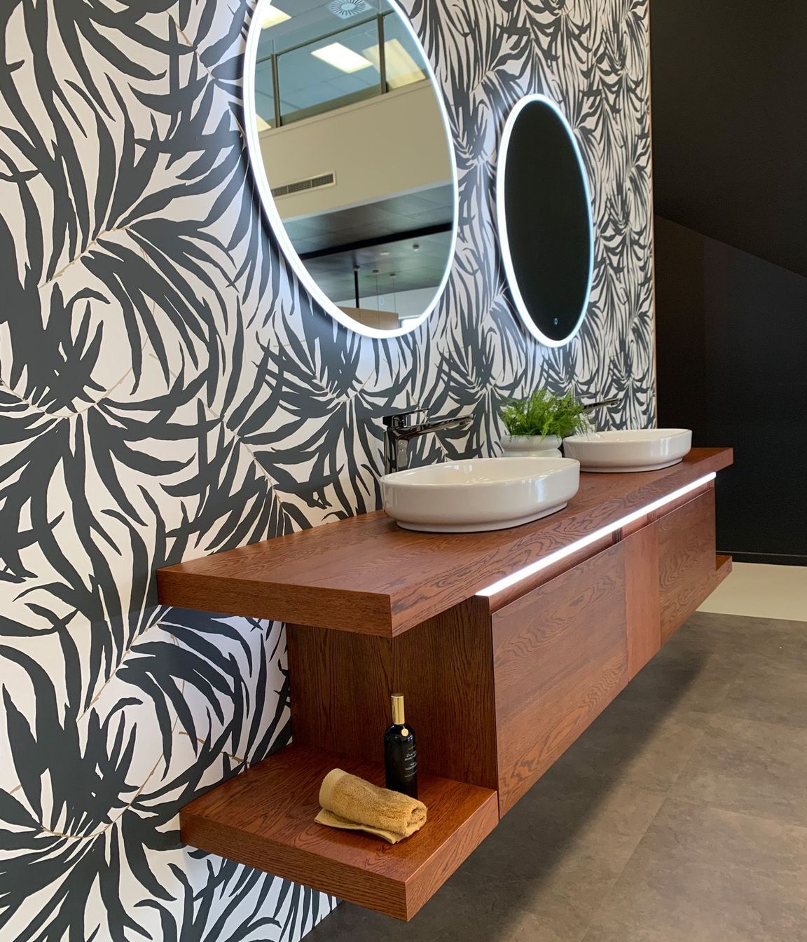 ArchiPro Project Summary - A modern showroom bathroom design that combines functionality and aesthetics with innovative storage solutions and elegant finishes.