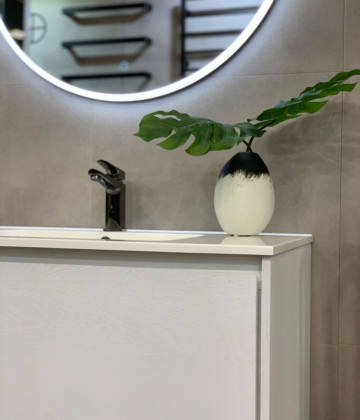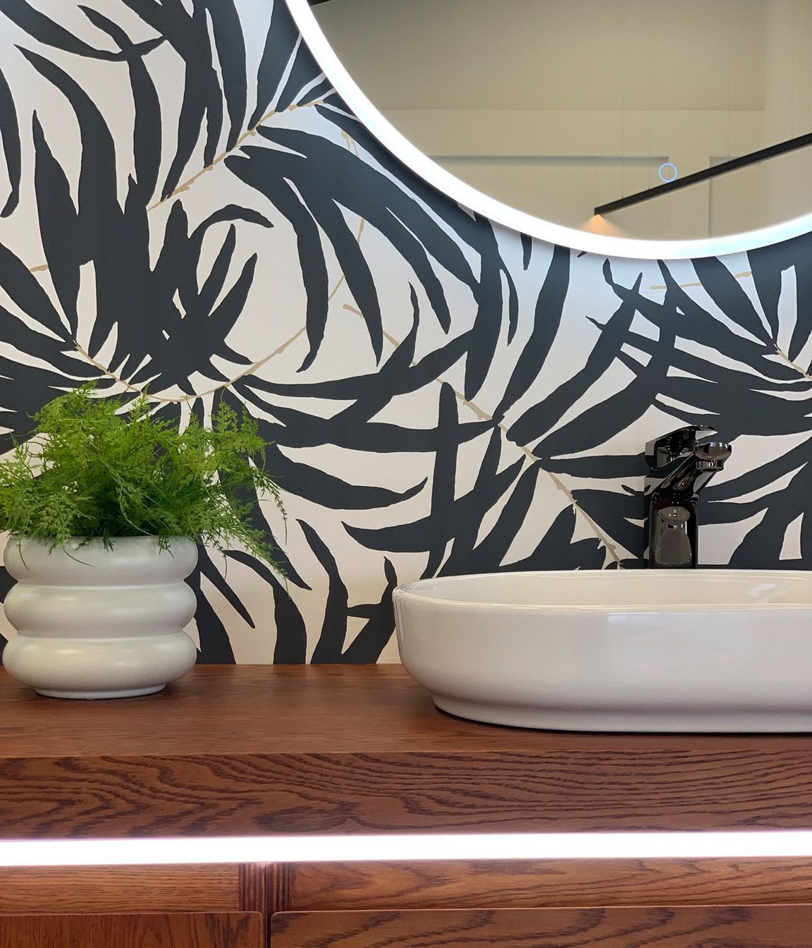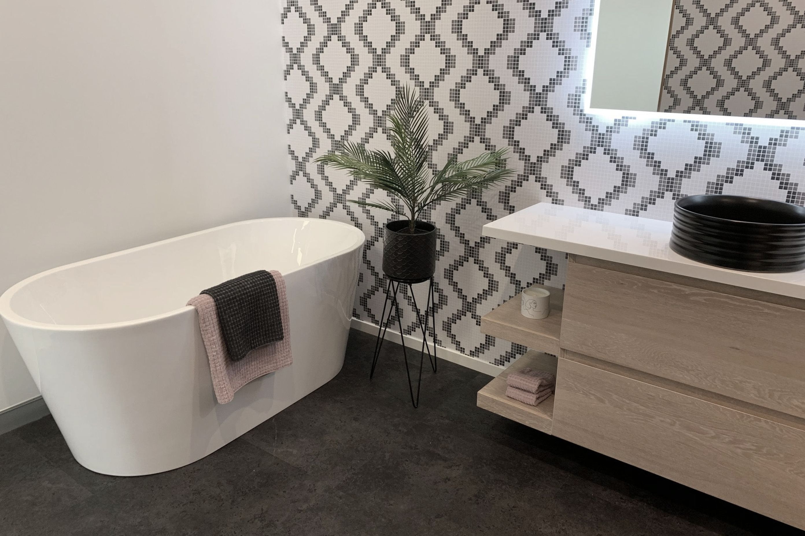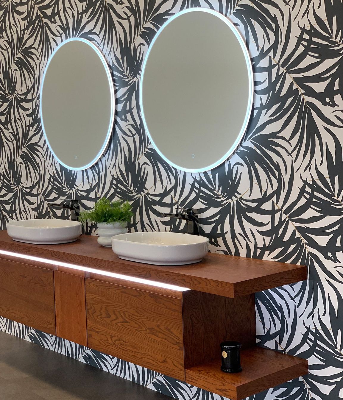 ArchiPro Project Summary - A modern showroom bathroom design that combines functionality and aesthetics with innovative storage solutions and elegant finishes.