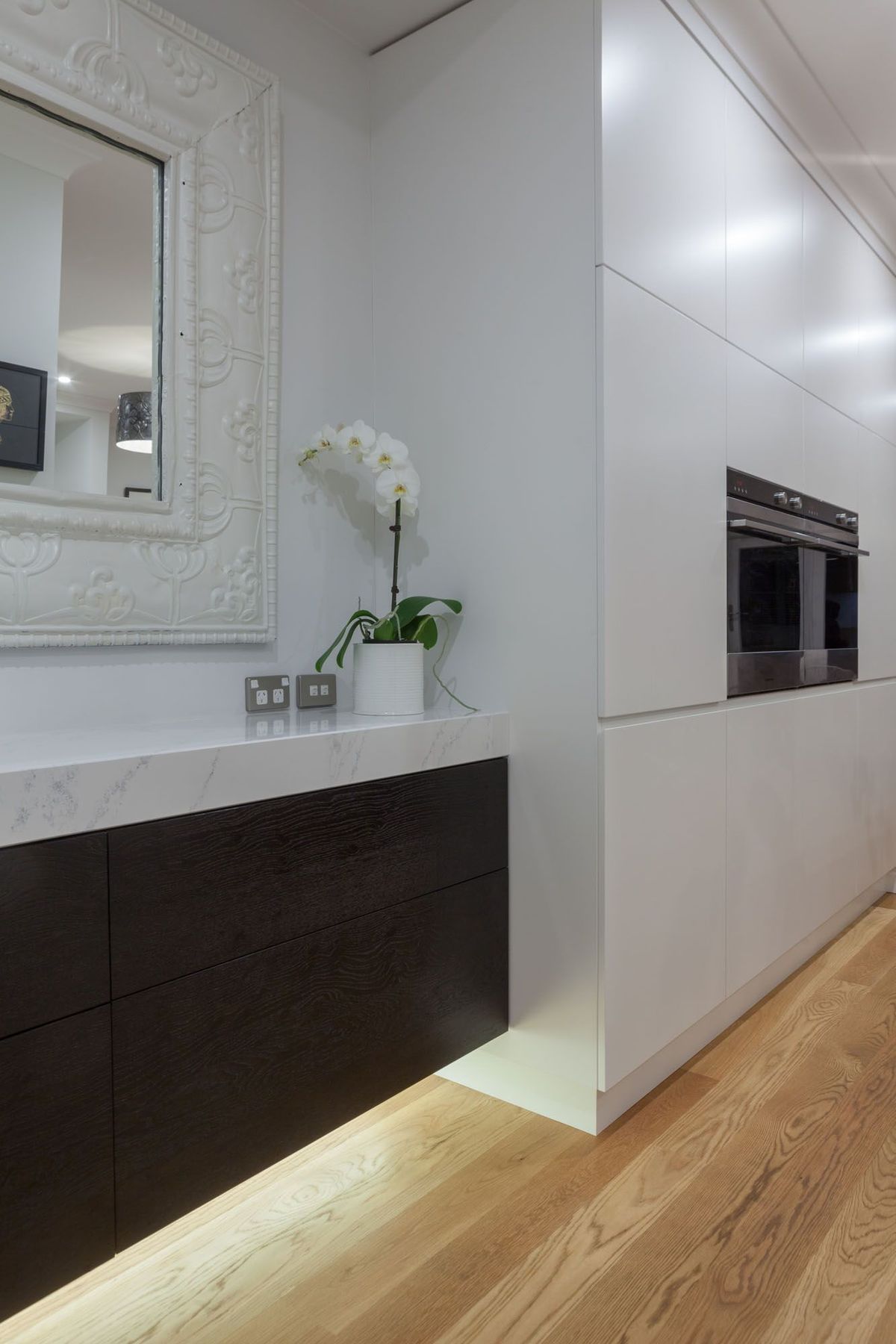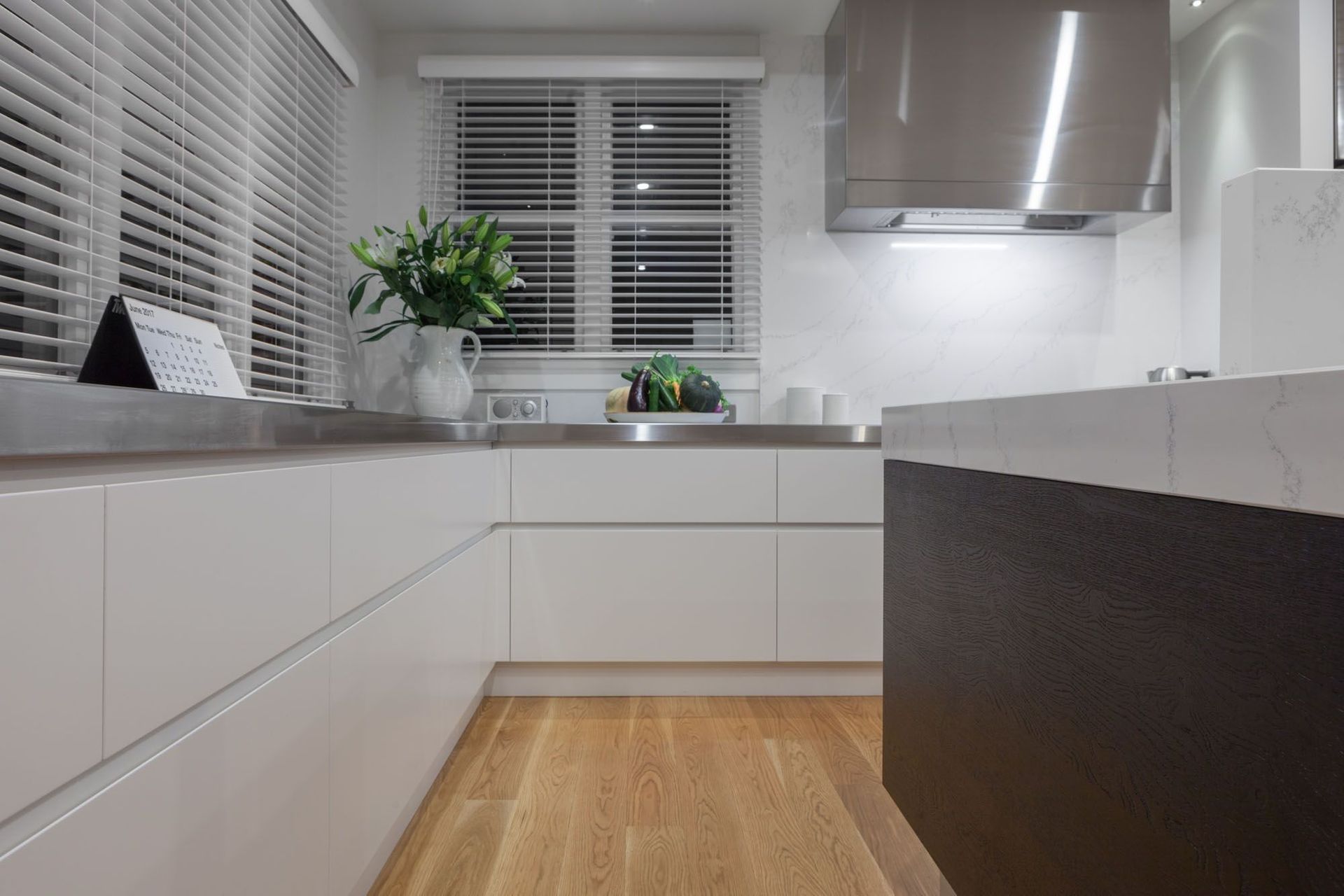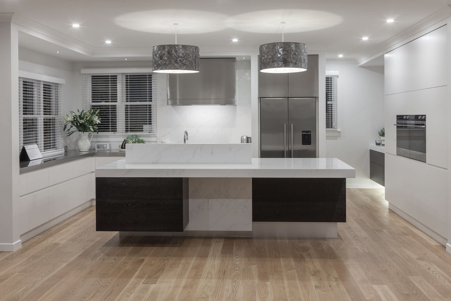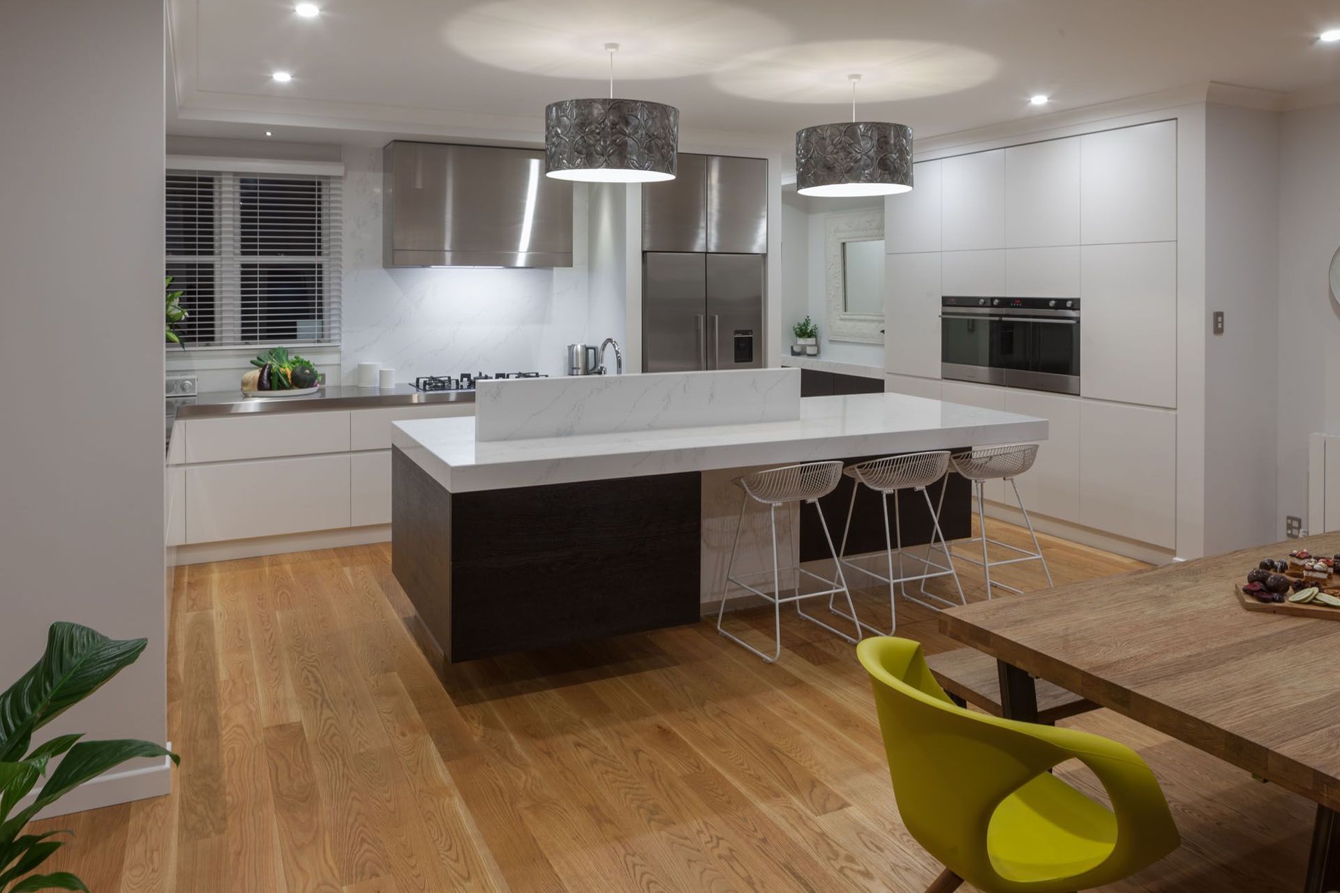 ArchiPro Project Summary - A thoughtfully designed kitchen in a renovated 1950s home, featuring ample storage, dual ovens, and a unique asymmetric island with layered upstand, blending stone, timber veneer, and stainless steel for a timeless aesthetic.