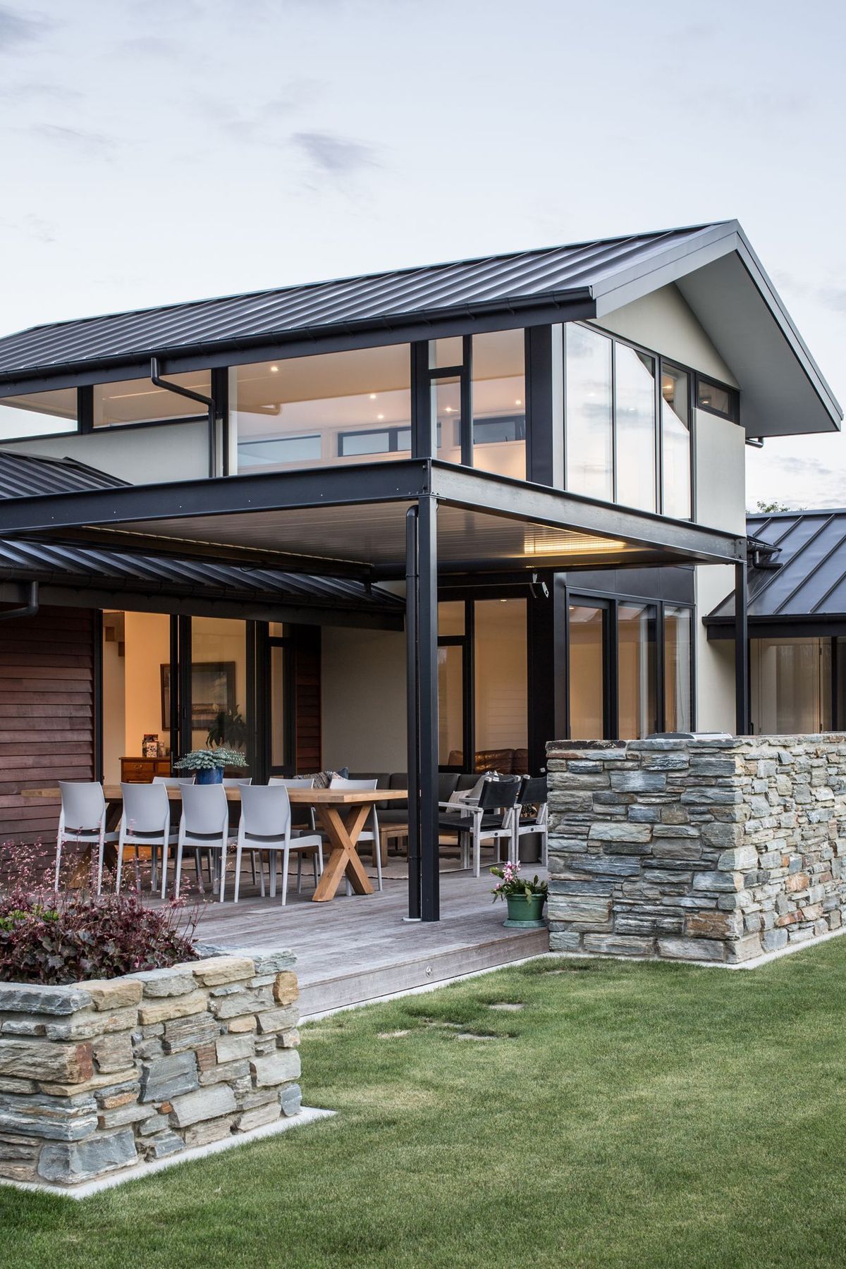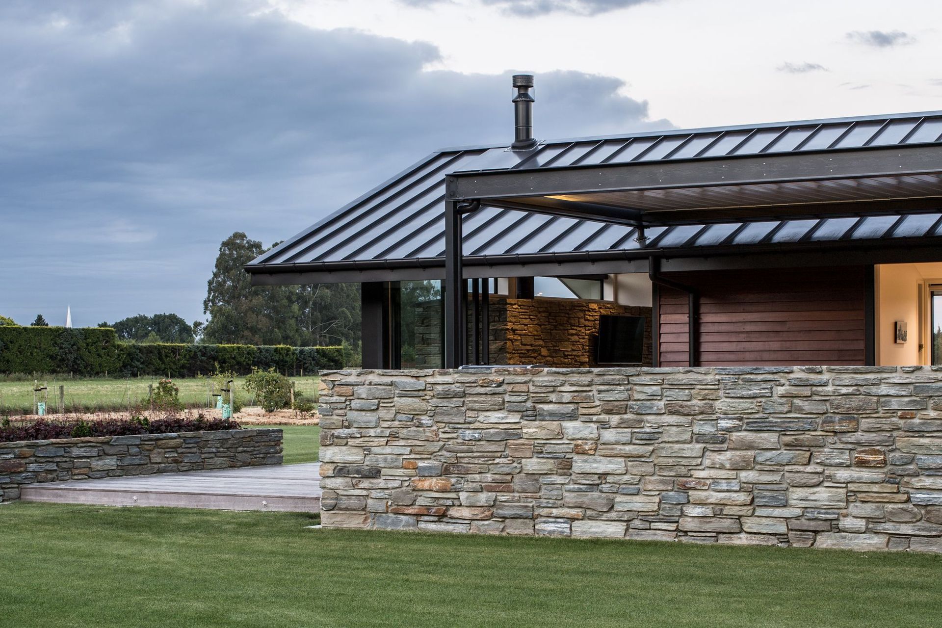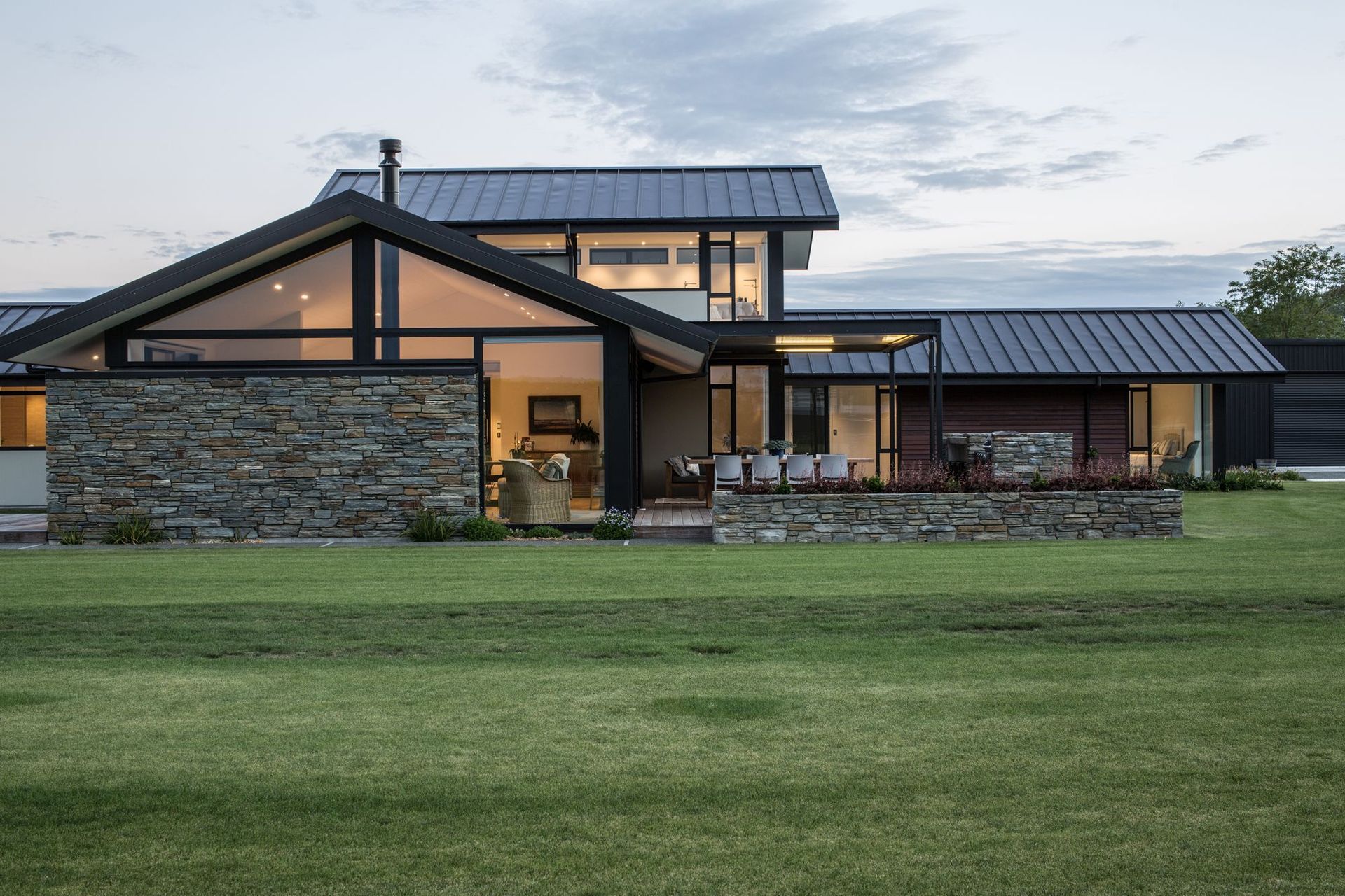 ArchiPro Project Summary - A stunning rural-inspired home in town, featuring breathtaking mountain views, a harmonious blend of Schist, Plaster, and Cedar, and a semi-enclosed outdoor area perfect for relaxation and entertaining.