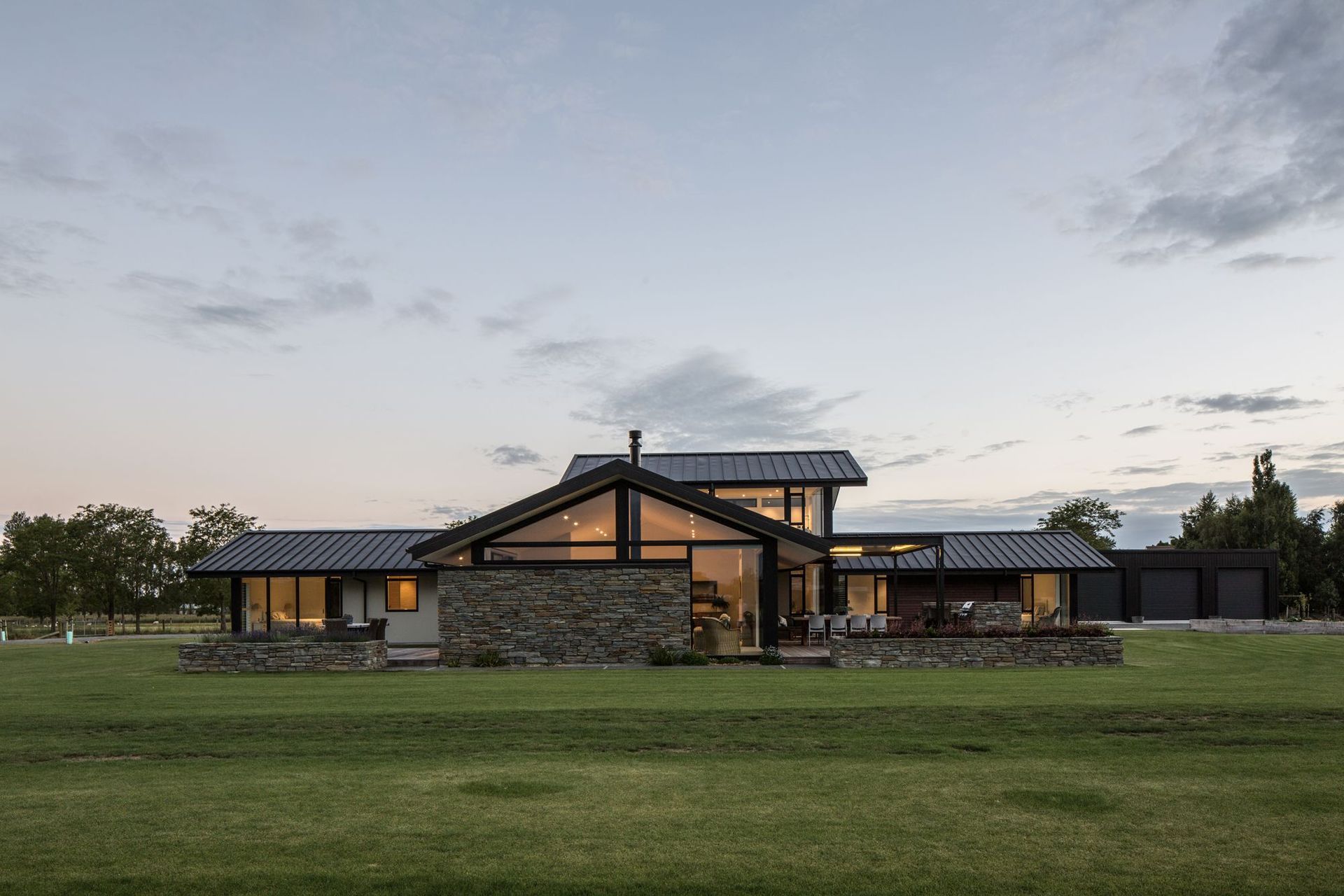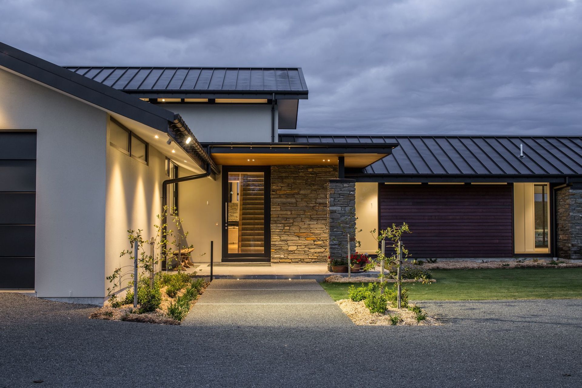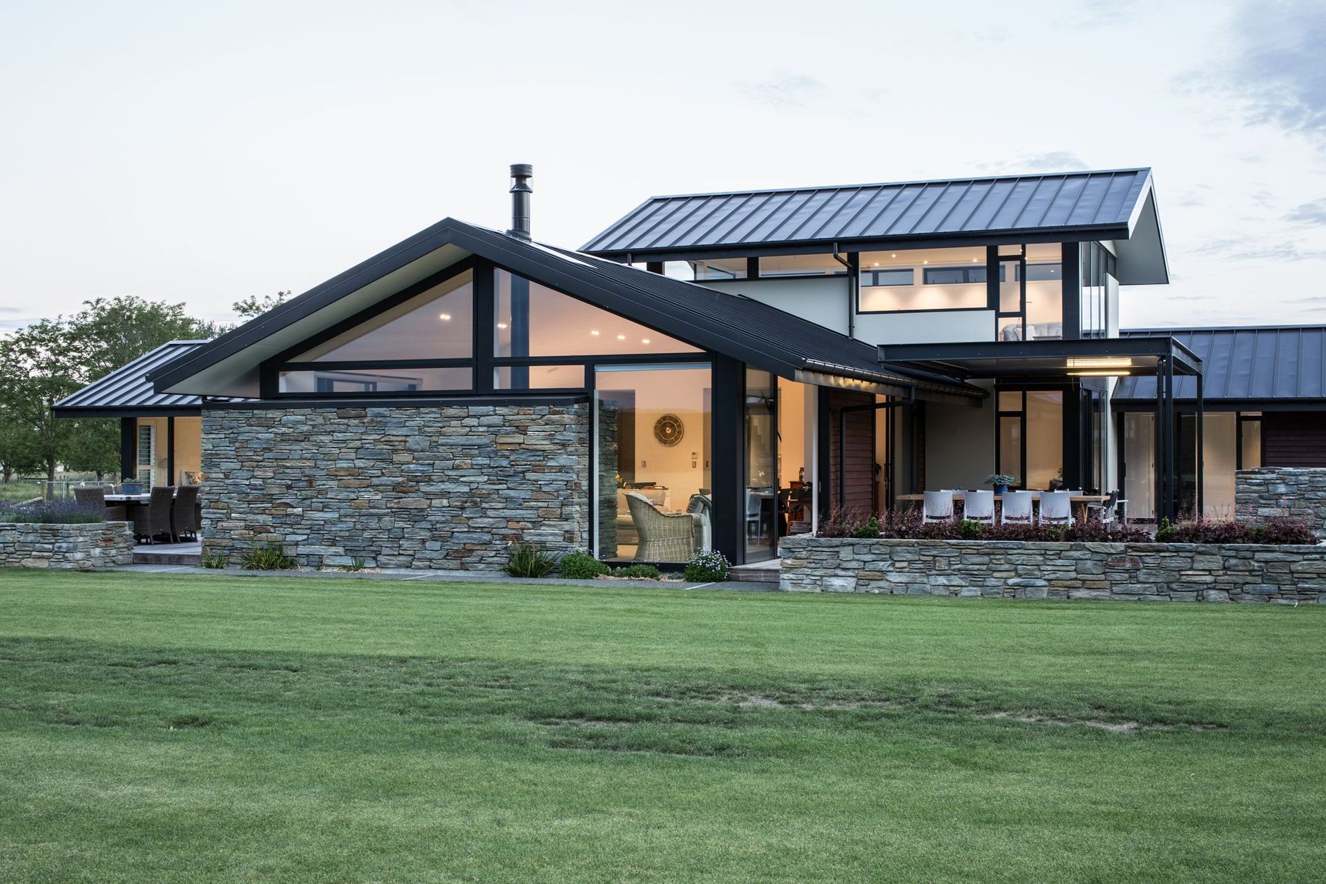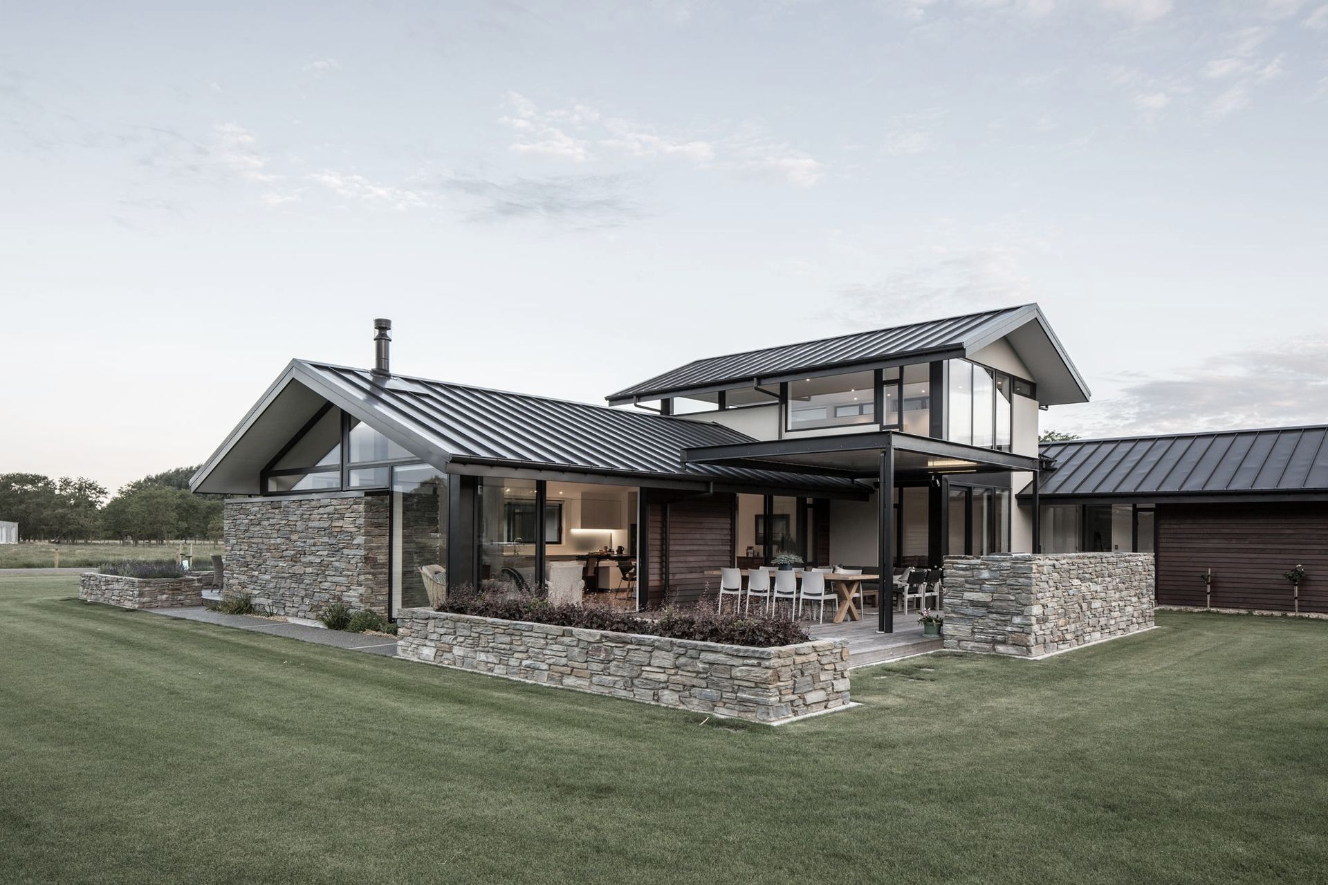 ArchiPro Project Summary - A stunning rural-inspired home in town, featuring breathtaking mountain views, a harmonious blend of Schist, Plaster, and Cedar, and a semi-enclosed outdoor area perfect for relaxation and entertaining.