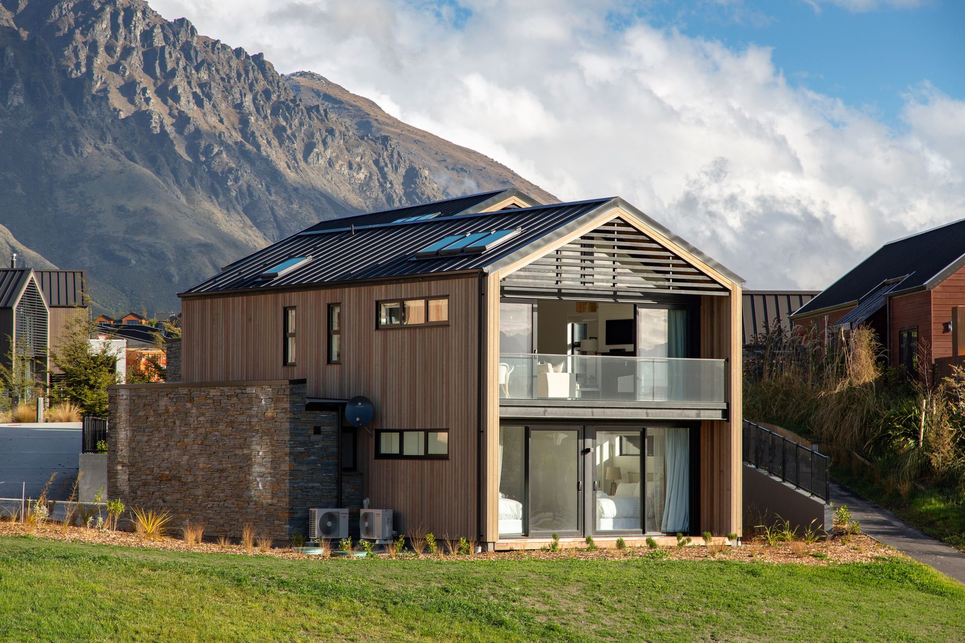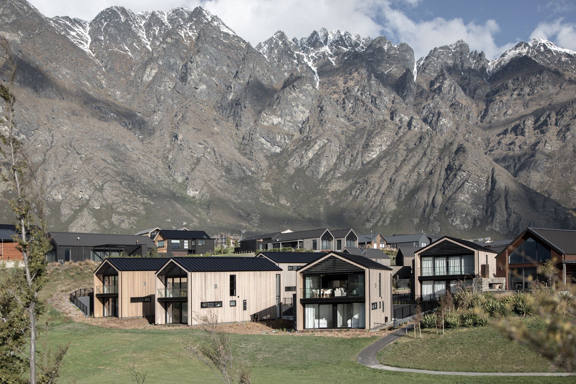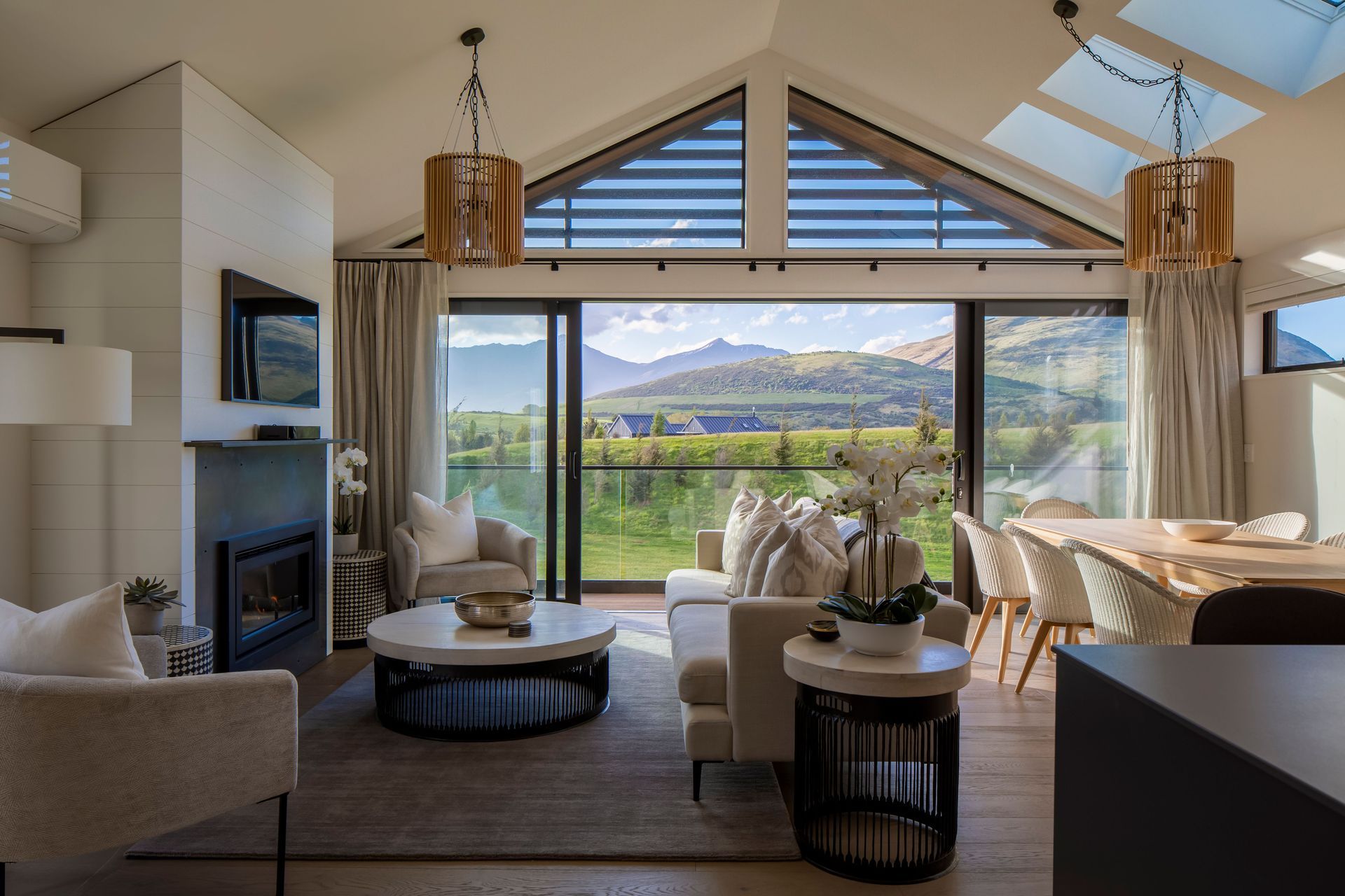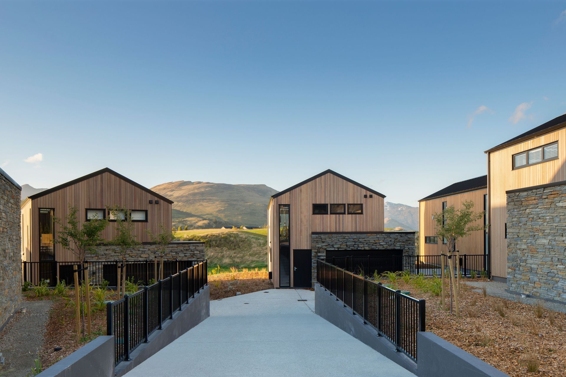 ArchiPro Project Summary - Six Villas at Jacks Point, Queenstown, designed for effortless living with remote-controlled heating and garden water systems, featuring native landscaping and no lawn for a perfect holiday retreat.