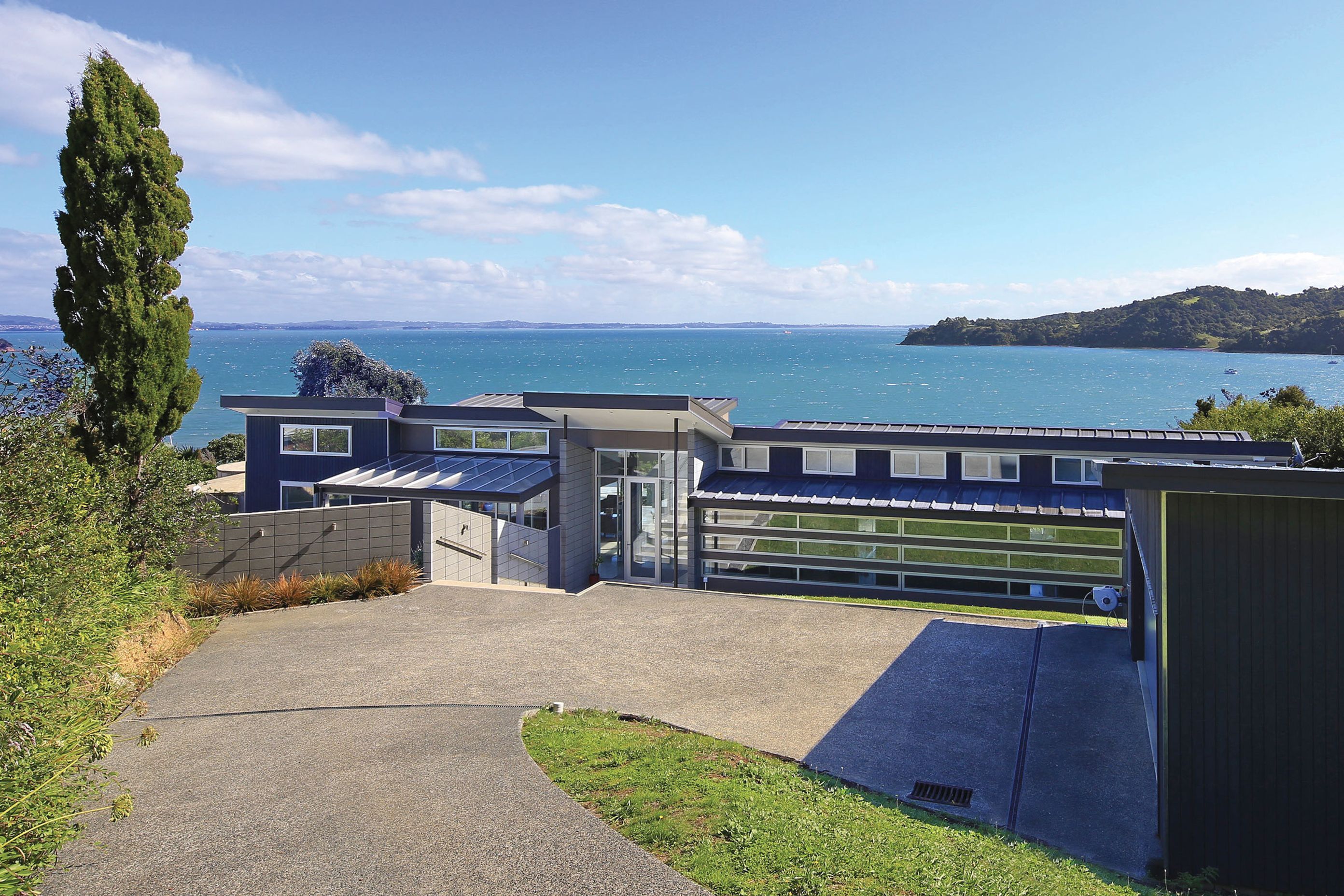 ArchiPro Project Summary - A contemporary four-bedroom home on Waiheke Island, featuring a striking Solar-Rib® roof design by Lapp & Toft Architecture, optimized for sea views and passive solar efficiency, with elegant outdoor spaces and sustainable heating solutions.