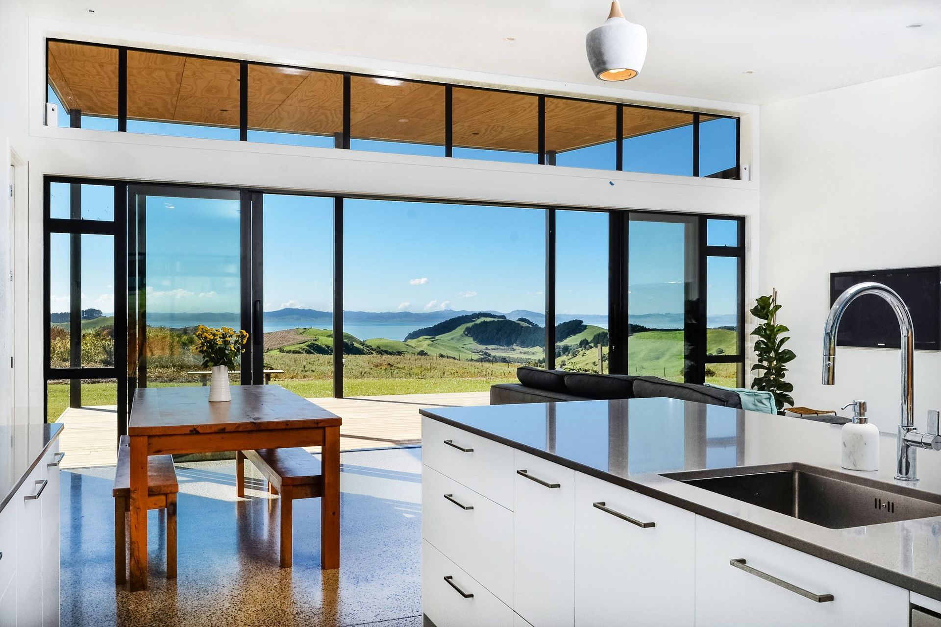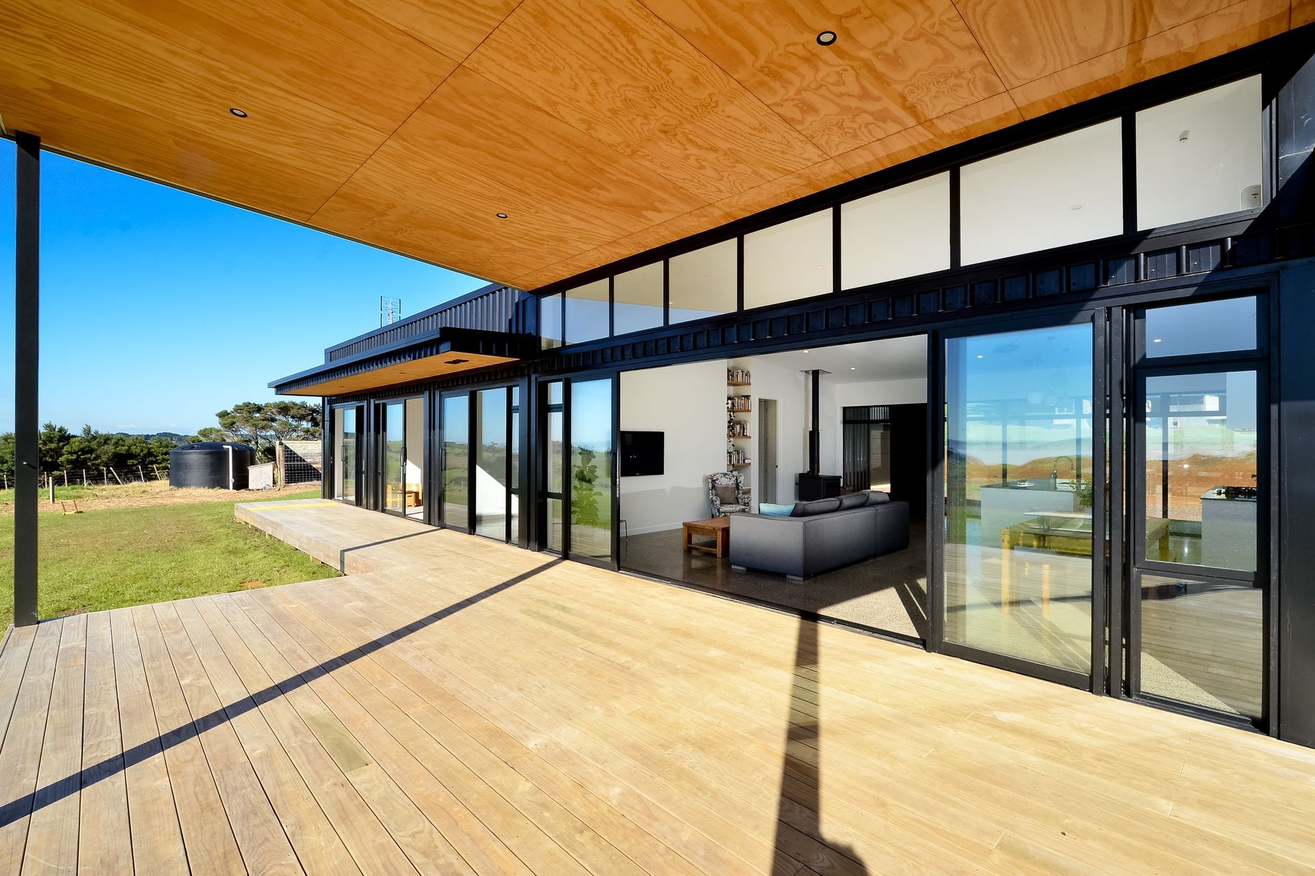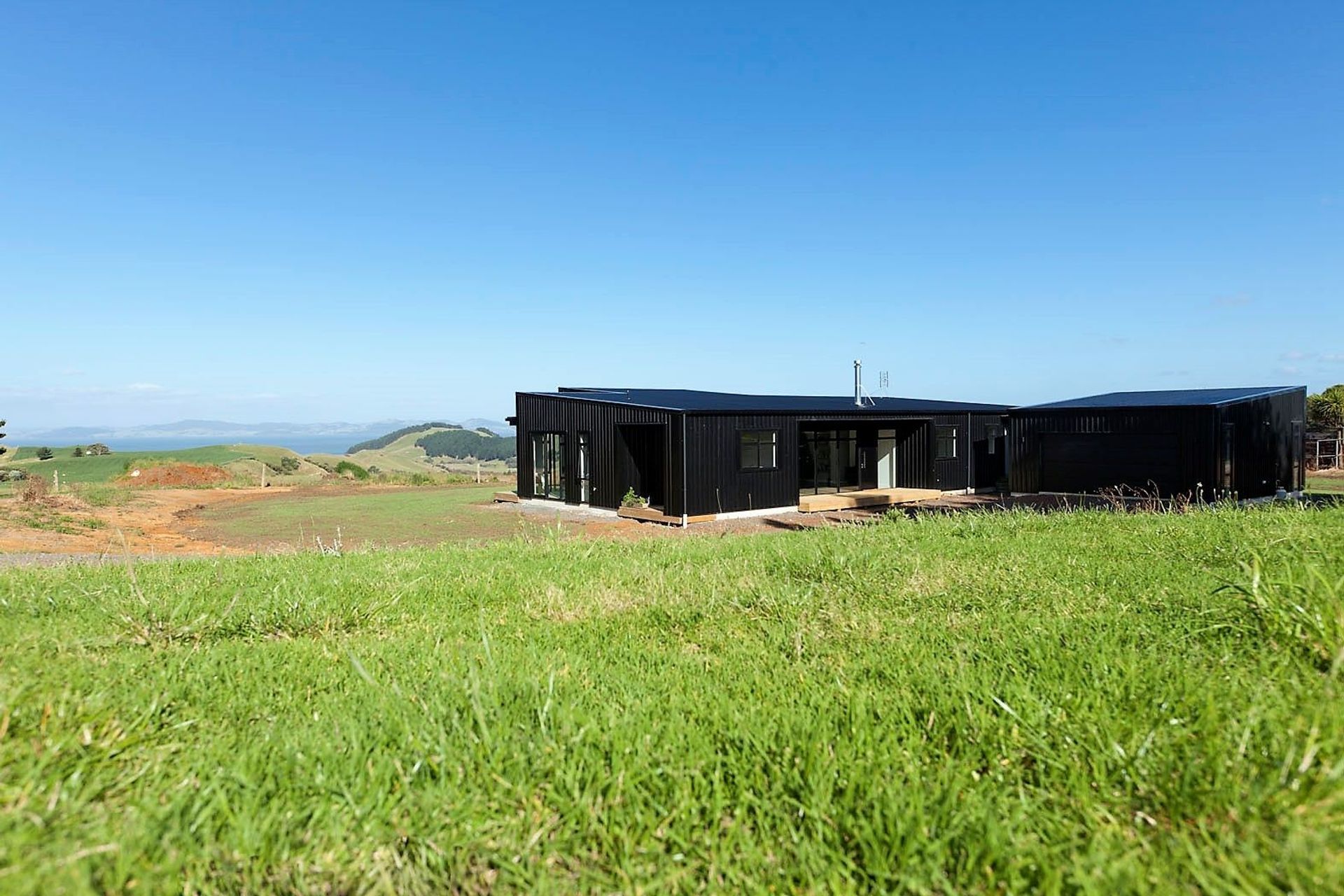 ArchiPro Project Summary - Award-winning 5-bedroom home in South Head, Auckland, featuring a striking black iron exterior, polished floors, expansive sliding doors, and an eco-friendly heating system, all while offering stunning views of the Kaipara Harbour.