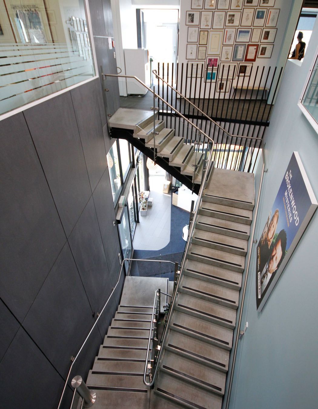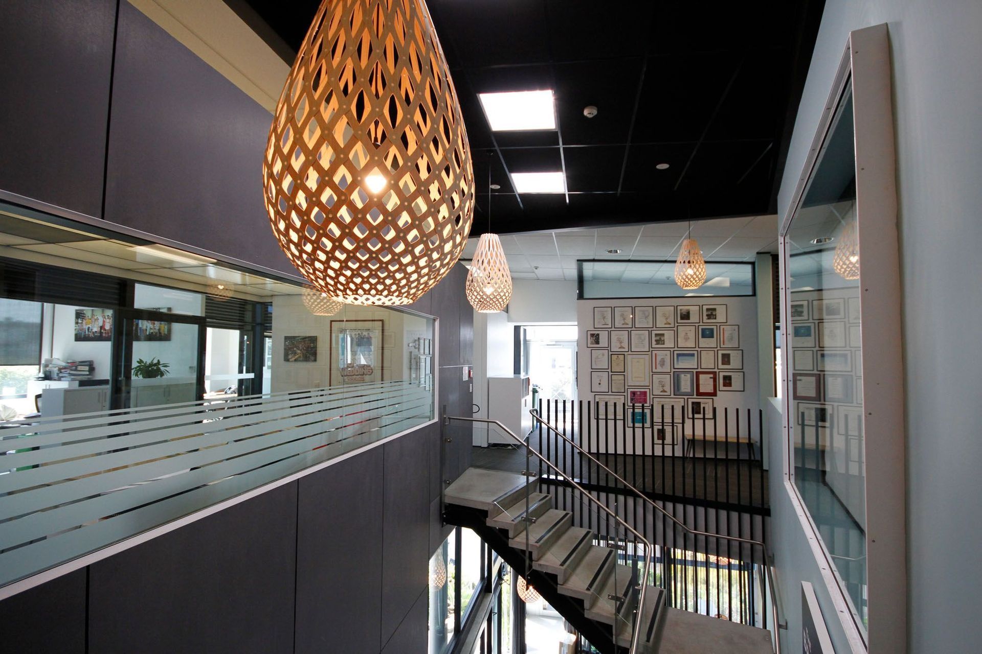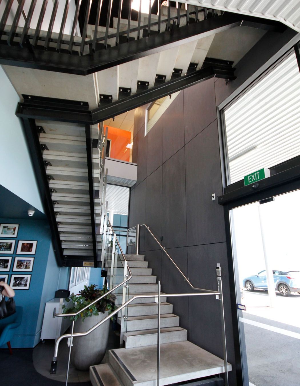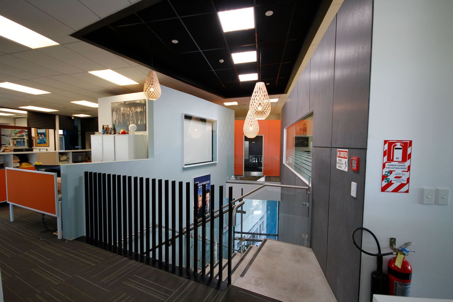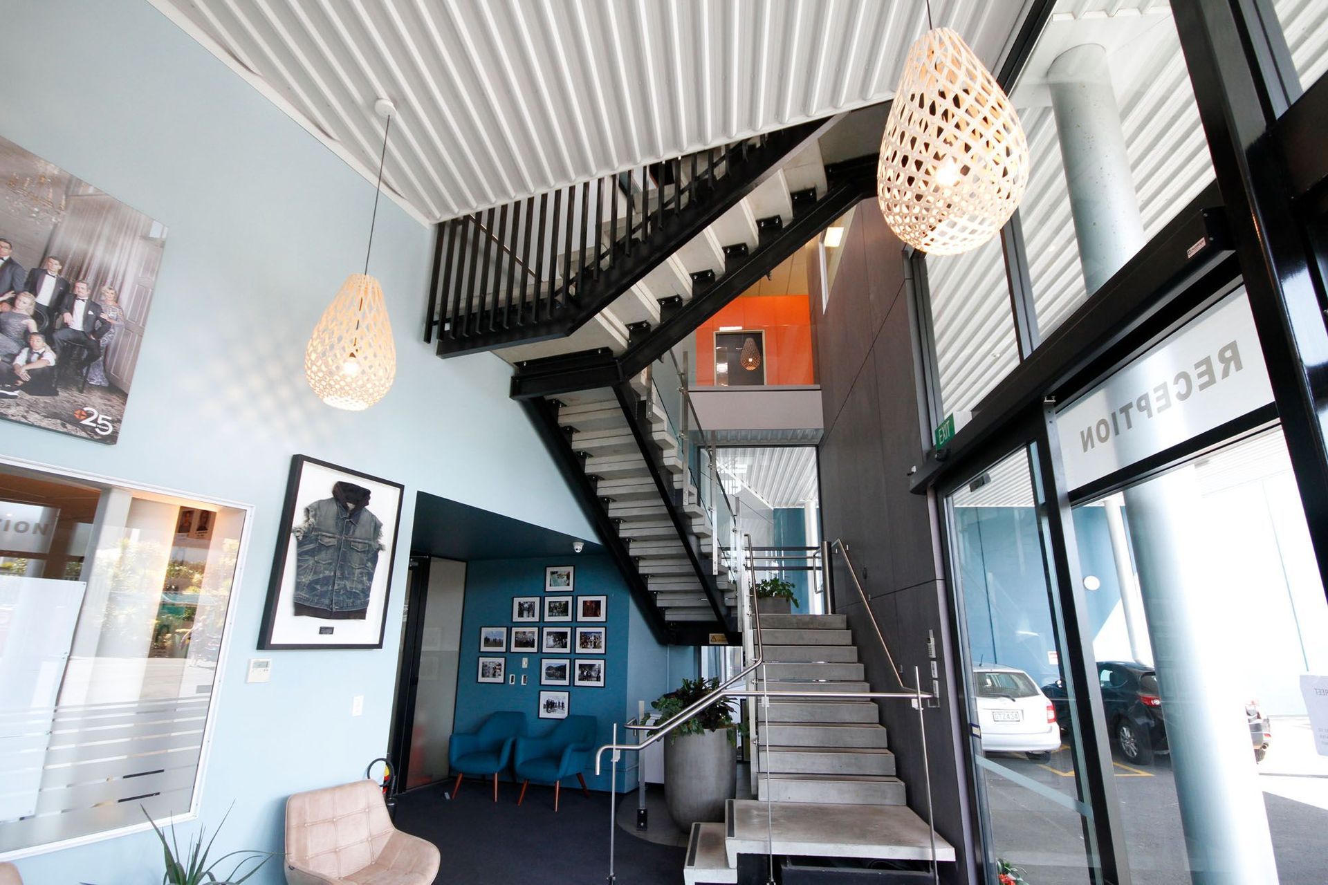 ArchiPro Project Summary - Expansion of South Pacific Pictures with a new open plan administration workspace featuring a grand staircase and large windows, completed amidst a live film set environment.