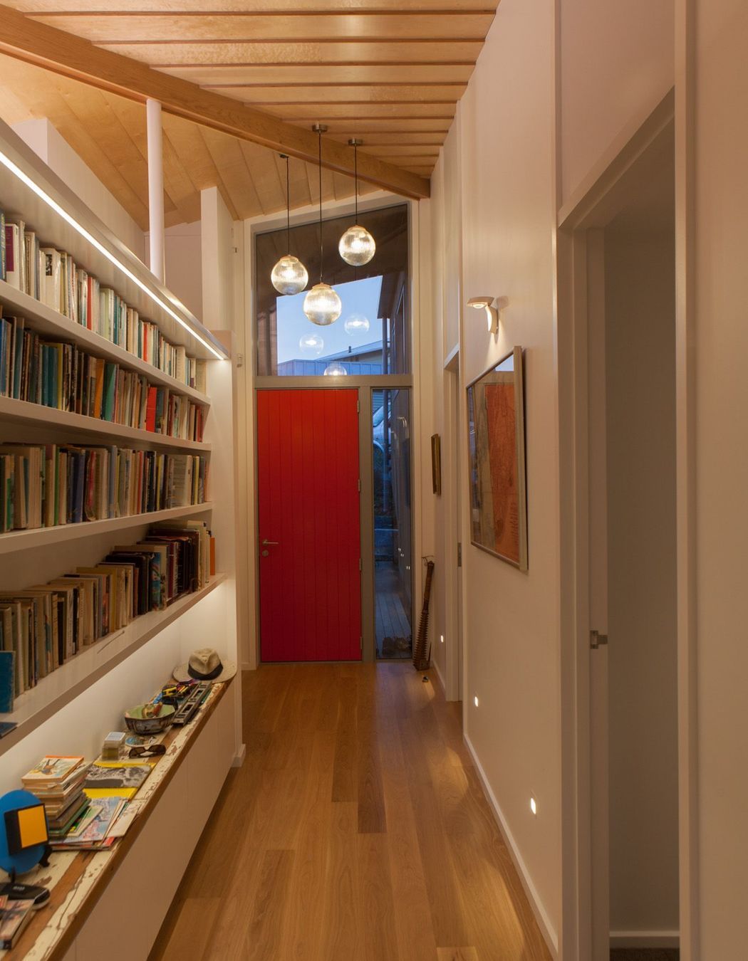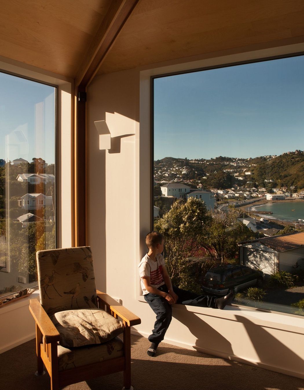 ArchiPro Project Summary - A sculptural residence in Island Bay, Spitaki House features a rippled ply ceiling and greyed cedar cladding, designed to embrace sunlight and coastal views while providing intimate spaces for art and family gatherings.